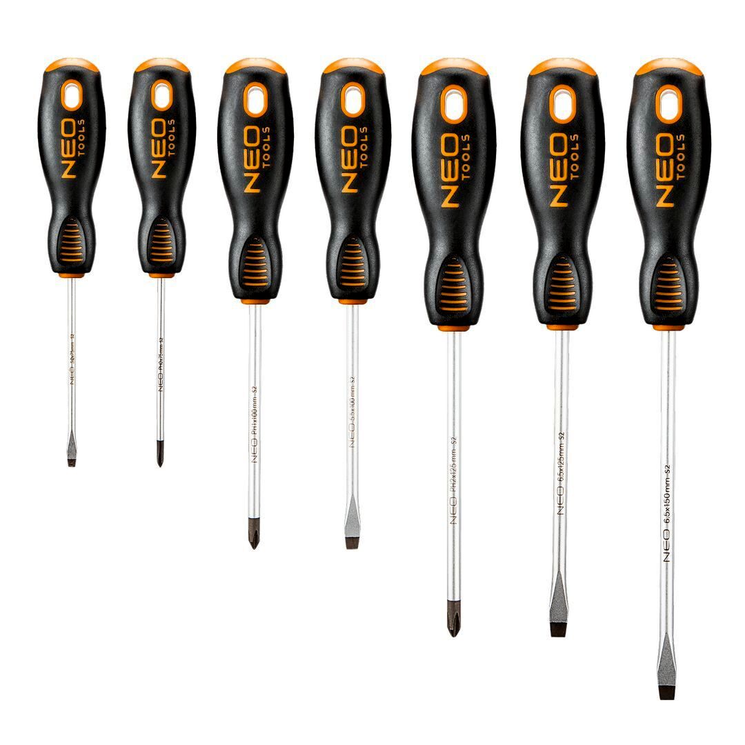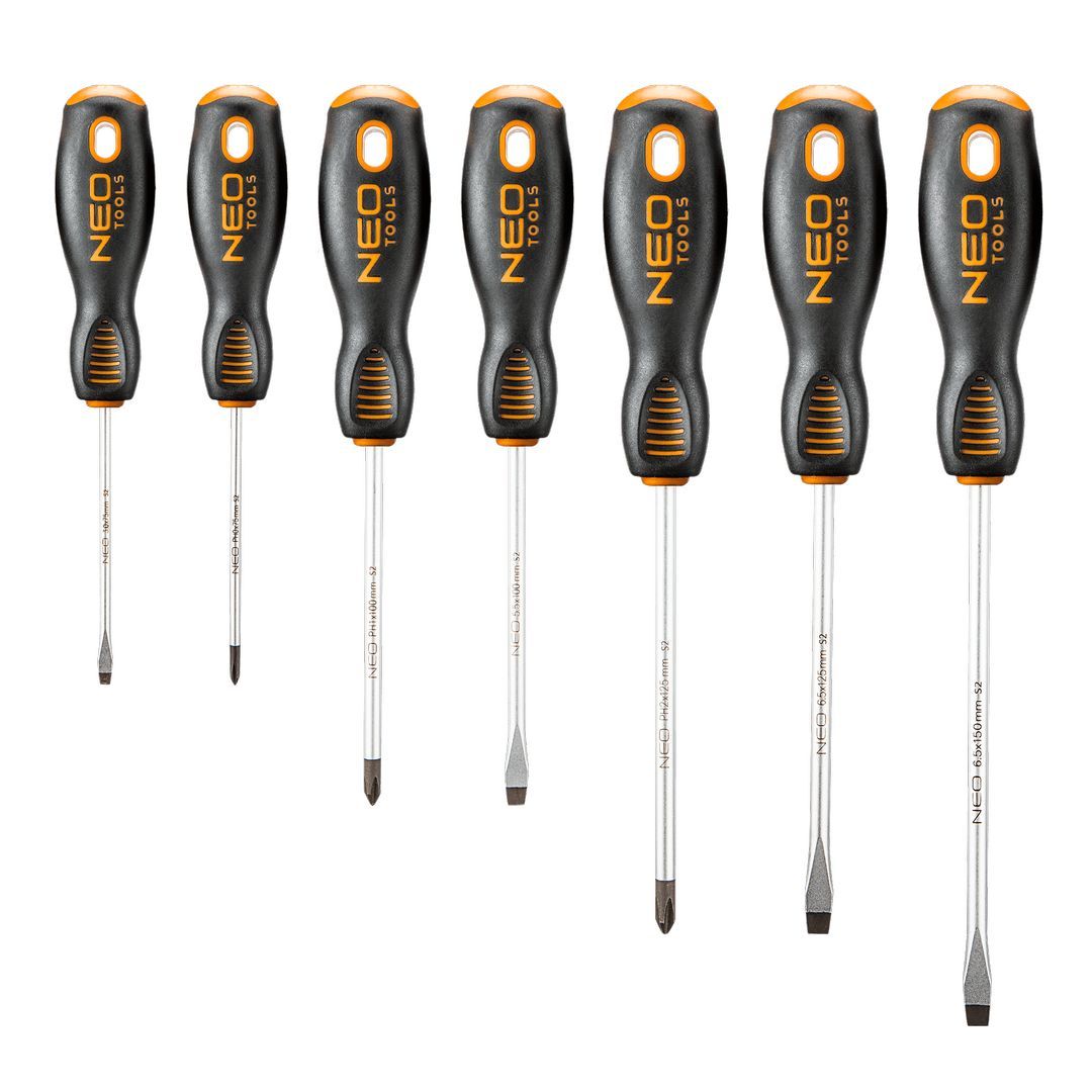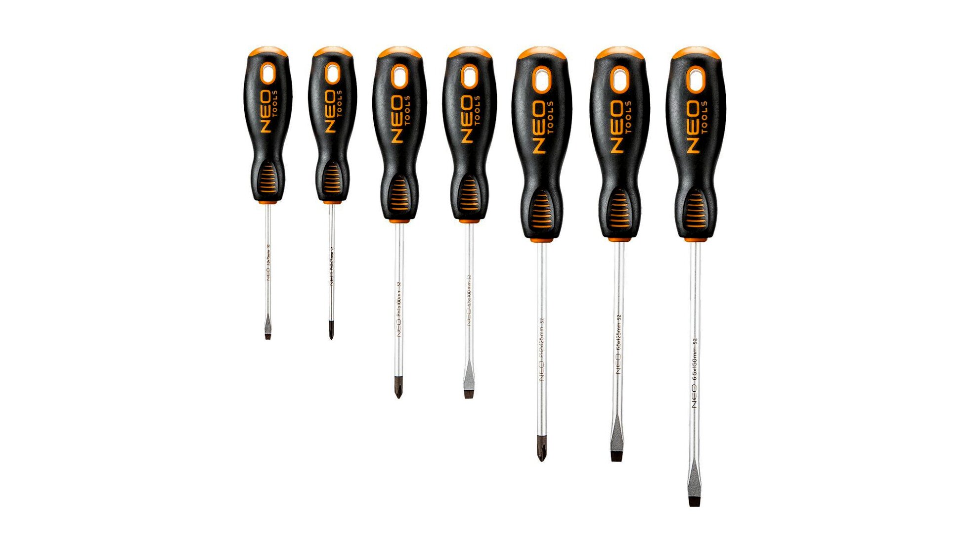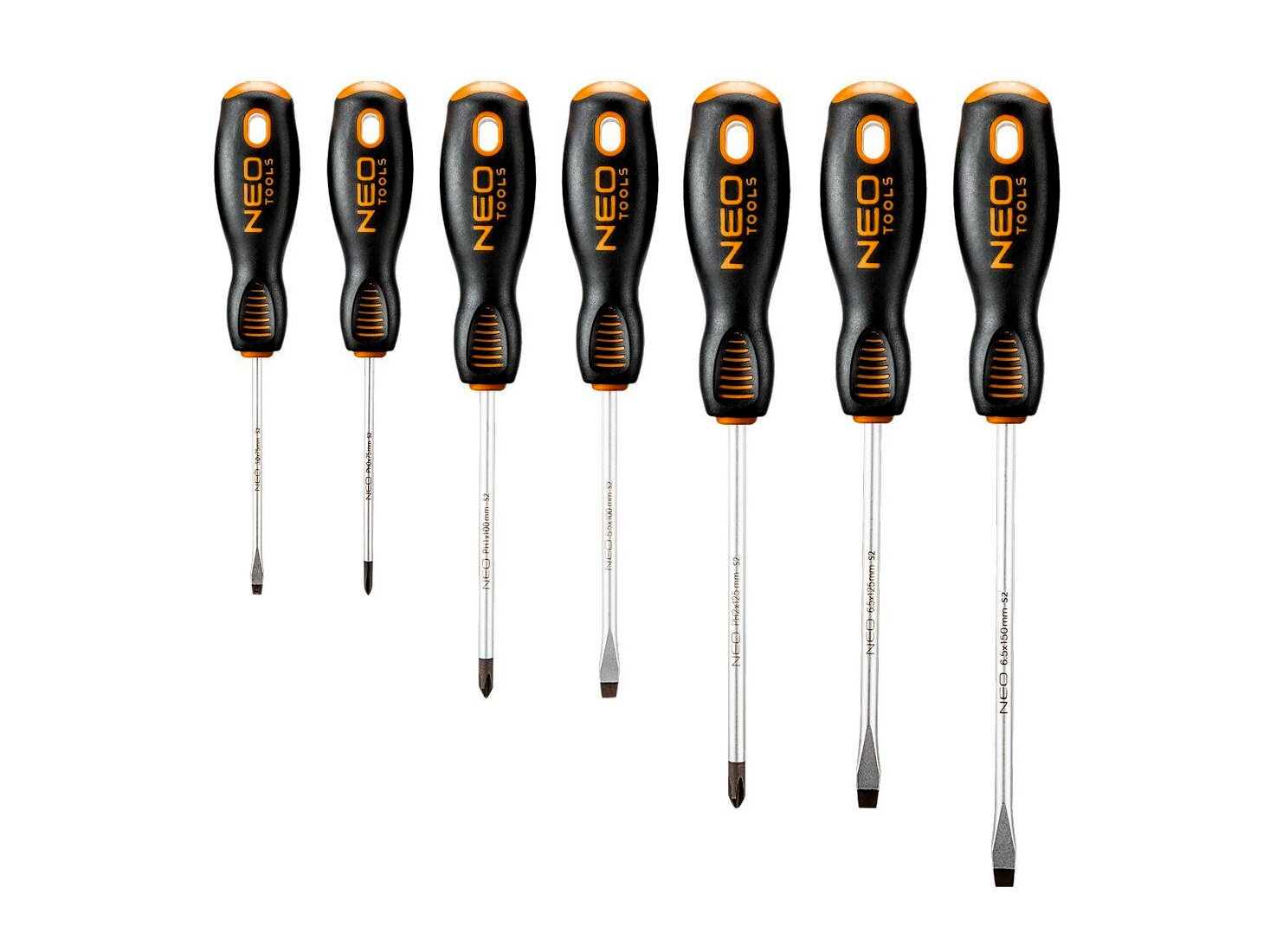 A NEO csavarhúzó szett (kat. sz.: 04- 206) 7 db csavarhúzóból áll: lapos és kereszt csavarhúzókból. A csavarhúzó szára kivételesen erős S2 acélból készül. A csavarhúzó hegy hőkezelésnek lett alávetve, így megfelelő keménységet és hajlítószilárdságot ért el. A csavarhúzó hegye mágneses. A markolat három élű hasáb alakja a kialakított hüvelyktámasszal csökkenti a kéz megterhelését munka közben, és megkönnyíti a megfelelő forgatónyomaték elérését. A bimateriál markolat nem csúszik ki a kézből, ellenálló vegyszerek, kenőolajok és zsírok hatásának. A szerszám minőségét bizonyítja a gyártó által nyújtott 25 éves jótállás. A NEO márka a professzionális igényeket is kielégíti.
