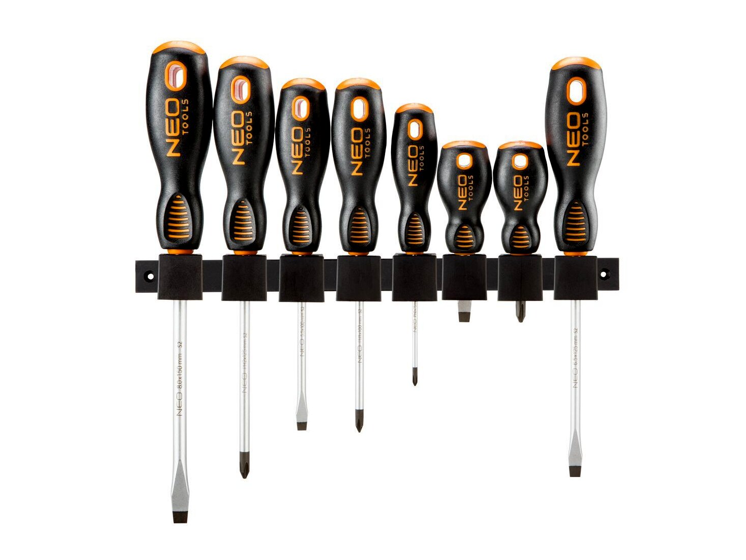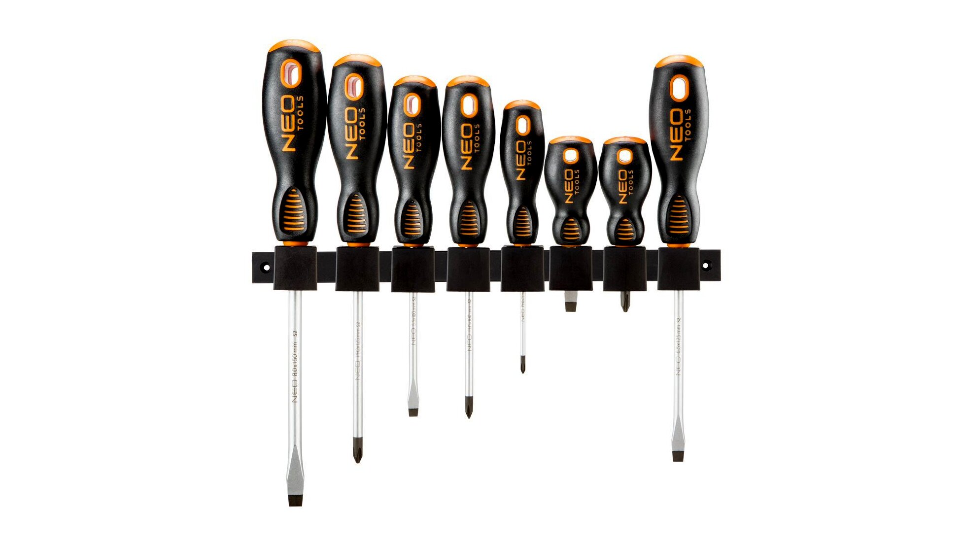 A NEO csavarhúzó szett (kat. sz.: 04- 206) 8 db csavarhúzóból áll: lapos és kereszt csavarhúzókból. A csavarhúzó szára kivételesen erős S2 acélból készül. A csavarhúzó hegy hőkezelésnek lett alávetve, így megfelelő keménységet és hajlítószilárdságot ért el. A csavarhúzó hegye mágneses. A markolat három élű hasáb alakja a kialakított hüvelyktámasszal csökkenti a kéz megterhelését munka közben, és megkönnyíti a megfelelő forgatónyomaték elérését. A bimateriál markolat nem csúszik ki a kézből, ellenálló vegyszerek, kenőolajok és zsírok hatásának. A szerszám minőségét bizonyítja a gyártó által nyújtott 25 éves jótállás. A NEO márka a professzionális igényeket is kielégíti.