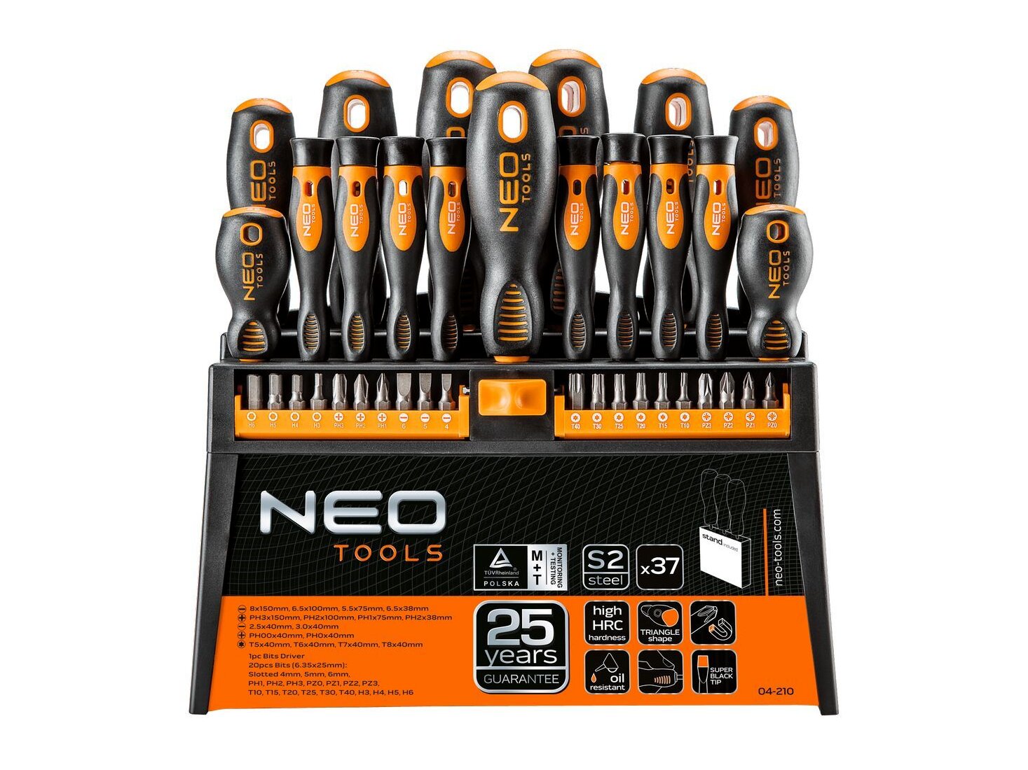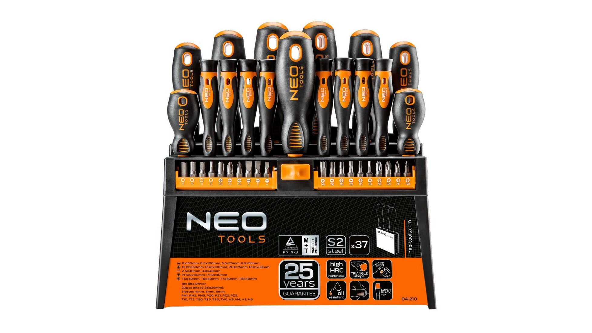 A NEO csavarhúzó és csavarhúzó bit készlet (kat. sz.: 04- 210) 37 db kiváló minőségű elemből áll. Mindegyik csavarhúzó szára nagy ellenállóképességű, hosszú élettartamot biztosító S2 acélból készült. A csavarhúzók hegye mágneses. A markolat három élű hasáb alakja a kialakított hüvelyktámasszal csökkenti a kéz megterhelését munka közben, és megkönnyíti a megfelelő forgatónyomaték elérését. A bimateriál markolat nem csúszik ki a kézből, ellenálló vegyszerek, kenőolajok és zsírok hatásának. A szerszám minőségét bizonyítja a gyártó által nyújtott 25 éves jótállás. Mindez, az összesen 8 db legkiválóbb minőségű műszerész csavarhúzóval és a különféle alakú és méretű 20 bittel együtt praktikus, a szállítást és a tárolást megkönnyítő állványon van csomagolva. A NEO márka a professzionális igényeket is kielégíti.