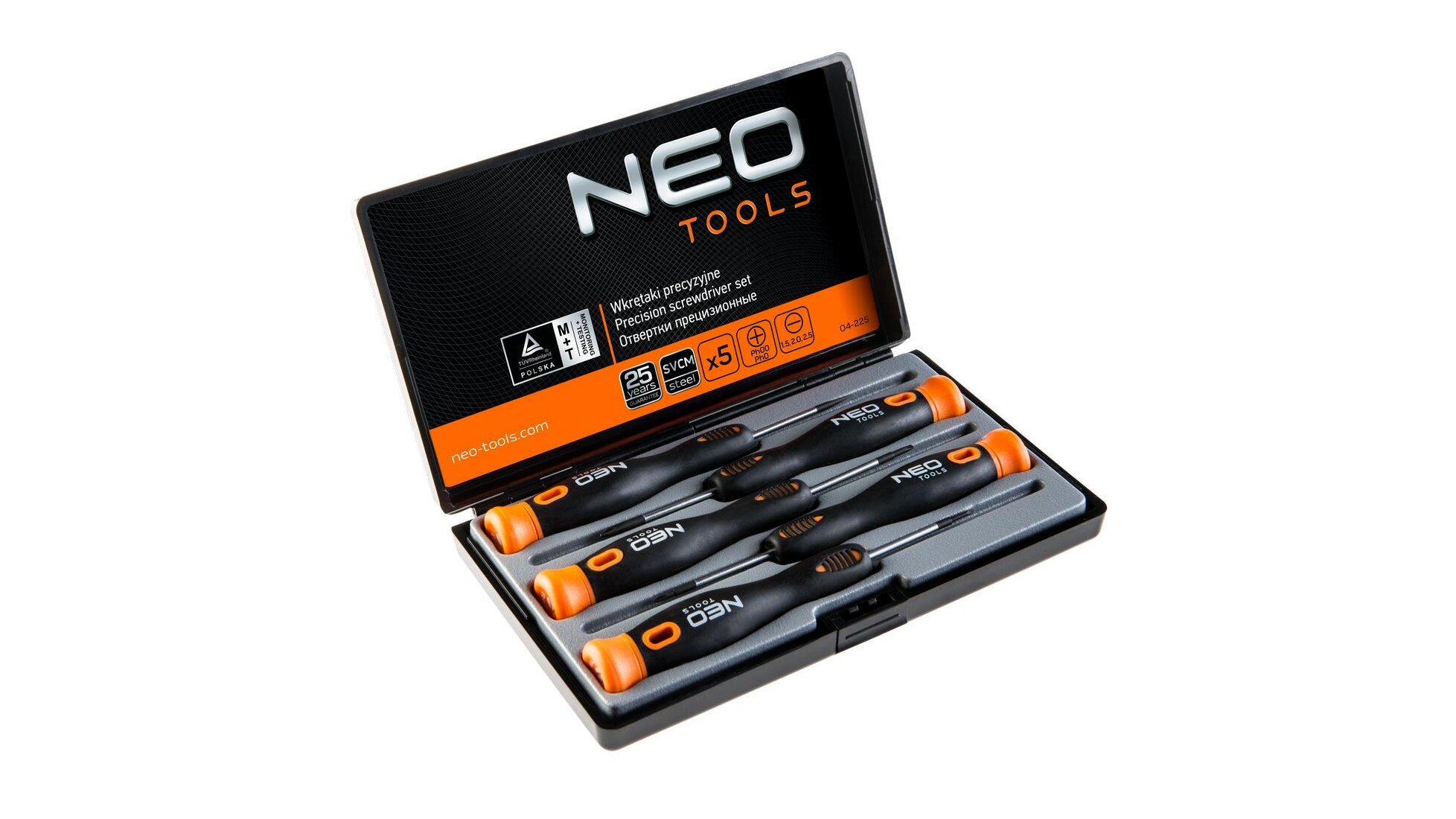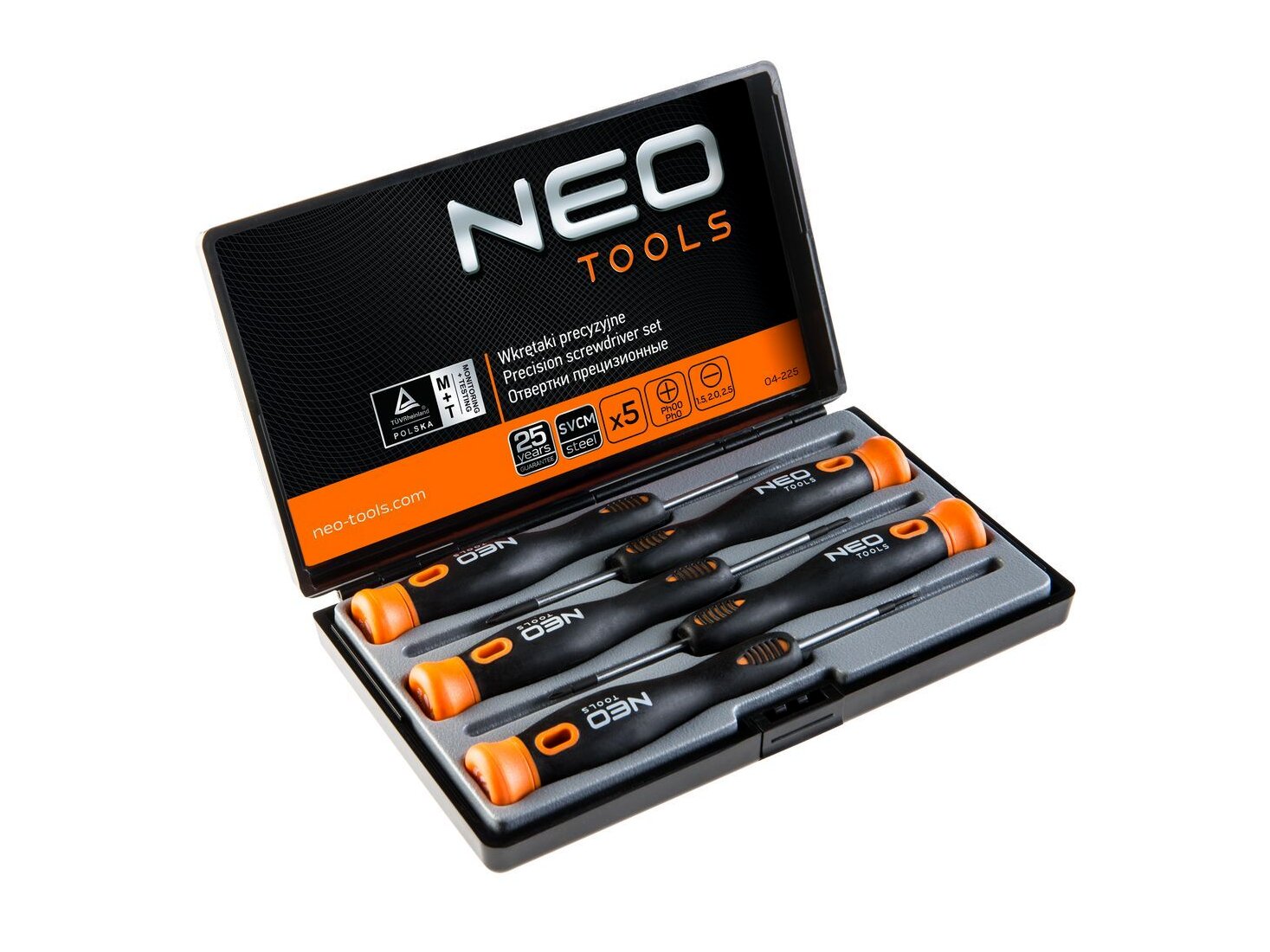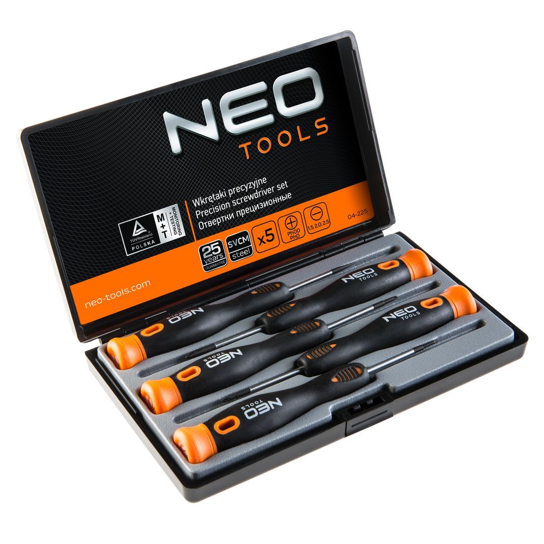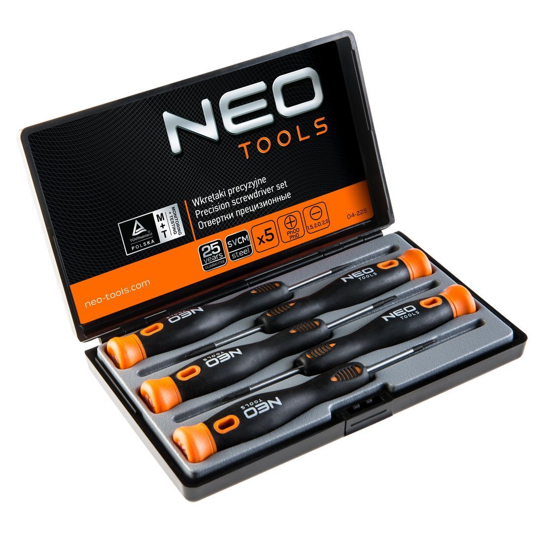 A NEO műszerész csavarhúzó szett 5 csavarhúzóból áll: lapos és kereszt csavarhúzókból. A csavarhúzó szára kivételesen ellenálló CrMo acélból készül. A csavarhúzó hegy hőkezelésnek lett alávetve, így megfelelő keménységet és hajlítószilárdságot ért el. A csavarhúzó hegye mágneses. A markolat forgó kupakja megkönnyíti a csavarok precíz meghúzását. A bimateriál markolat ellenálló vegyszerek, kenőolajok és zsírok hatásának. A szerszám minőségét bizonyítja a TÜV tanúsítvány és a gyártó által nyújtott 25 éves jótállás. A NEO márka a professzionális igényeket is kielégíti.