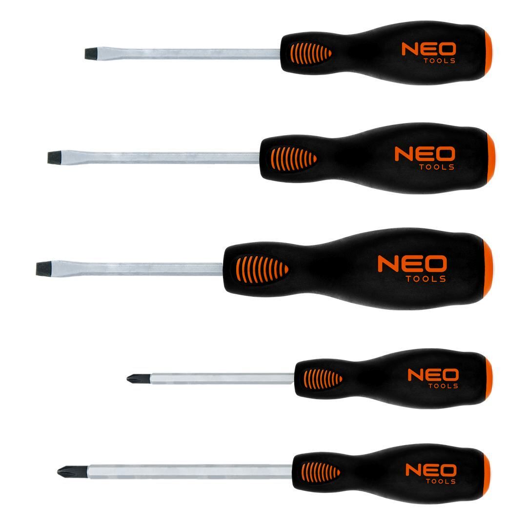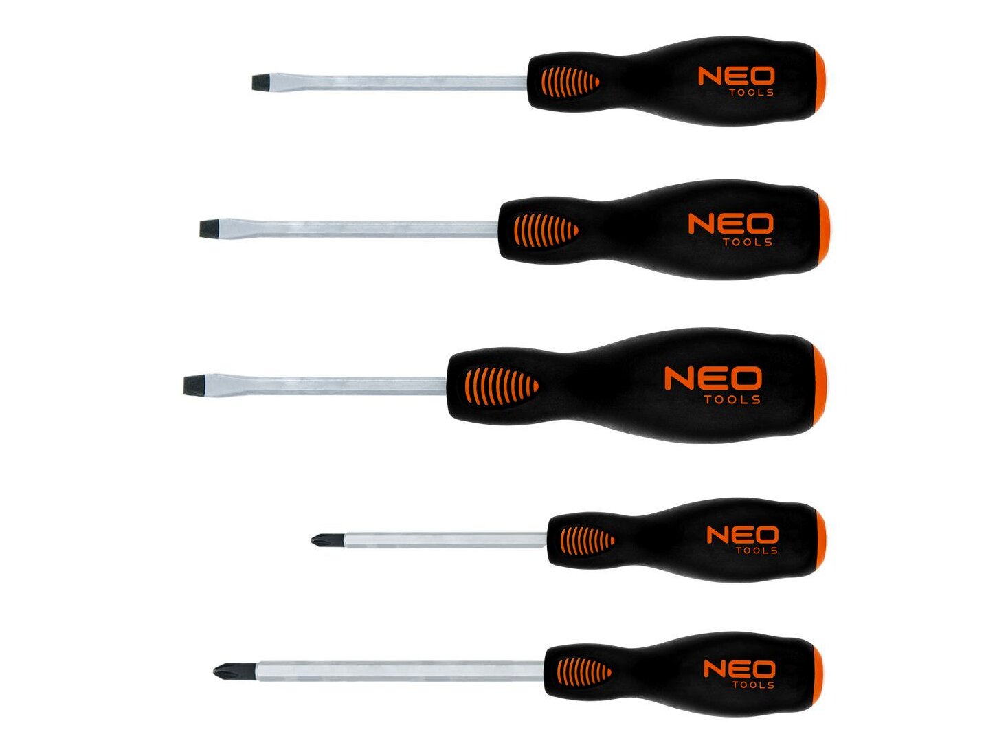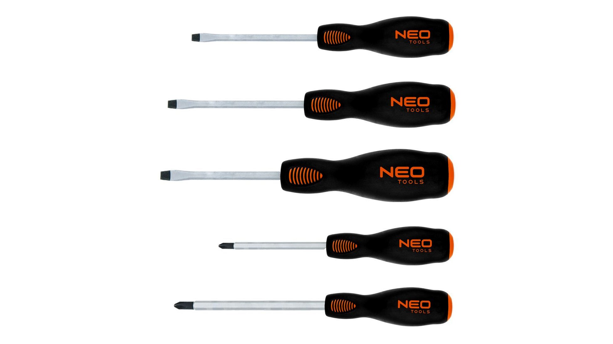 A NEO üthető csavarhúzó szett 5 csavarhúzóból áll: lapos és kereszt csavarhúzókból. A csavarhúzó hegye kivételesen ellenálló S2. A csavarhúzó hegy hőkezelésnek lett alávetve, így megfelelő, 56 HRC keménységet és hajlítószilárdságot ért el. A csavarhúzó hegye mágneses, markolata üthető. A markolat három élű hasáb alakja a kialakított hüvelyktámasszal csökkenti a kéz megterhelését munka közben, és megkönnyíti a megfelelő forgatónyomaték elérését. A bimateriál markolat nem csúszik ki a kézből, ellenálló vegyszerek, kenőolajok és zsírok hatásának. A szerszám minőségét bizonyítja a TÜV tanúsítvány és a gyártó által nyújtott 25 éves jótállás. A NEO márka a professzionális igényeket is kielégíti.