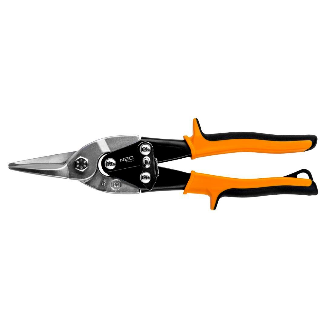 NEO lemezvágó olló. Szárai kiváló minőségű króm-molibdén acélból készülnek. Az élek indukciós edzést kapnak, ami jelentősen megnöveli tartósságukat. Vágóél kiképzése nem engedi kicsúszni a vágott anyagot. A gumifeltétes szemek stabilan fekszenek a kézben, nem csúsznak ki belőle. A szárak éles vágóperemei könnyedén, akadálymentesen vágják a lemezt. A TÜV Rheinland és a német DIN 6438 szabvány szerinti kivitel biztosítéka megbízhatóságának. A NEO márka a professzionális igényeket is kielégíti.