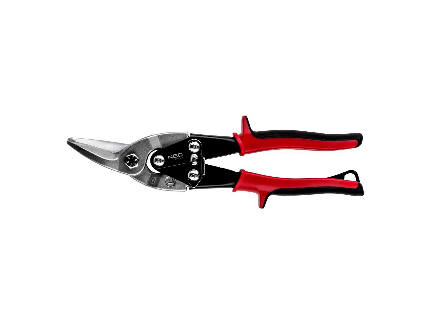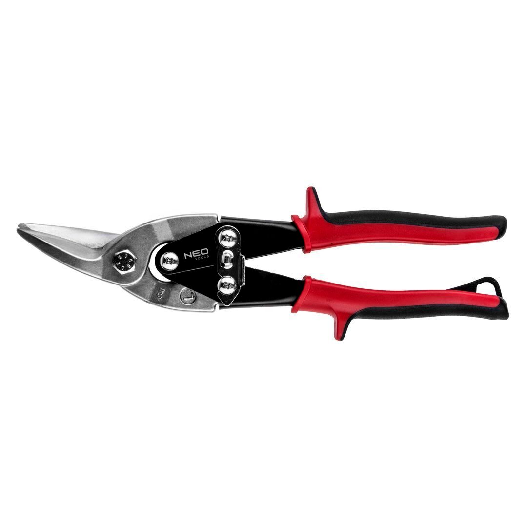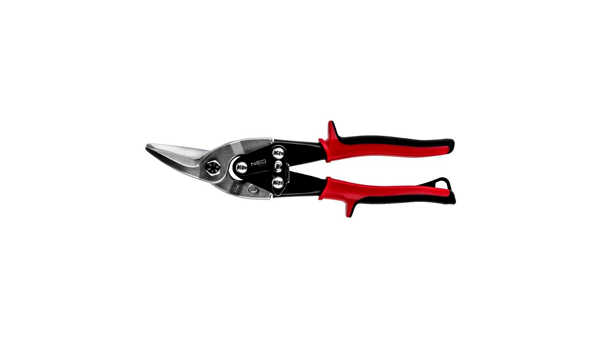 NEO lemezvágó olló. Szárai kiváló minőségű króm-molibdén acélból készülnek. Az élek indukciós edzést kapnak, ami jelentősen megnöveli tartósságukat. Vágóél kiképzése nem engedi kicsúszni a vágott anyagot. A gumifeltétes szemek stabilan fekszenek a kézben, nem csúsznak ki belőle. A szárak éles vágóperemei könnyedén, akadálymentesen vágják a lemezt. A TÜV Rheinland és a német DIN 6438 szabvány szerinti kivitel biztosítéka megbízhatóságának. A NEO márka a professzionális igényeket is kielégíti.