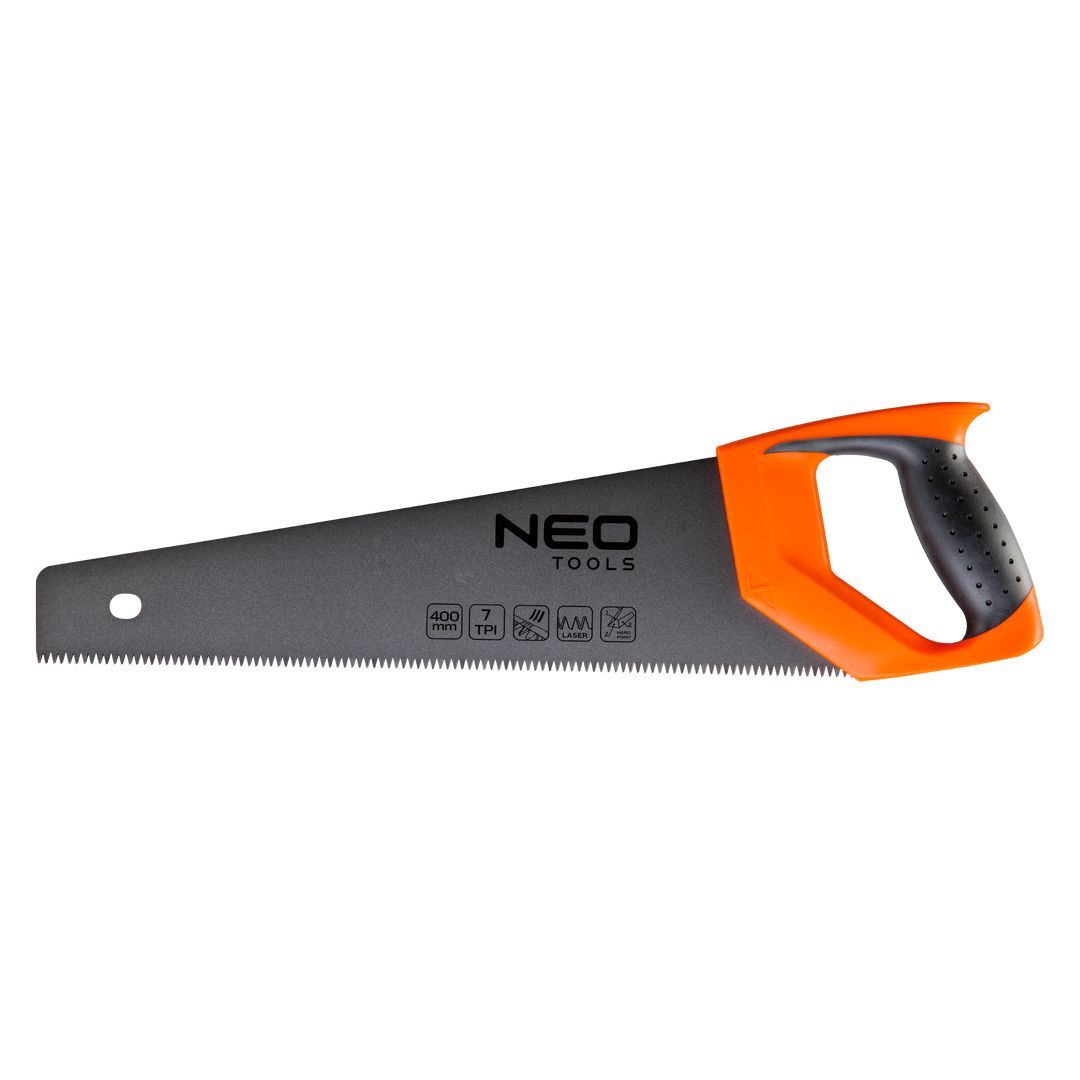 NEO rókafarkfűrész. Könnyű, de strapabíró konstrukció, gyors hatékony vágáshoz. A fogak edzése és háromsíkú élezése jelentősen csökkenti a vágási ellenállást, és megkönnyíti a fűrészelést szálirányban. Collonként 7 db-os fogazása gyors nagyoló vágást tesz lehetővé. A fűrészpenge PTFE teflon bevonata lehetővé teszi használatát nedves fához is, és megakadályozza a fűrészpor, a faforgács felragadását is. Az acél nagy rugalmassága hosszú élettartamot biztosít. Az ergonómikus, csúszásmentes anyaggal bevont markolat biztosítja a biztonságos és stabil fűrészvezetést a vágás során. A termék kiváló minőségét és megbízhatóságát bizonyítja a TÜV Rheinland tanúsítvány. A NEO márka a professzionális igényeket is kielégíti.