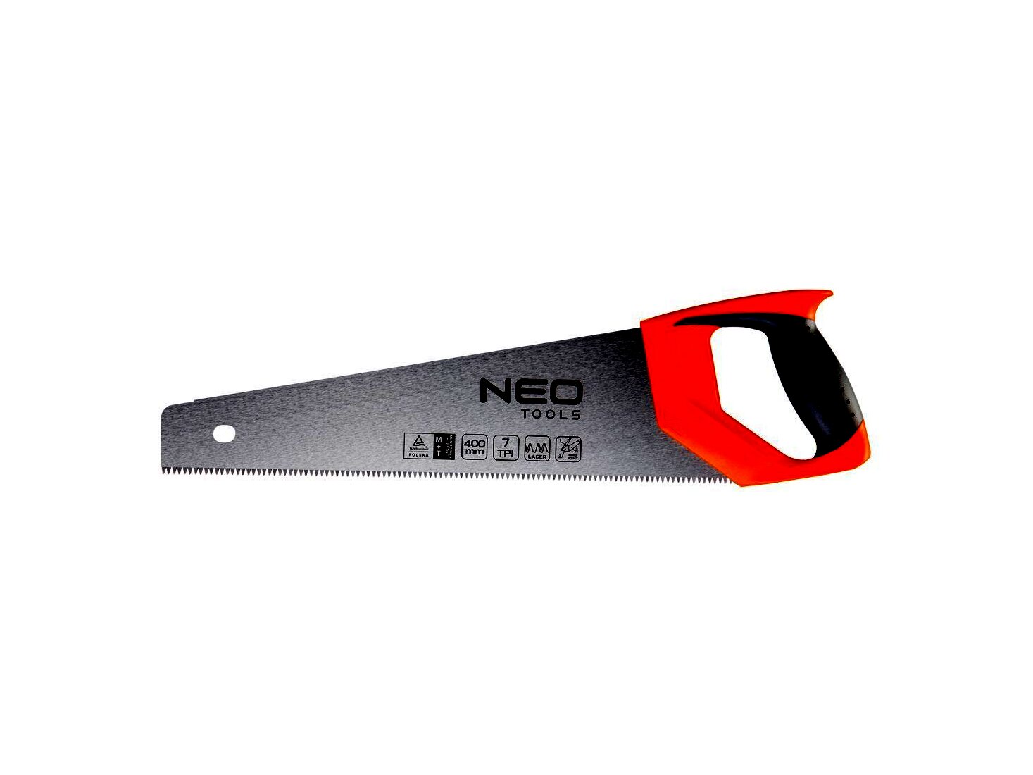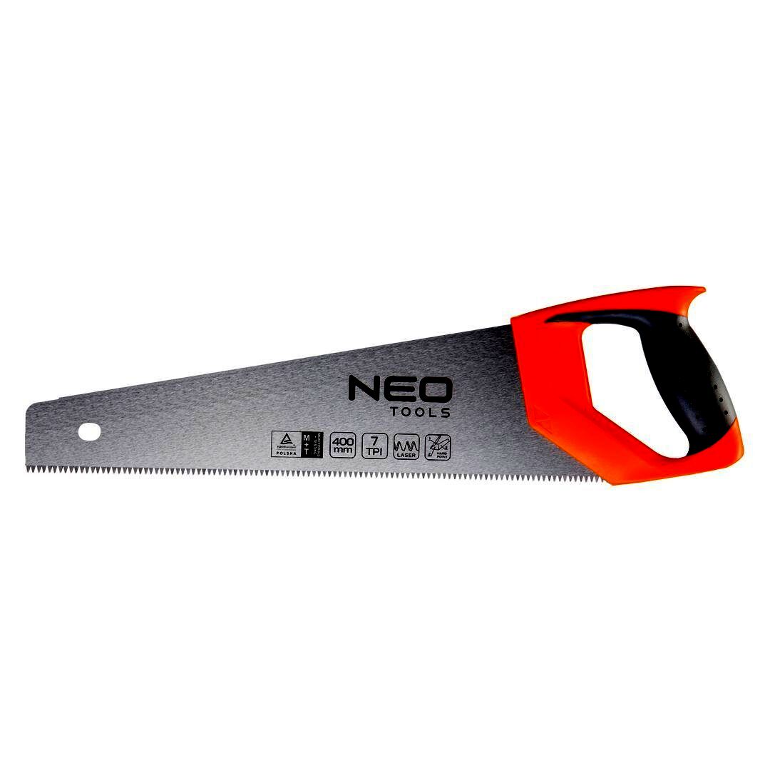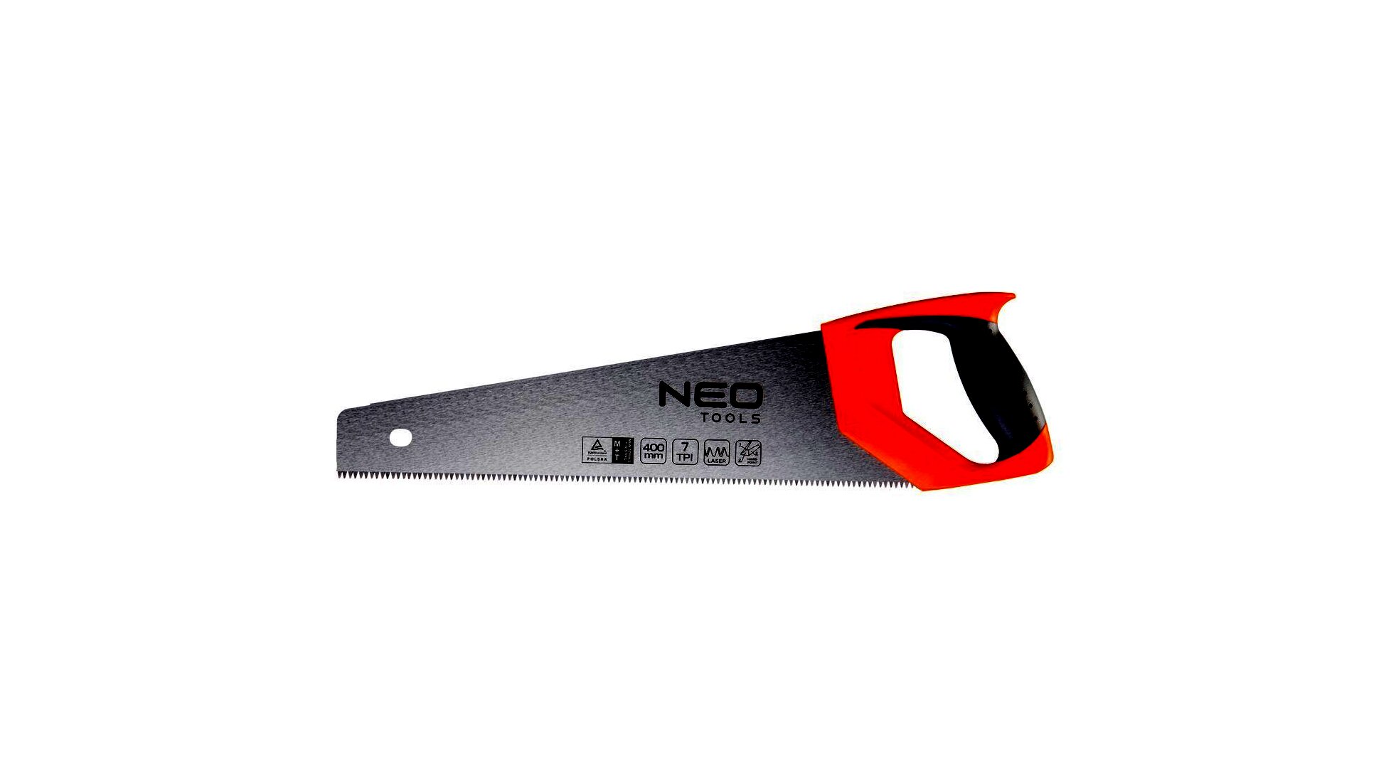 NEO rókafarkfűrész. Könnyű, de strapabíró konstrukció, gyors hatékony vágáshoz. A fogak edzése és háromsíkú élezése jelentősen csökkenti a vágási ellenállást, és megkönnyíti a fűrészelést szálirányban. Collonként 7 db-os fogazása gyors nagyoló vágást tesz lehetővé. Az acél nagy rugalmassága hosszú élettartamot biztosít. Az ergonómikus, csúszásmentes anyaggal bevont markolat biztosítja a biztonságos és stabil fűrészvezetést a vágás során. A termék kiváló minőségét és megbízhatóságát bizonyítja a TÜV Rheinland tanúsítvány. A NEO márka a professzionális igényeket is kielégíti.