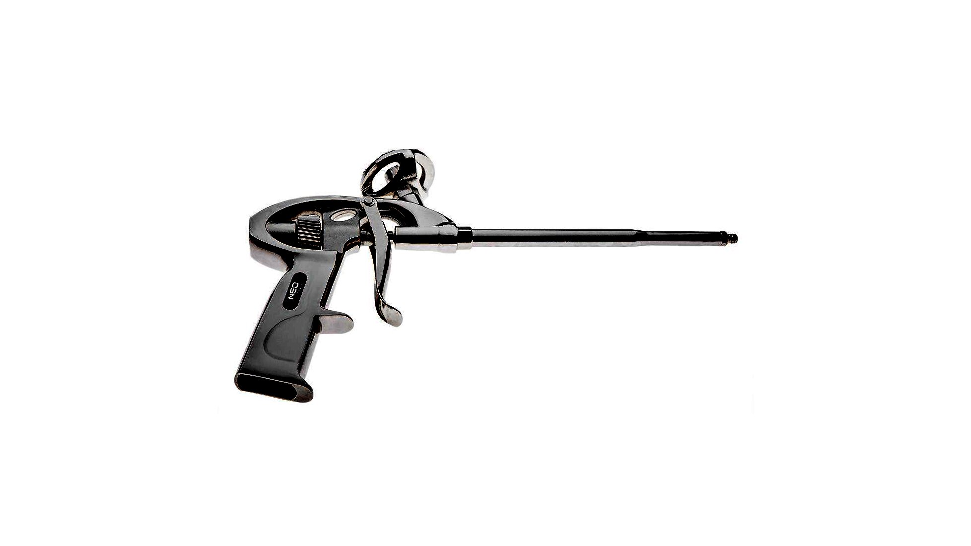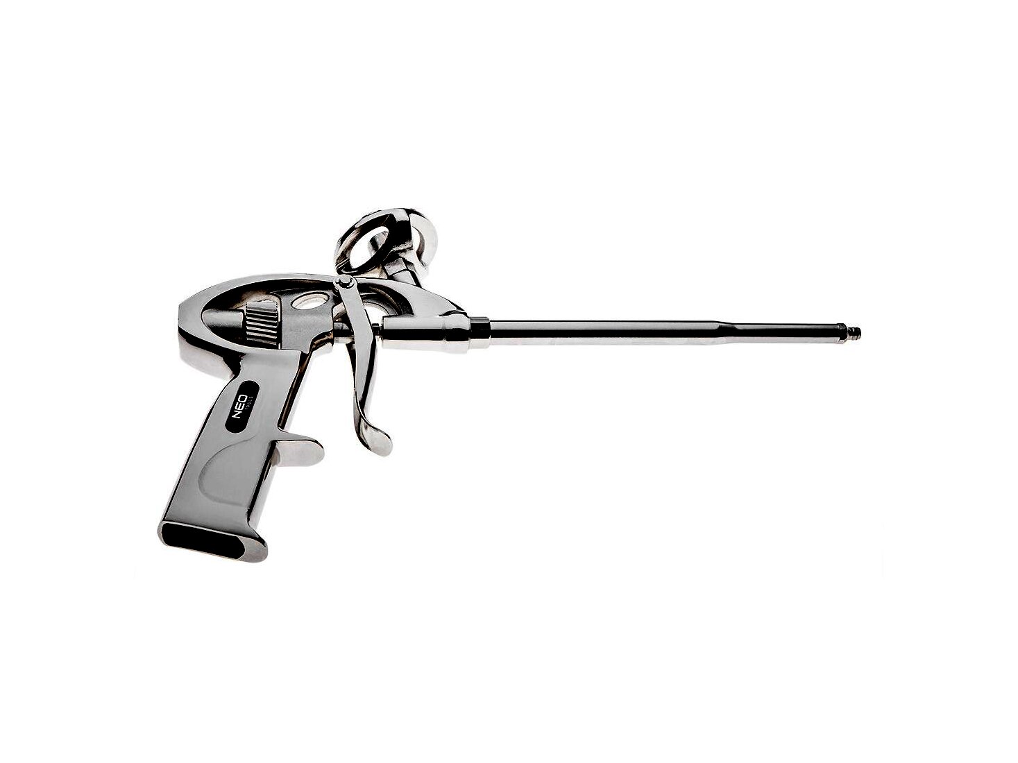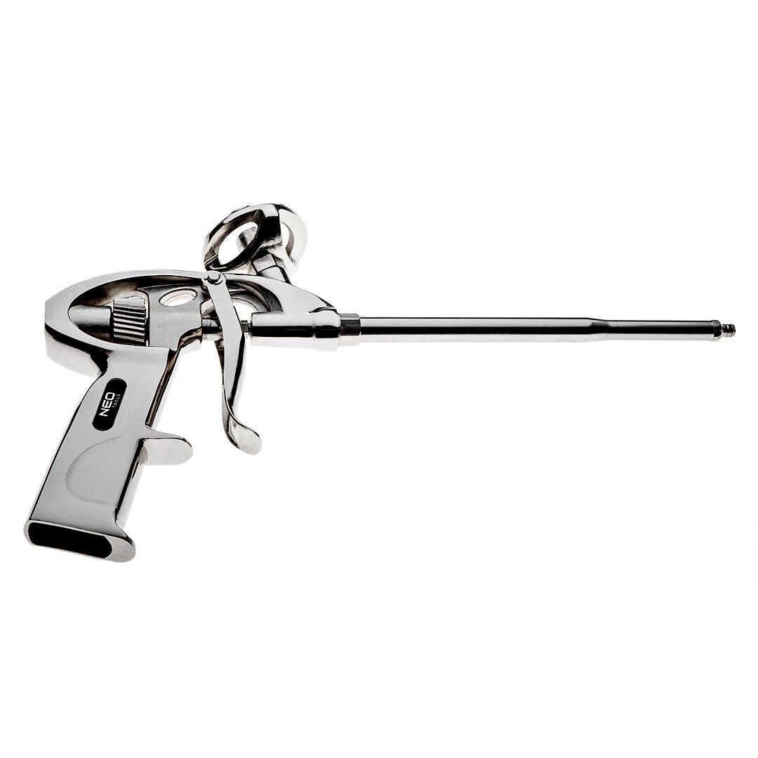 NEO kinyomó pisztoly szerelőhabhoz (kat. sz. 61-012) feje a munka közbeni szivárgást megakadályozó teflongolyós mechanizmussal és rozsdamentes acélból készült, teflonbevonatos fúvókatűvel. A masszív markolat az egykezes nyomásváltoztatást lehetővé tevő szabályzócsavarral biztosítja használati kényelmét. A nikkelezett, alumíniumötvözetből készült ház biztosítja a szerszám tartósságát. A NEO márka a professzionális igényeket is kielégíti.