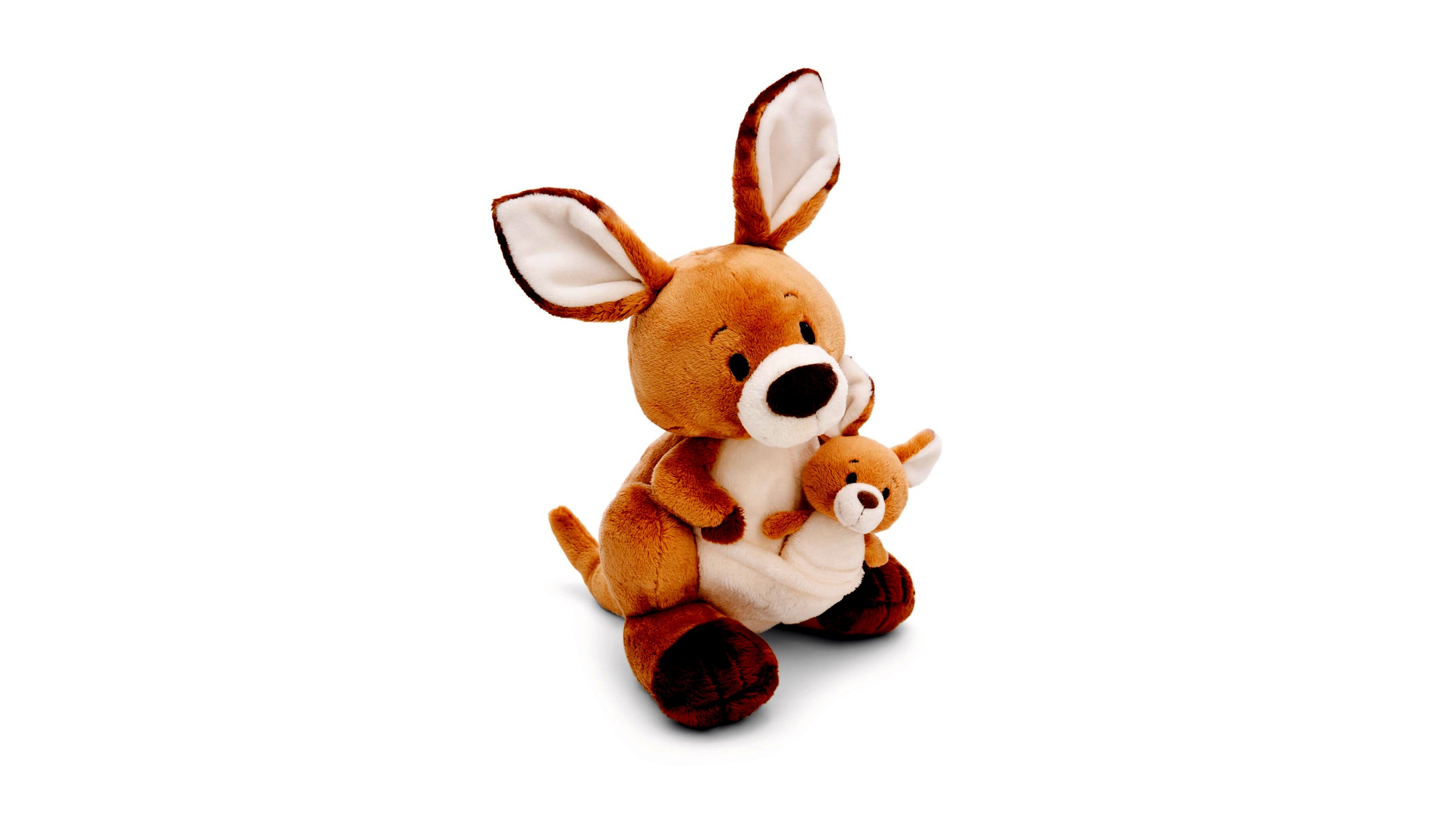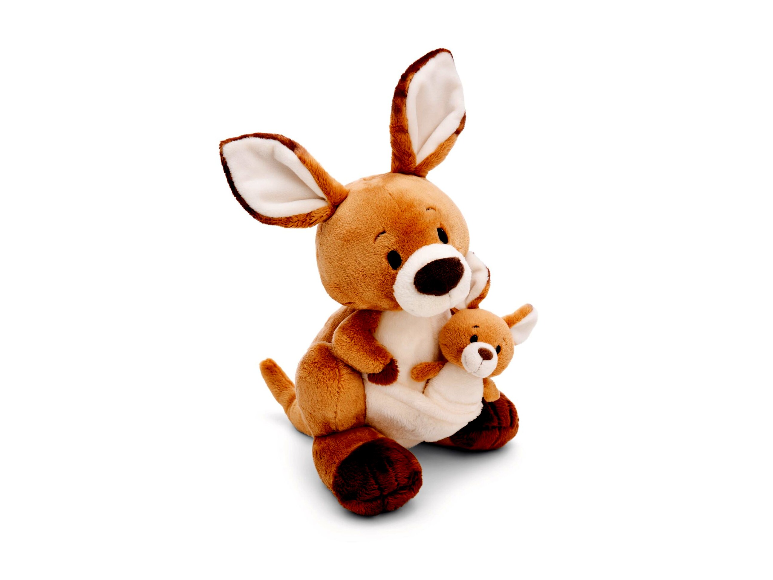 Kelly, a kenguru (25 cm) a NICI Wild Friends kollekcióból nem egyedül érkezik! Nem bizony – Kelly büszkén hozza magával kicsinyét is (10 cm), akit a pocakján lévő erszényben hord. A kétféle barna és fehér árnyalatú, puha plüssbundájukkal, bájos arcocskáikkal és nagy füleikkel a két kenguru kedvességet sugároz, és pillanatok alatt belopja magát kicsik és nagyok szívébe.A kengurubébi vidáman kukucskál ki biztonságos „otthonából”, és külön is játszható. Kelly erős hátsó lábain stabilan áll, és alig várja a közös játék- és ölelgetős kalandokat. Tökéletes választás minden kengururajongónak, aki hűséges társakat keres.