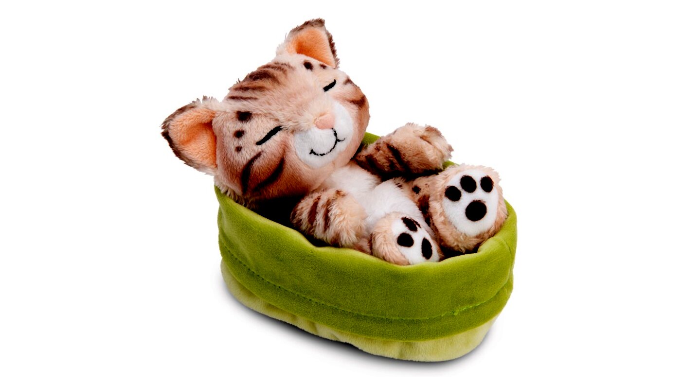 A kiscica egy világoszöld plüsskosárkában fekszik összegömbölyödve, ami nemcsak otthonos és biztonságos érzetet nyújt neki, hanem így ajándéknak is átadható. A plüsscica és a plüsskosárka külön-külön is használható.