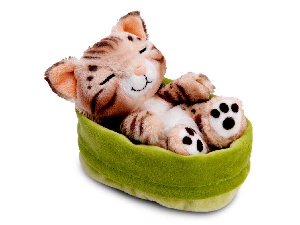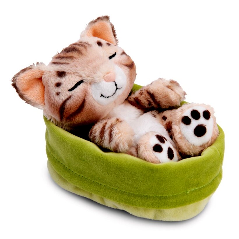 NICI GREEN, Szunyókáló bengáli plüss cica kosárban, 14,5 cm