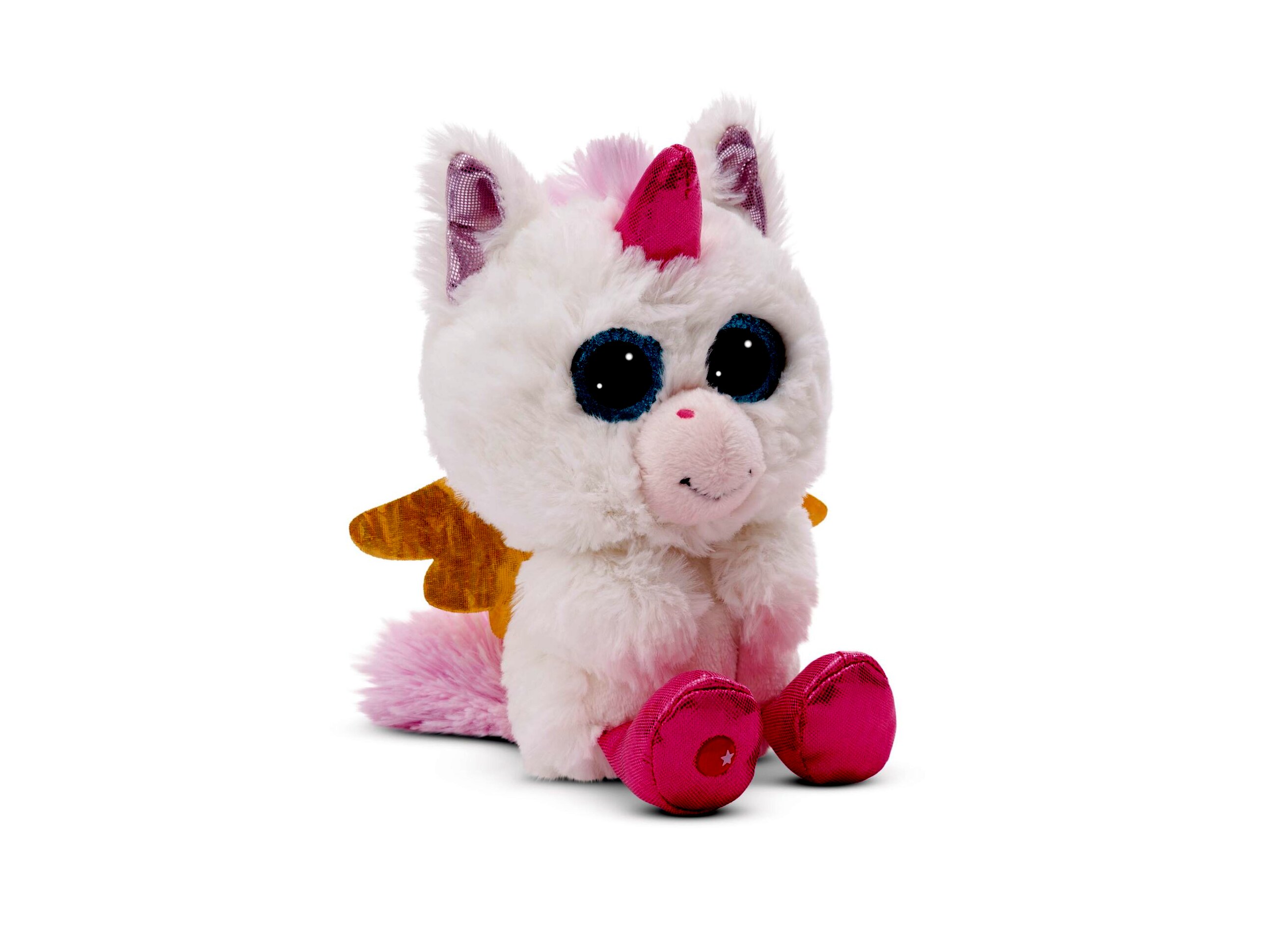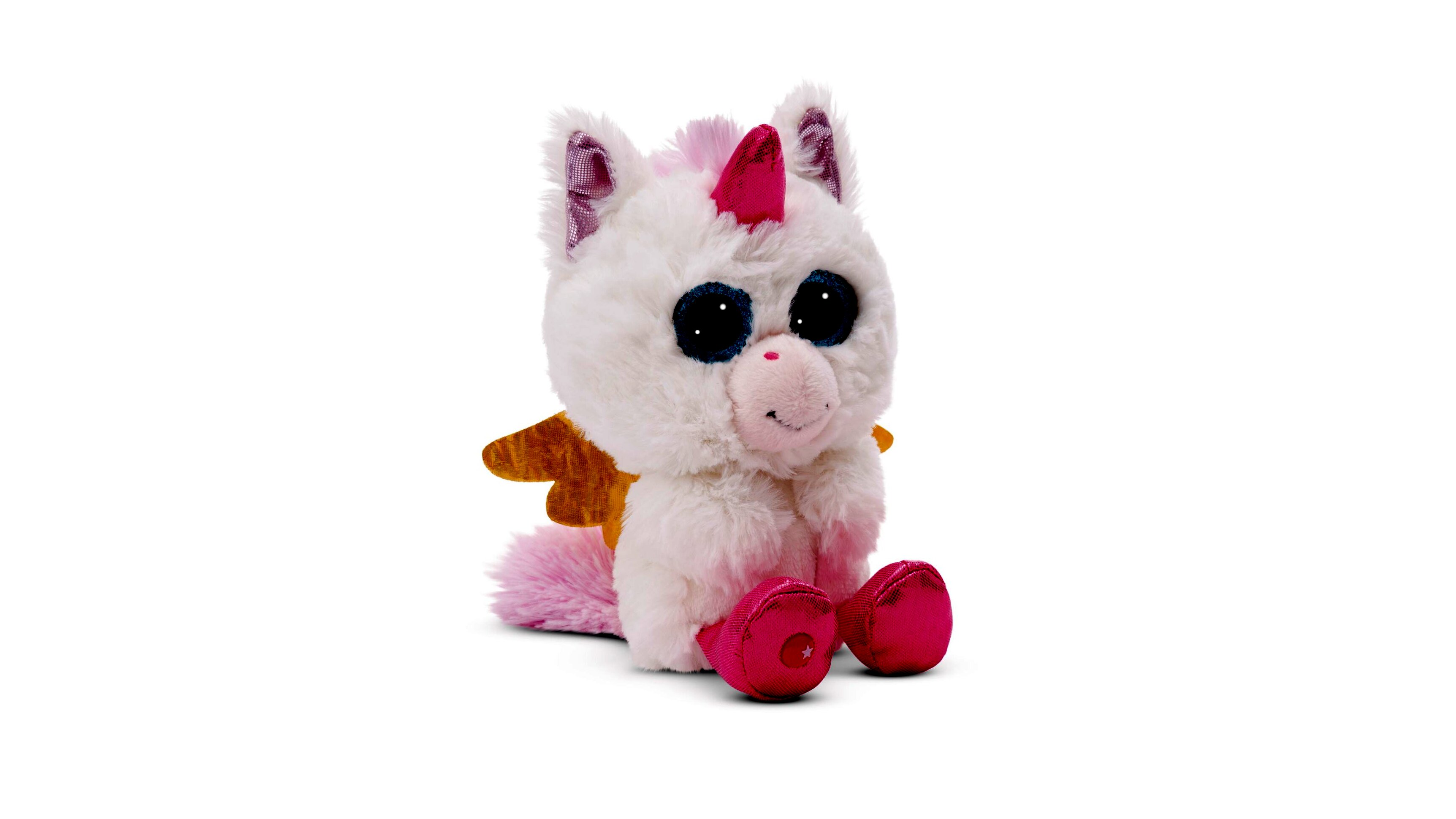 A GLUBSCHIS unikornis, Glowy Kadi hófehér, vízkék csillogó szemekkel, puha, rózsaszínű plüss sörénnyel és farokkal, valamint egy lenyűgöző csillogó szarvval a homlokán. Arany szárnyacskái egy bájos védőangyallá és talizmánná varázsolják ezt a pihe-puha plüss unikornist.