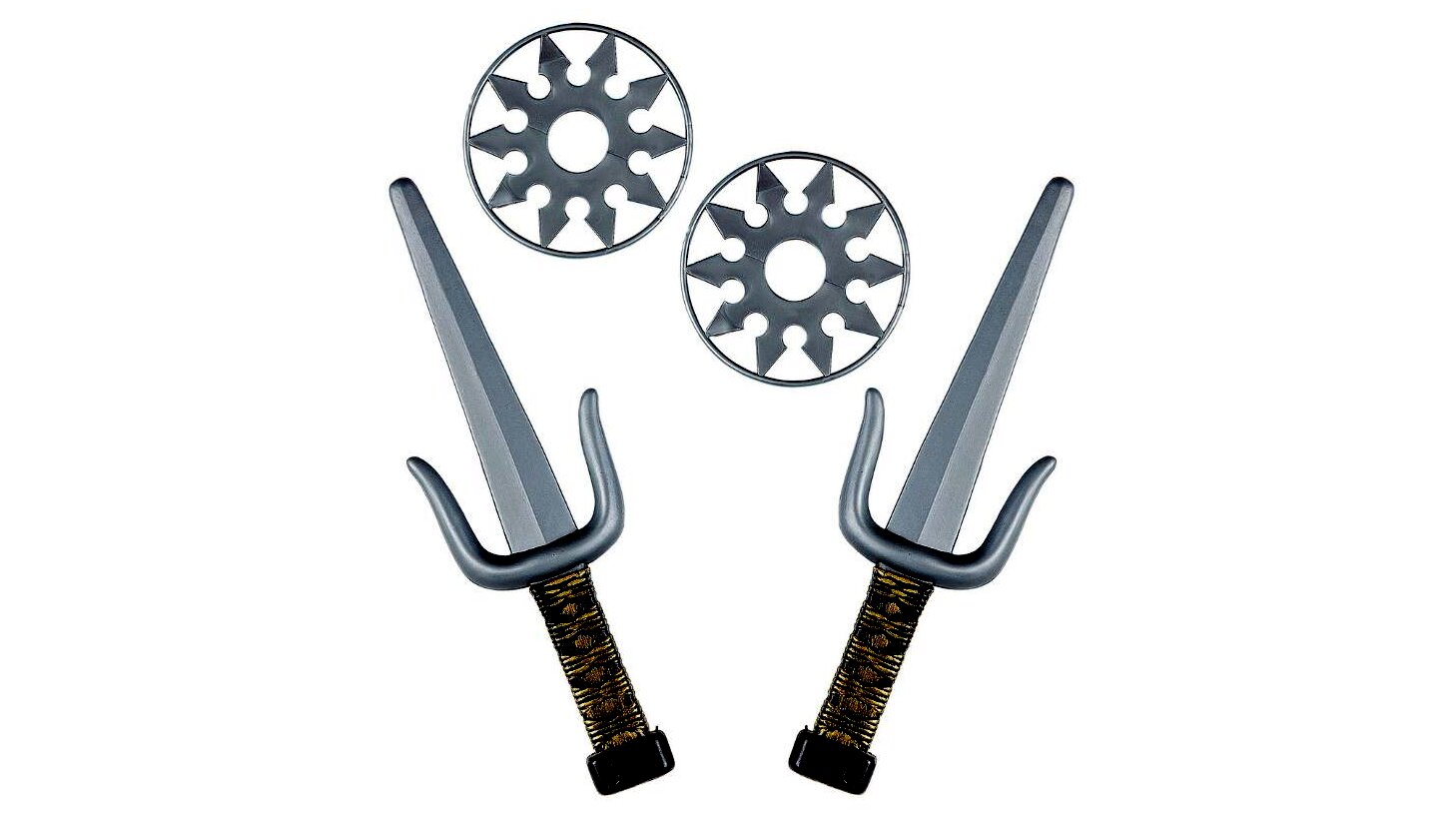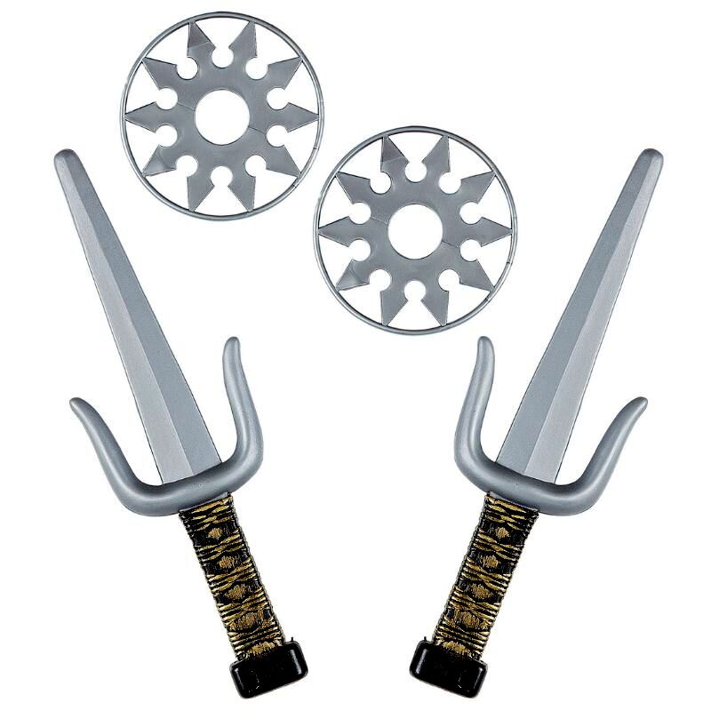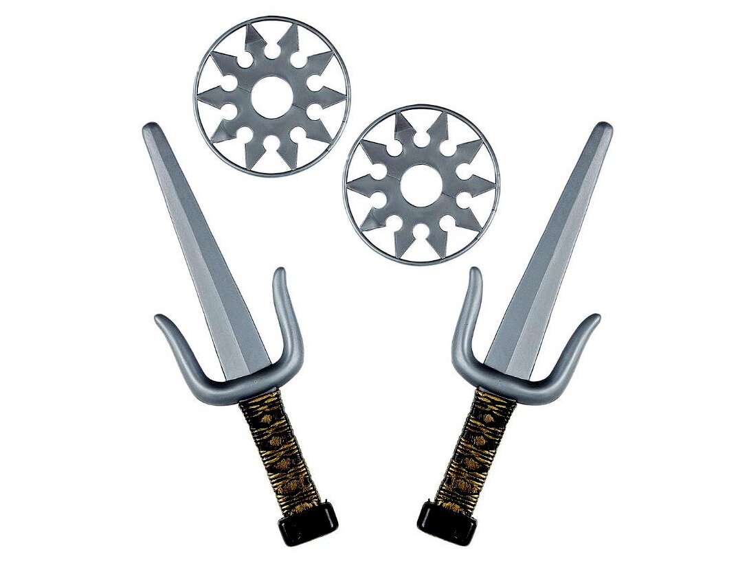 Melyik gyereknek ne fordulna meg a fejében, hogy mi lenne, ha nindzsává válna? Ezzel a 4 darabos fegyver szettel a kicsik két dobócsillaggal és két tőrrel tehetik teljessé már meglévő jelmezüket (külön megvásárolható). A műanyagból készült csillagok és pengék színe szürke, a tőrök nyele aranyozott díszítést kapott. A játékfegyvereket - lekerekített széleiknek köszönhetően - biztonságosan használhatják a gyerekek. Már csak meg kell várni, amíg leszáll az éj, és indulhat is a nindzsa-akció.