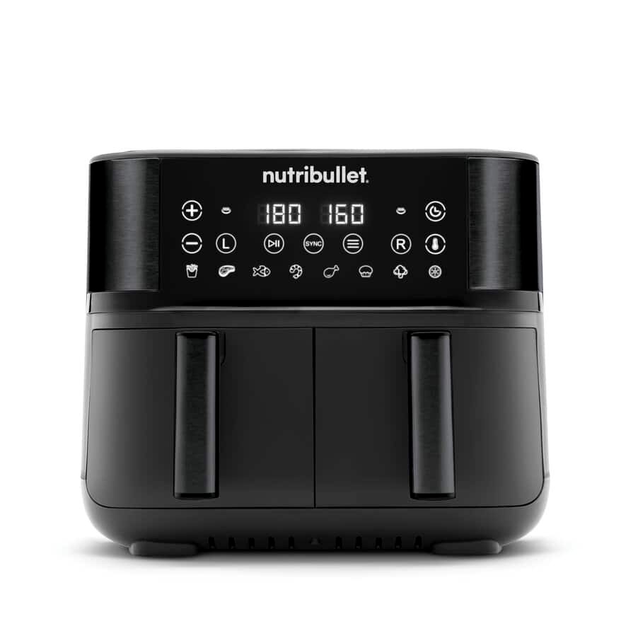 A nutribullet® Twin Drawer NBA081B forrólevegős sütő két, külön vezérelhető sütőkosarával és erőteljes teljesítményével ideális választás a gyors, kiegyensúlyozott ételek elkészítéséhez. A két darab 4 literes fiók segítségével egyszerre készíthetsz különböző fogásokat – akár főételt és köretet – minimális olaj felhasználásával.