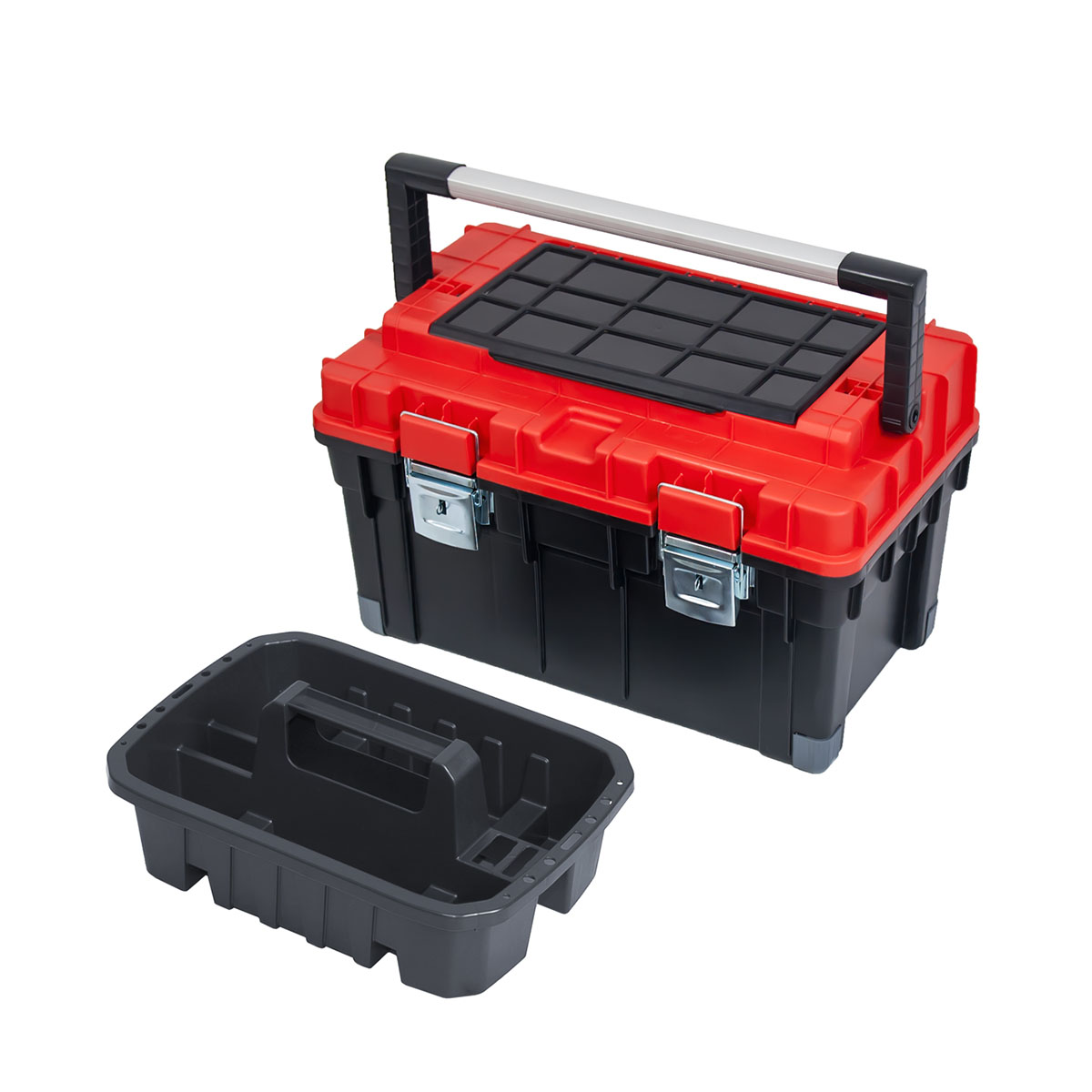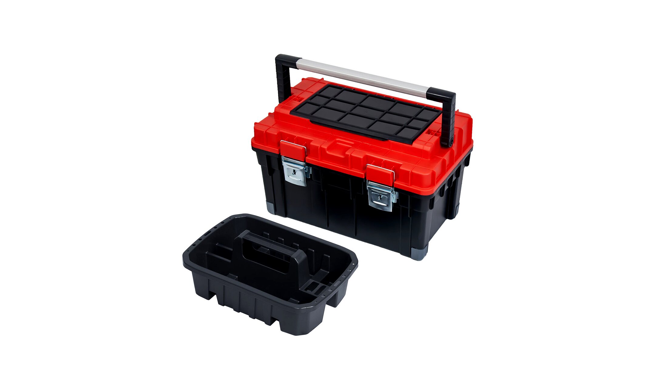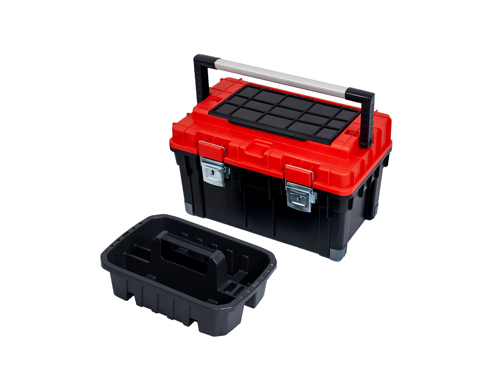 Rendező a fedélben, állítható elválasztók, HD alu fogantyú, fém reteszek, kocsi, oldalsó fogantyúk, csúszásgátló lábak, hordozható műhely, extra szerszámtartók.