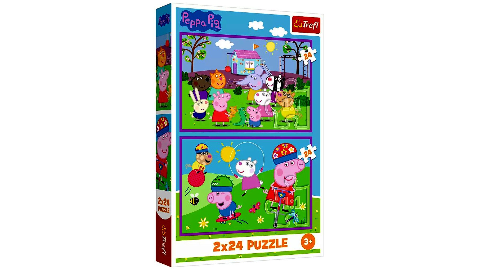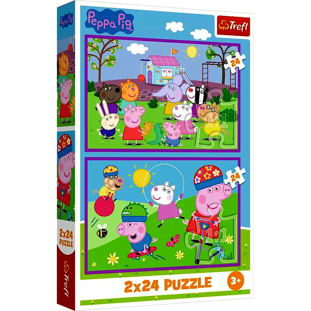 Prémium minőségű, 2 x 24 darabos puzzle Peppa malac rajongóknak. A darabok tökéletesen illeszkednek. Kicsik és nagyok számára egyaránt izgalmas és szórakoztató időtöltés, amelyet egyszerűen képtelenség megunni. A puzzle szétszedhető, majd újra összerakható, ha pedig összeragasztjuk a darabokat, bekeretezve akár a szoba dísze is lehet.A puzzle játékok nem csak a memóriát, a megfigyelő- és a koncentrációs képességet fejlesztik, türelemre és kitartásra is tanítanak.