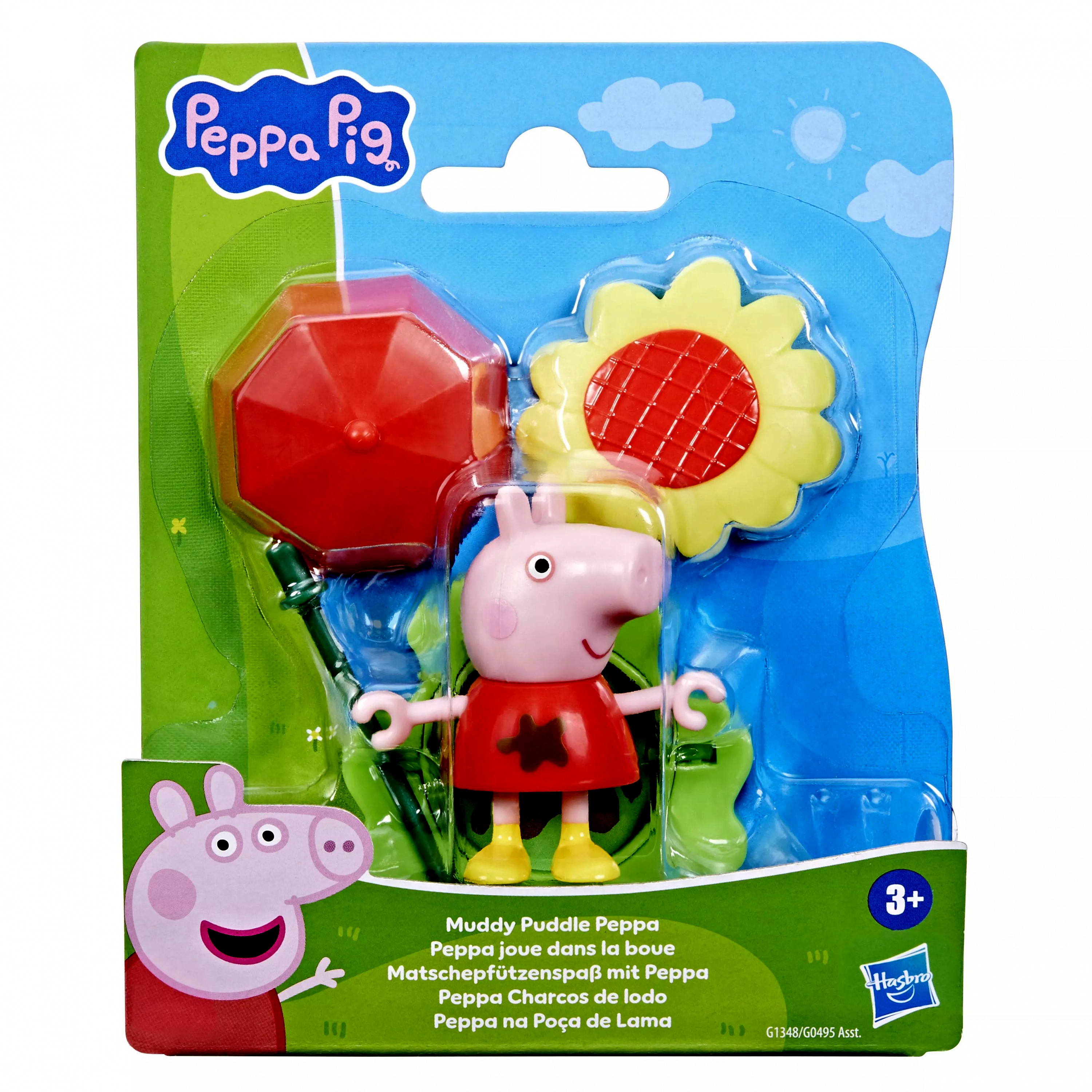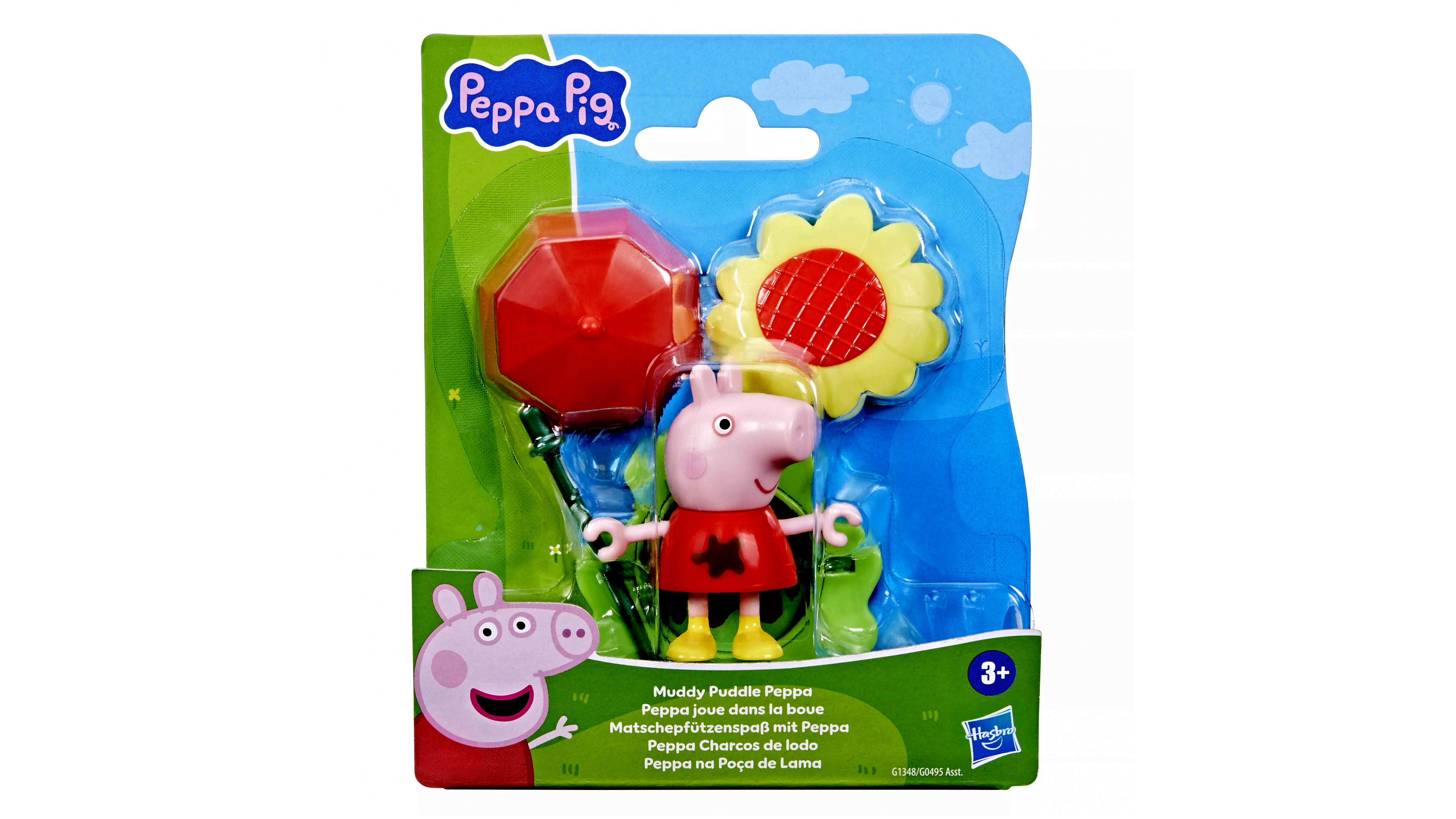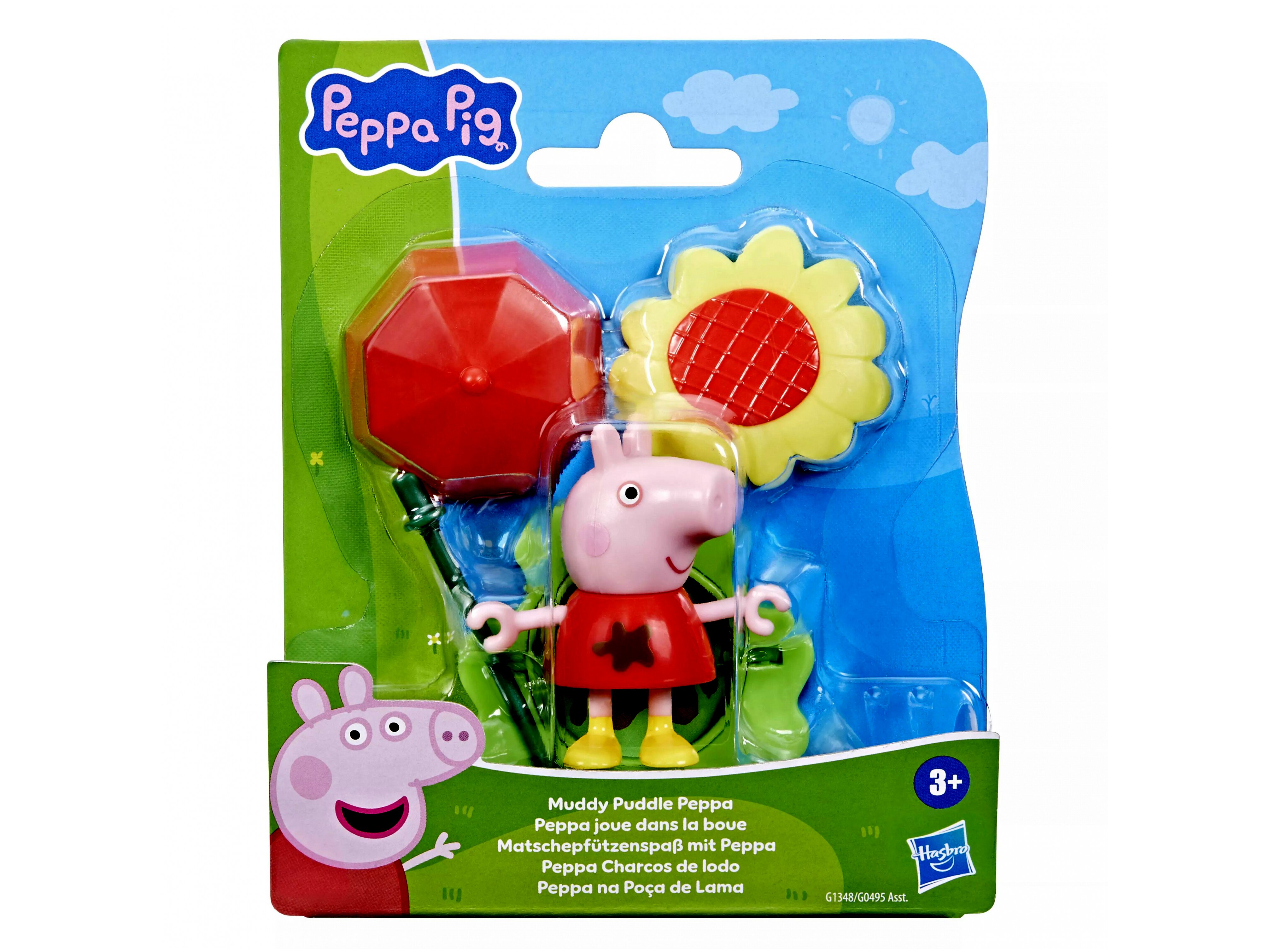 A Peppa Malac: sáros pocsolyás barátok készlet tartalmaz egy 7,5 cm-es mozgatható figurát, amely számos izgalmas kiegészítővel érkezik. A figura kezébe adható egy pálcika, amelyre esernyő vagy napraforgó illeszthető, így alkalmazkodik az időjáráshoz. Az alapdarab kétoldalas - egyik oldala fű, a másik sáros pocsolya, így mindig változatos játékélményt nyújt.