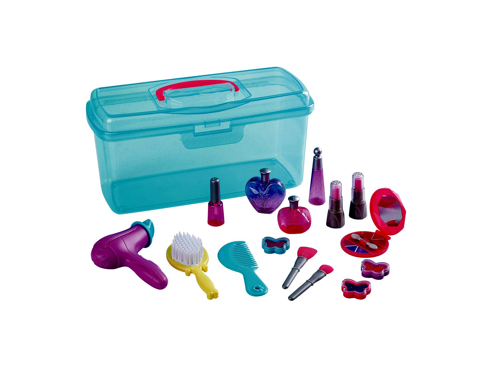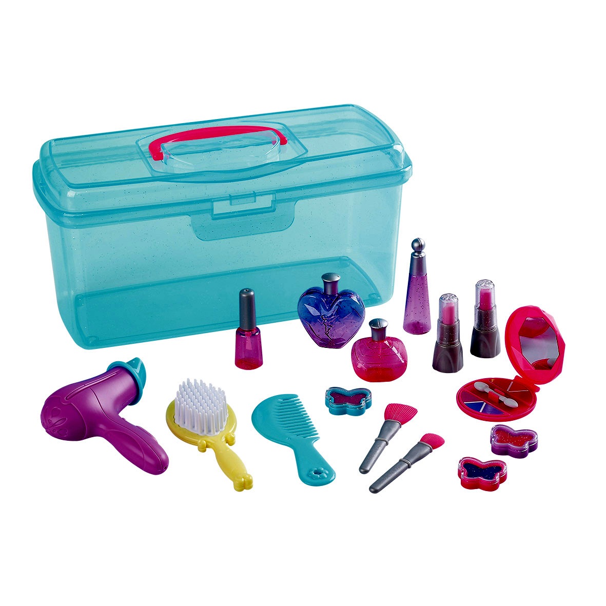 Ezt a piperekészletet bárhová könnyedén magukkal vihetik a kislányok. A készlet tartalmaz egy mini tükrös sminkkészletet, két különböző fésűt, mini hajszárítót, műanyag játéksminkeket és ecseteket, valamint parfümös-üvegcséket is. A játék befejeztével a készlet összes tartozéka könnyedén visszatehető a glitterekkel díszített praktikus tároló ládikába. A sminkszerek műanyagból készültek, nem kenhetők. A ládika mérete 31 x 14 x 14 cm.