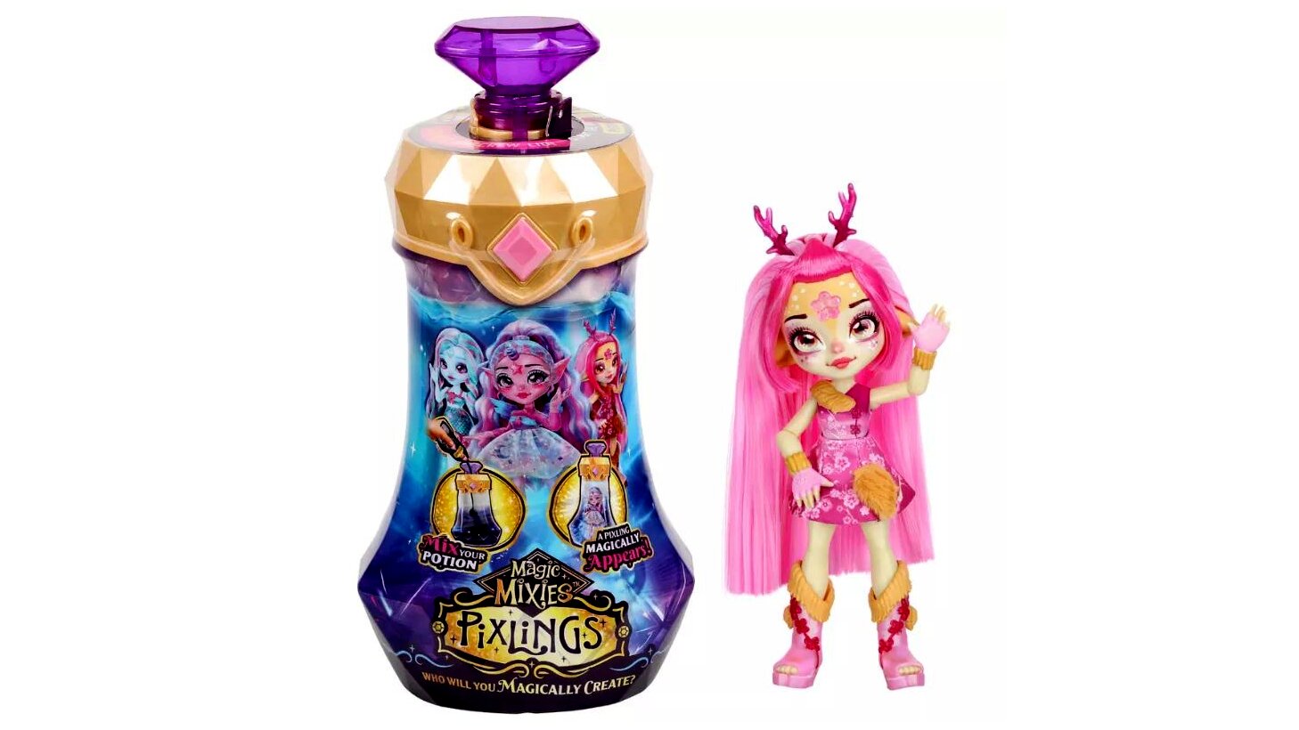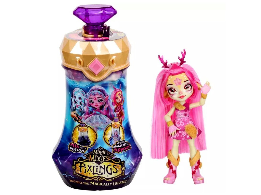 A gyerekeknek nincs más dolguk, mint beletenni a különleges üvegcsébe megfelelő sorrendben a csomagban rejlő hozzávalókat, és a főzet kavarogva sötétkék színbe borul. Ezután a kis bosziknak el kell mondaniuk a varázsigét, elforgatni és megnyomni az üvegcse tetején található drágakövet, és... varázslat, a kék bájital a szemük láttára válik áttetszővé, felfedve ezzel a bent rejlő mágikus babát.A 16 cm magas Pixlings Deerle baba könnyedén kiszedhető az üvegcséből, és több ponton mozgatható, így a gyerekek különböző pózokba állíthatják be. Pink haja, szarvas agancsai és irizáló kiegészítői misztikus megjelenést kölcsönöznek neki. A baba haja fésülhető.