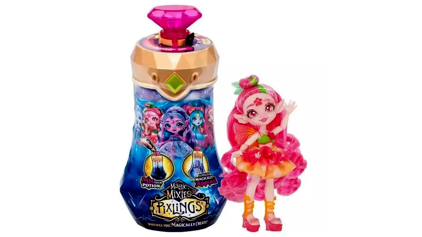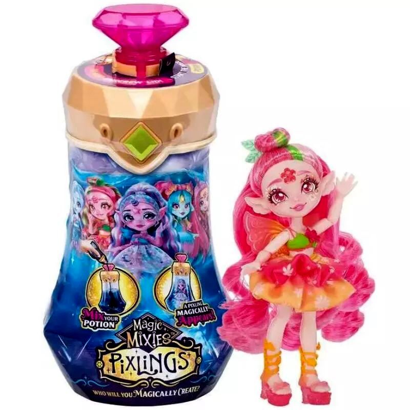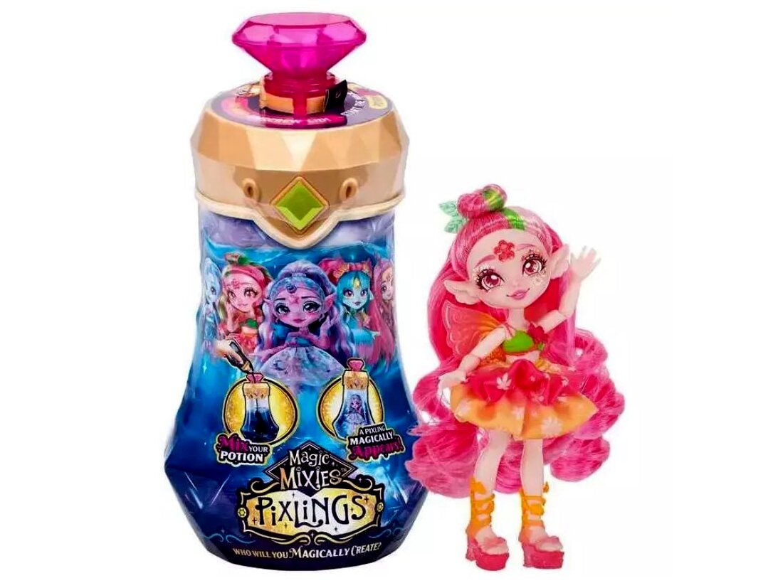 A gyerekeknek nincs más dolguk, mint beletenni a különleges üvegcsébe megfelelő sorrendben a csomagban rejlő hozzávalókat, és a főzet kavarogva sötétkék színbe borul. Ezután a kis bosziknak el kell mondaniuk a varázsigét, elforgatni és megnyomni az üvegcse tetején található drágakövet, és... varázslat, a kék bájital a szemük láttára válik áttetszővé, felfedve ezzel a bent rejlő mágikus babát.A 16 cm magas Pixlings Faye baba könnyedén kiszedhető az üvegcséből, és több ponton mozgatható, így a gyerekek különböző pózokba állíthatják be. A Faye nevű tündér babának rózsaszín haja, levélkés, virágos és irizáló kiegészítői misztikus megjelenést kölcsönöznek. A baba haja fésülhető.
