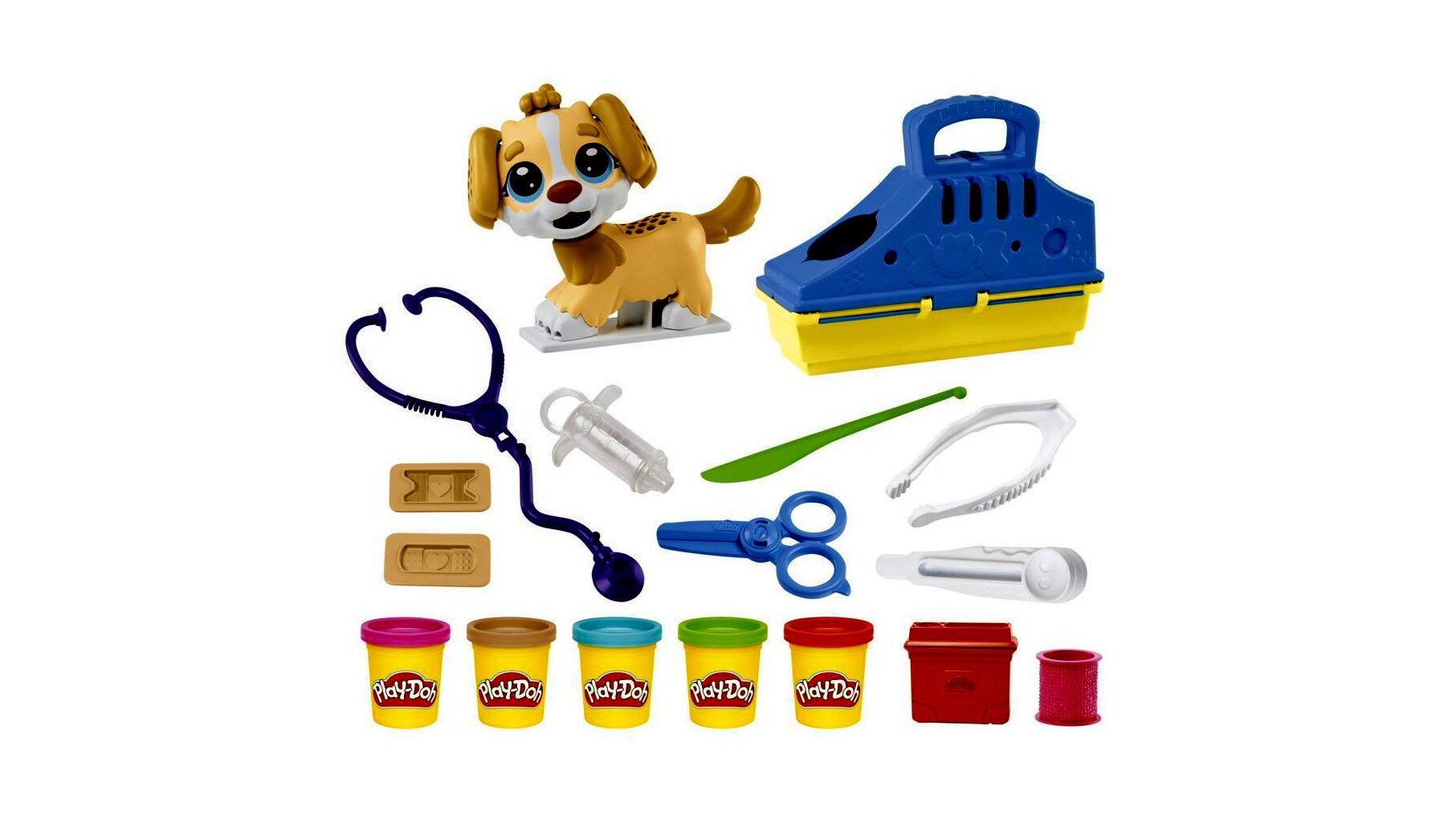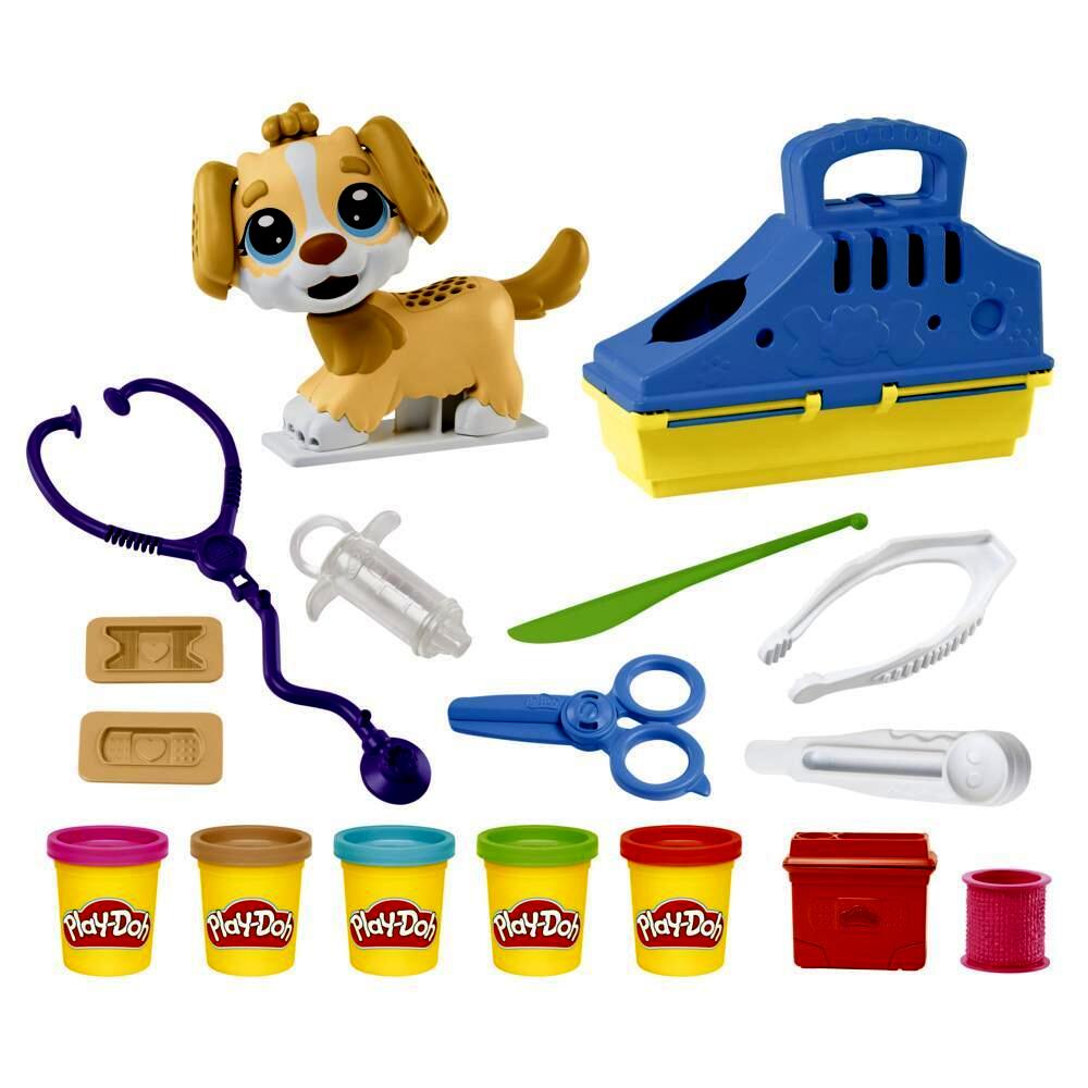 A készletben mindent megtalálnak, amire a beteg kutyus megvizsgálásához és gyógyításához szükséges lehet. Az állatorvosi rendelőbe hordozóban érkezik meg a kis beteg. Miután kivették őt, megvizsgálhatják a sztetoszkóppal, megmérhetik a lázát és bekötözhetik a sérüléseket. A sokféle mintanyomóval és a modellező gyurmákkal mindezt el tudják készíteni a játékhoz. A készlet 5 db tégely ( 284 g) színes gyurmát tartalmaz.