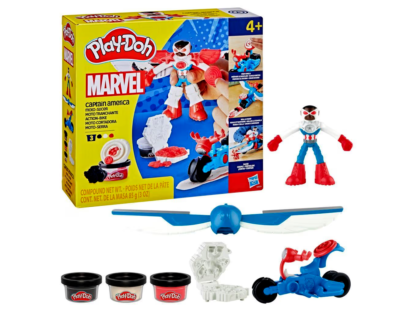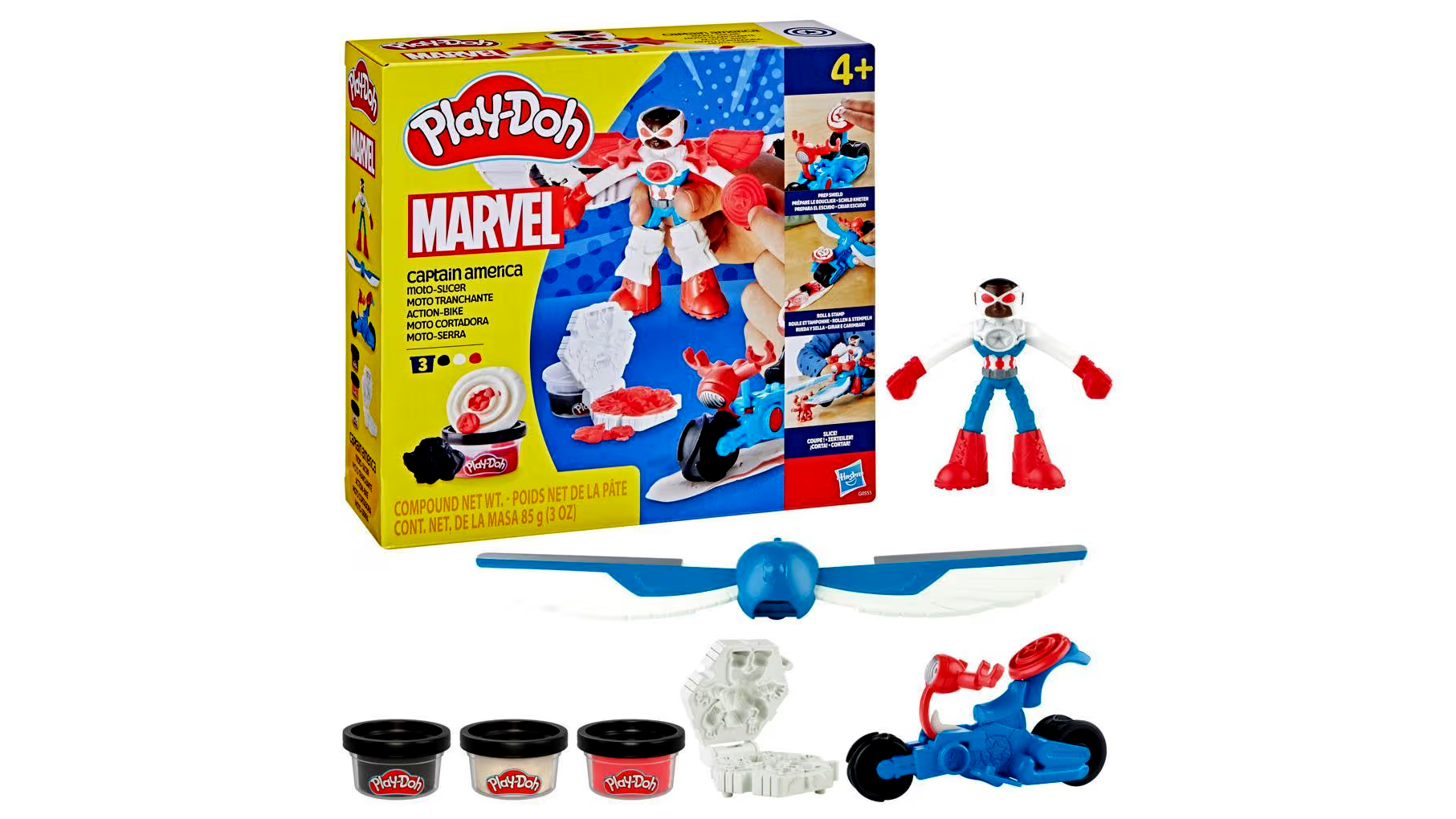 A gyerekek könnyedén és szórakoztató módon élhetik át saját kalandjaikat kedvenc hősükkel, Amerika Kapitánnyal. A Play-Doh Marvel akciófigura hajlítható karokkal és lábakkal rendelkezik, amelyeket a gyerekek különféle Play-Doh kiegészítőkkel személyre szabhatnak. A 2 az 1-ben szárnyak a figurára és a járműre is rögzíthetők, így még vagányabb a „szeletelős” akció. A könyv-formázóval gonosztevőket készíthetnek a gyerekek, a tetején pedig tüskék találhatók, amelyekre felállítható a figura.