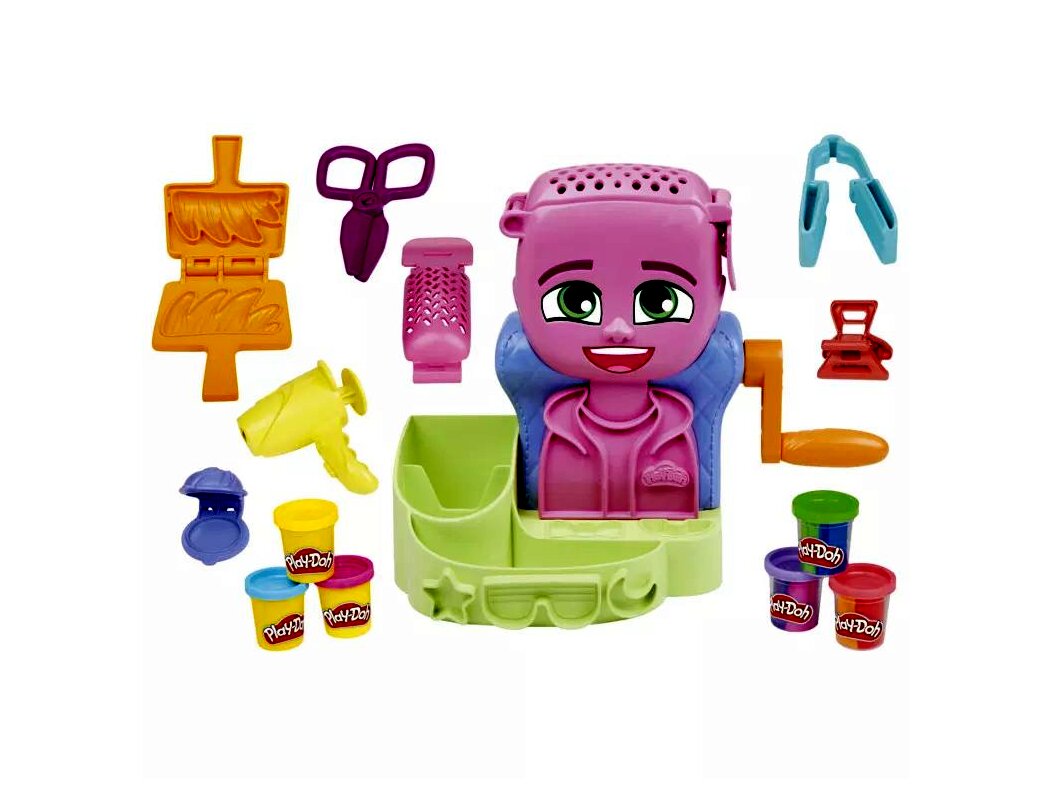 A Play-Doh fodrászszalon játékszettjével a gyerekek mesés frizurákat készíthetnek, méghozzá gyurmából. A szettben minden megtalálható ahhoz, hogy a műanyag próbafej színes hajkoronát kapjon: hajvasaló, olló, hajszárító, csat, gyurmaformázó eszközök és színes, könnyen formálható, puha gyurmák, amelyekből a kis fodrászjelöltek elkészíthetik a hajkoronákat.A csinos frizura elkészítéséhez csak bele kell helyezni a kiválasztott gyurmát a fej belsejébe, rányomni a tetejét, tekerni a kart, és már elő is bukkannak a gyurmatincsek, amik utána szabadon formázhatók az eszközökkel.