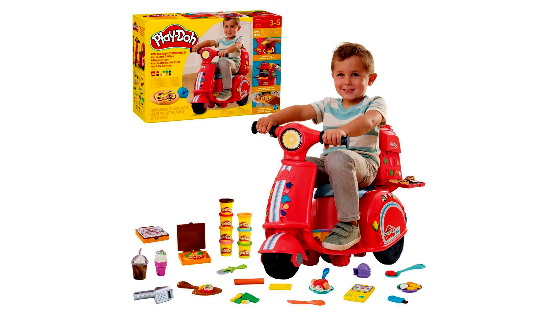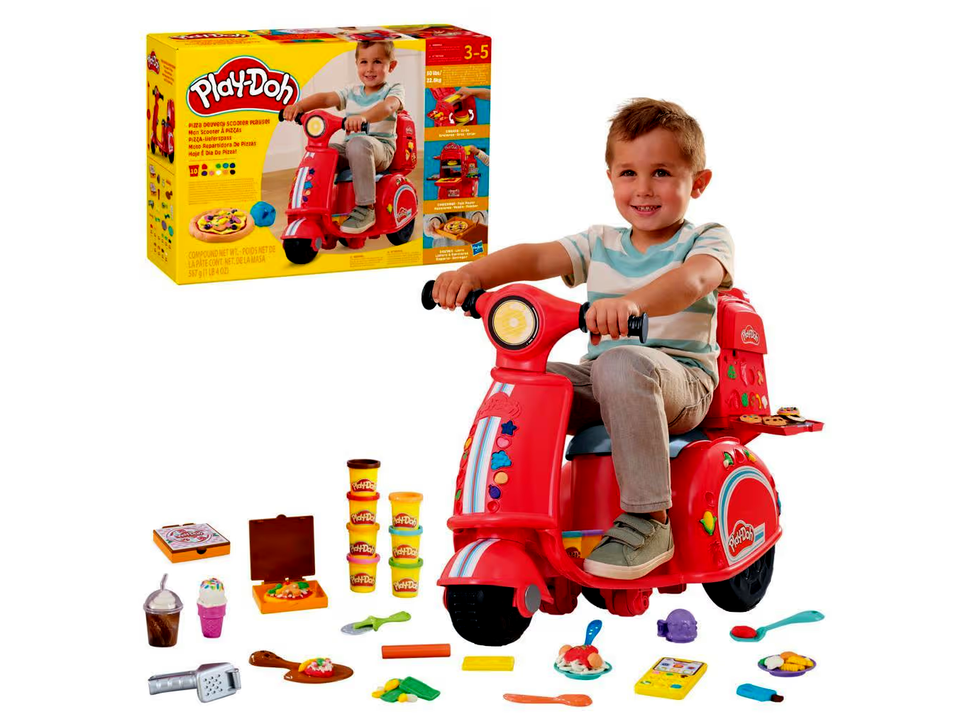 - A csomag tartalma: összeszerelésre váró robogó játékszett, 2 pizzás doboz, játék mobiltelefon, játék bankkártya, pizzasütő lapát, pizzaszeletelő, pohár tetővel, fagylaltforma, fagylalttölcsér, nyomóeszköz, spatula, 2 tányér, villa, kés, sodrófa és 10 doboz Play-Doh gyurma (nettó tömeg: 567 gramm).