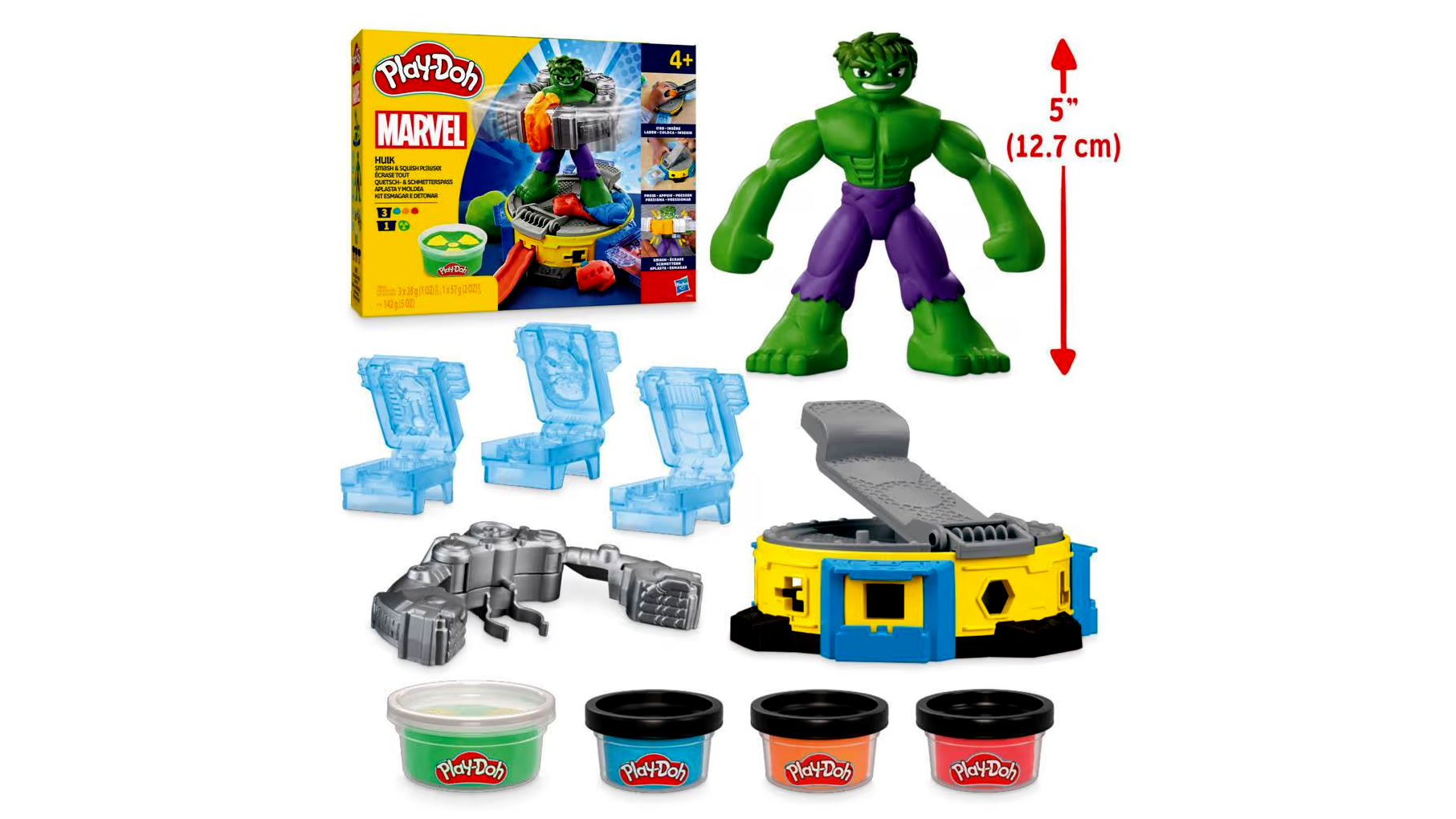 - KÉSZÍTS ÉS TÖRJ ÖSSZE PLAY-DOH TEHERAUTÓKAT (ÉS M.O.D.O.K.-OT): Ez a gyerekeknek szánt játékkészlet tartalmaz egy 360 fokos préselő eszközt és 3 csatlakoztatható Play-Doh formát, amelyek segítségével tankokat, teherautókat és egy M.O.D.O.K. figurát készíthetsz, amiket Hulk összenyomhat, összetörhet és ráléphet!