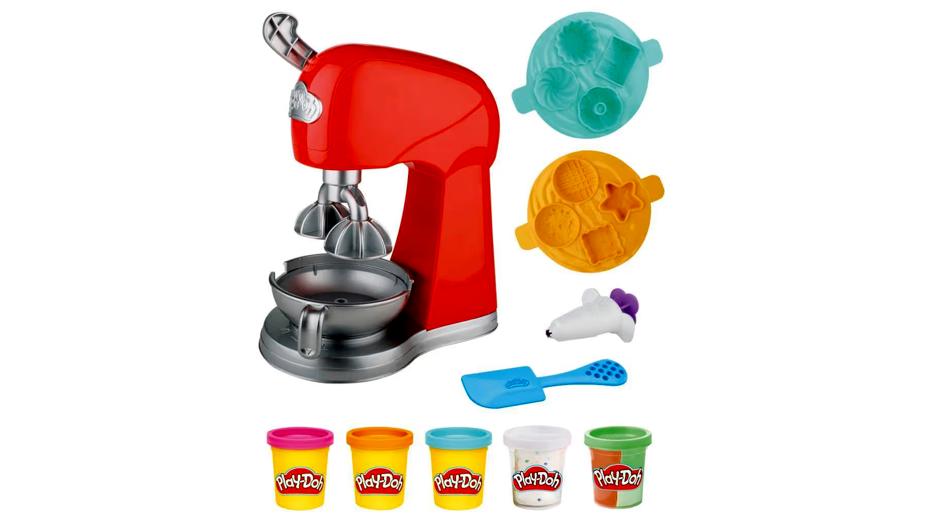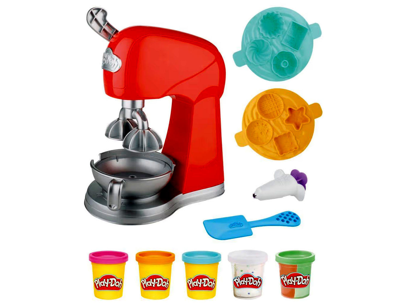 A csomag tartalma: álló mixer játékkészlet levehető táljal, 1 préselő, 1 spatula tartozék, 2 tálca forma és 5 tégely Play-Doh gyurma (nettó súly 283 g)