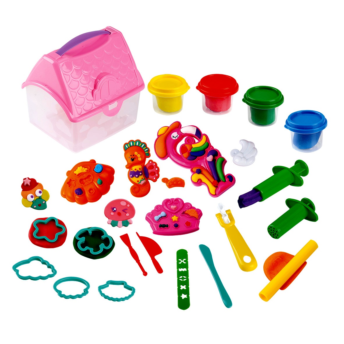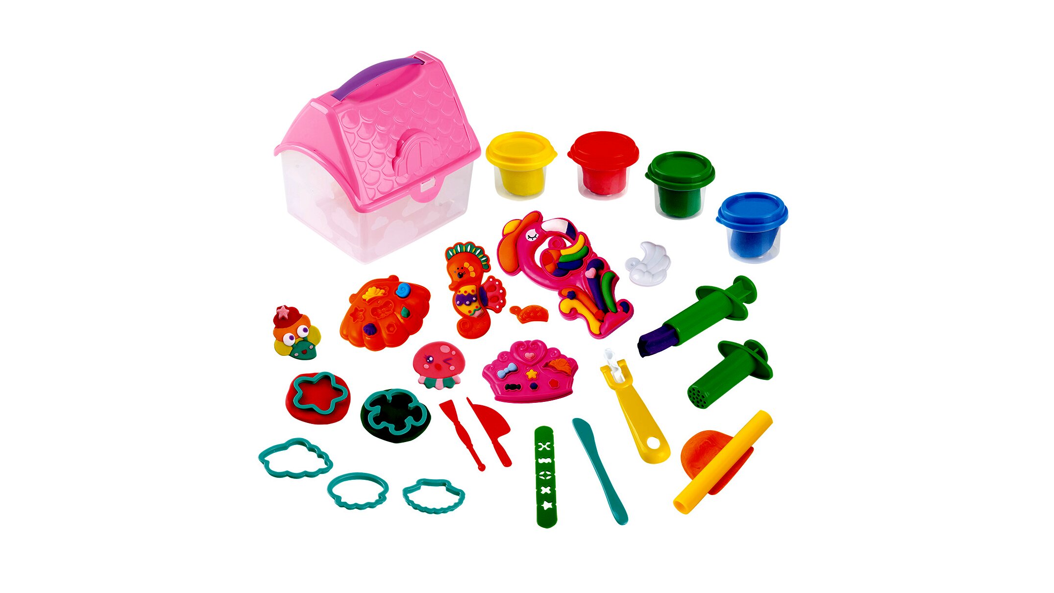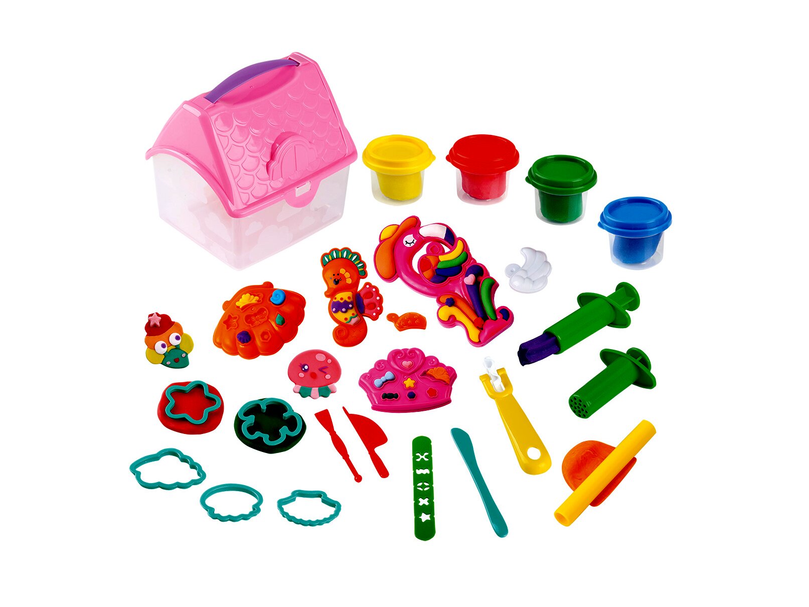A házikó 4 tégely, színes gyurmát, korona és flamingó sablonokat, kiegészítőket és formázókat is tartalmaz.