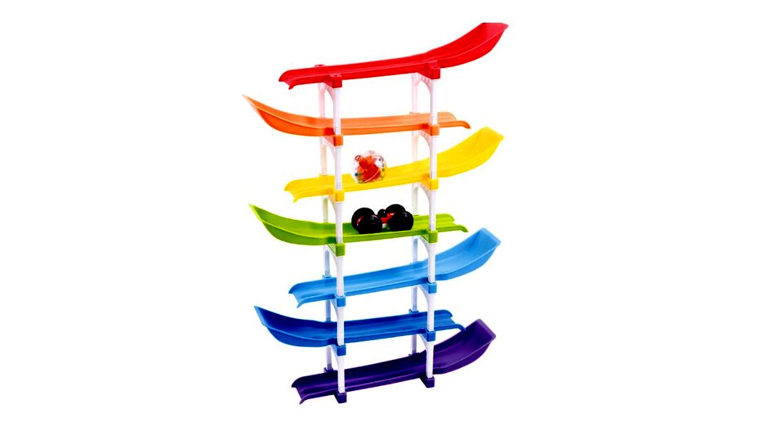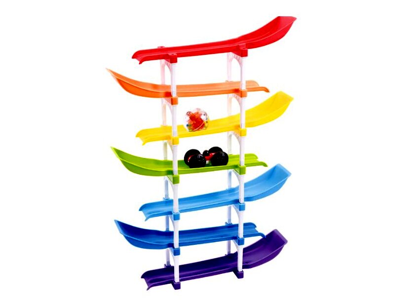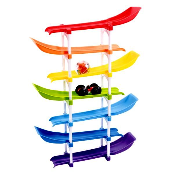 A Playgo szivárvány torony autó- és golyócsúszka egy 7 emeletes babajáték, amely játékosan fejleszti a legkisebbek motorikus készségeit. A csomagban megtalálható golyó csörgő hangot adva gurul szintről szintre, a kisautó pedig minden egyes szint végén átfordul, és így gurul tovább. A gyerekek akár egyszerre is elindíthatják az autót és a labdát. Vajon melyik ér majd le gyorsabban?A golyópálya élénk színei játékra hívják a gyerekeket, emellett a kicsik játékosan tapasztalhatják meg, hogy mit jelent a gyorsulás.