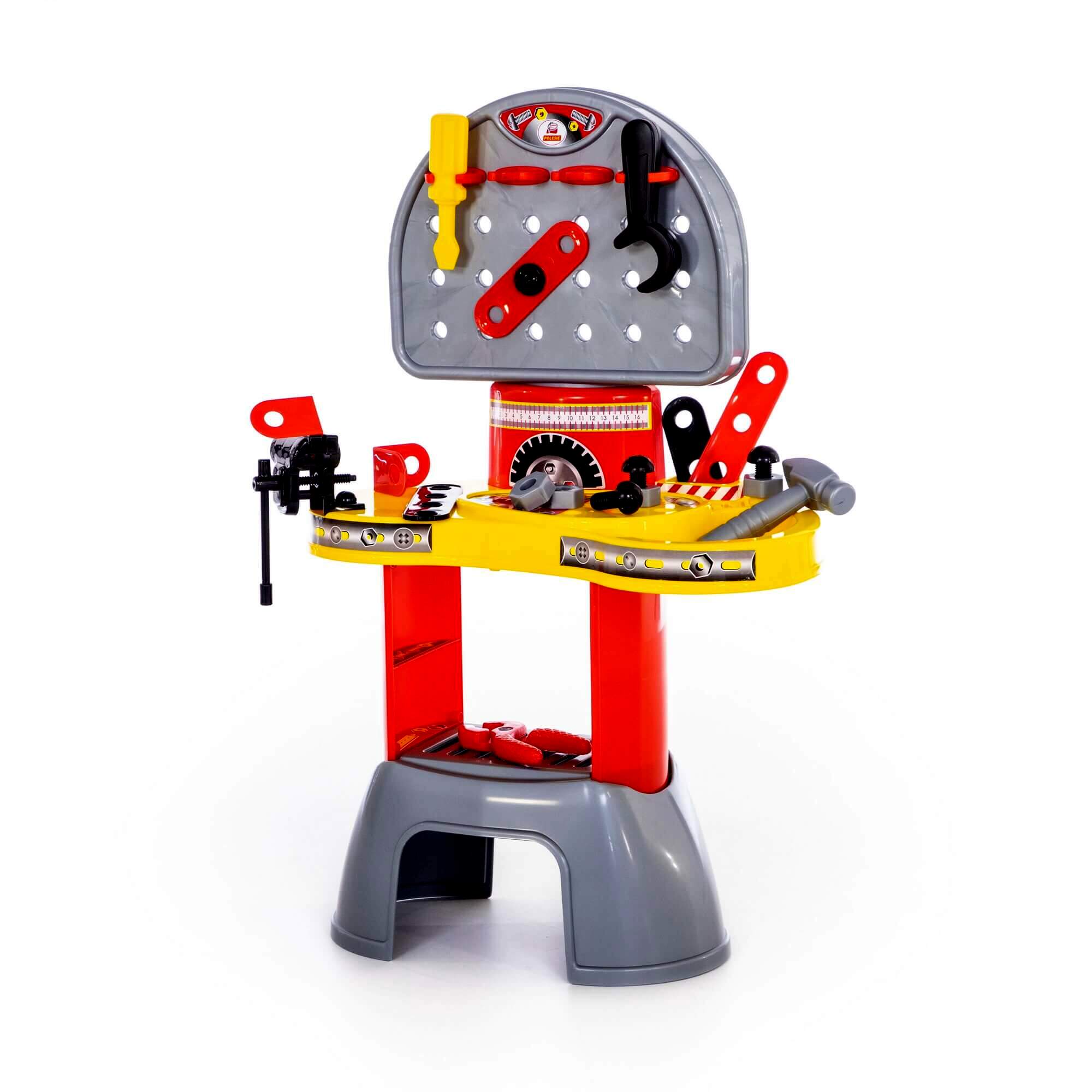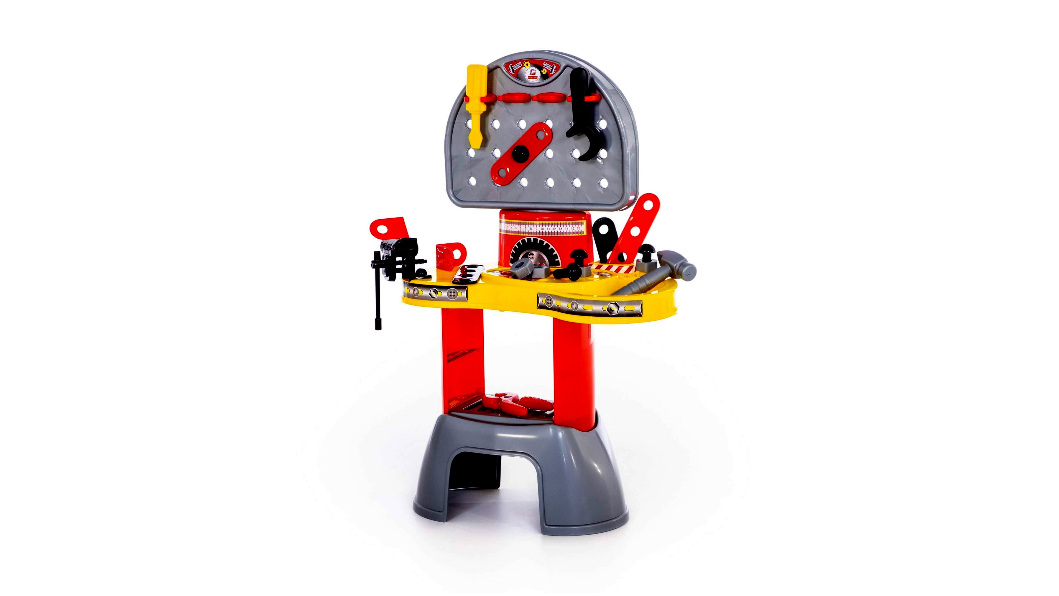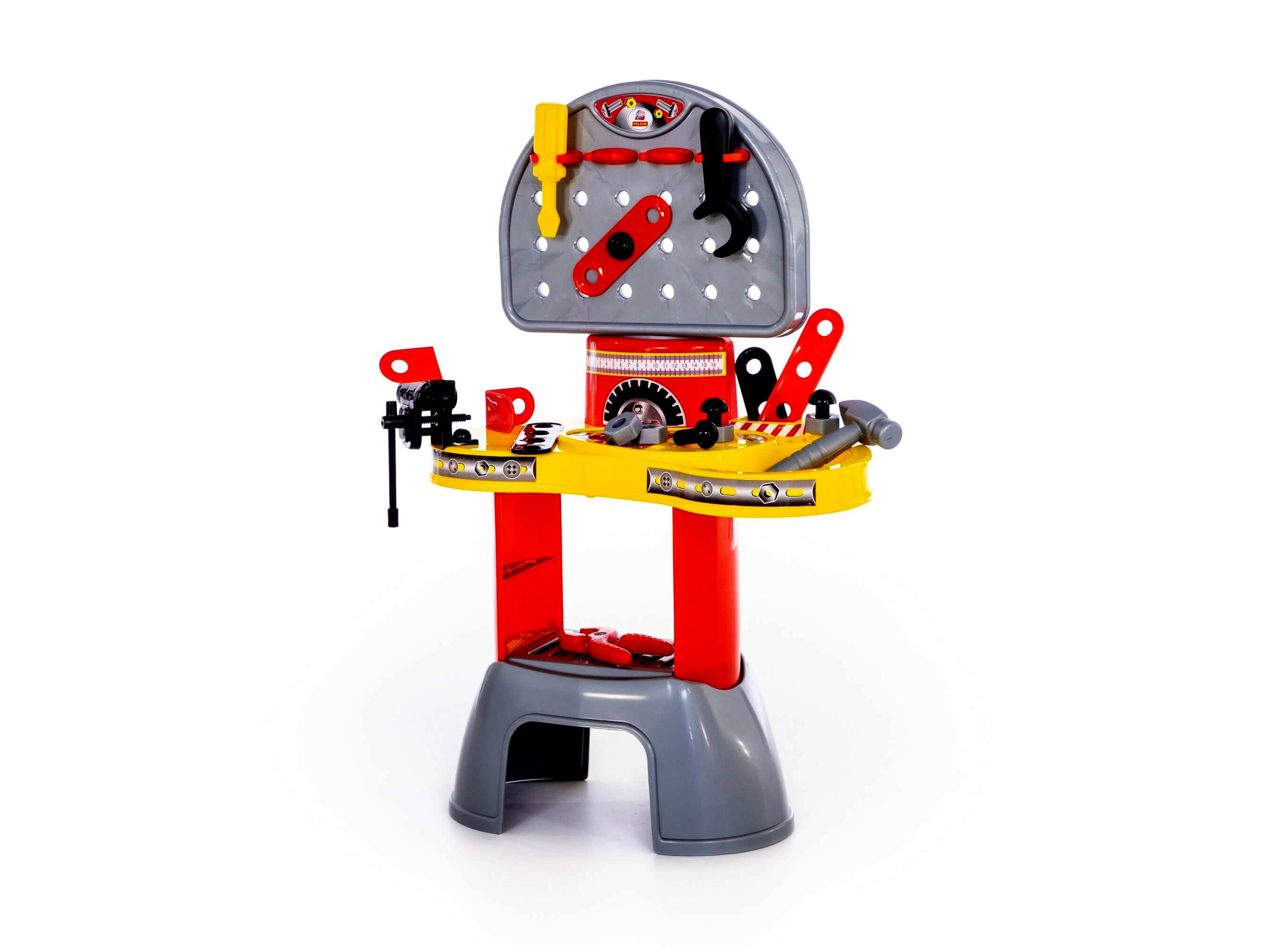 - A Polesie márkájú barkácsasztal egy nagyobb méretű, piros, sárga és szürke színű szerszámos barkácsműhely mindenféle eszközzel felszerelve