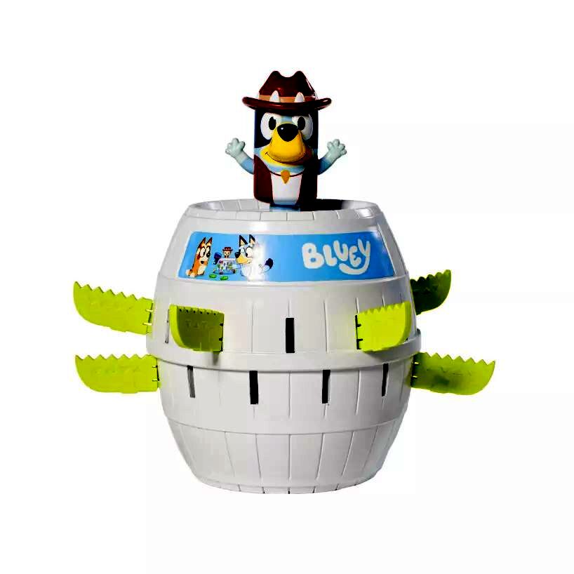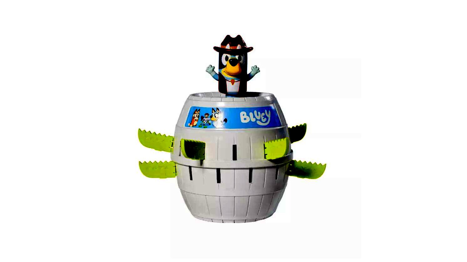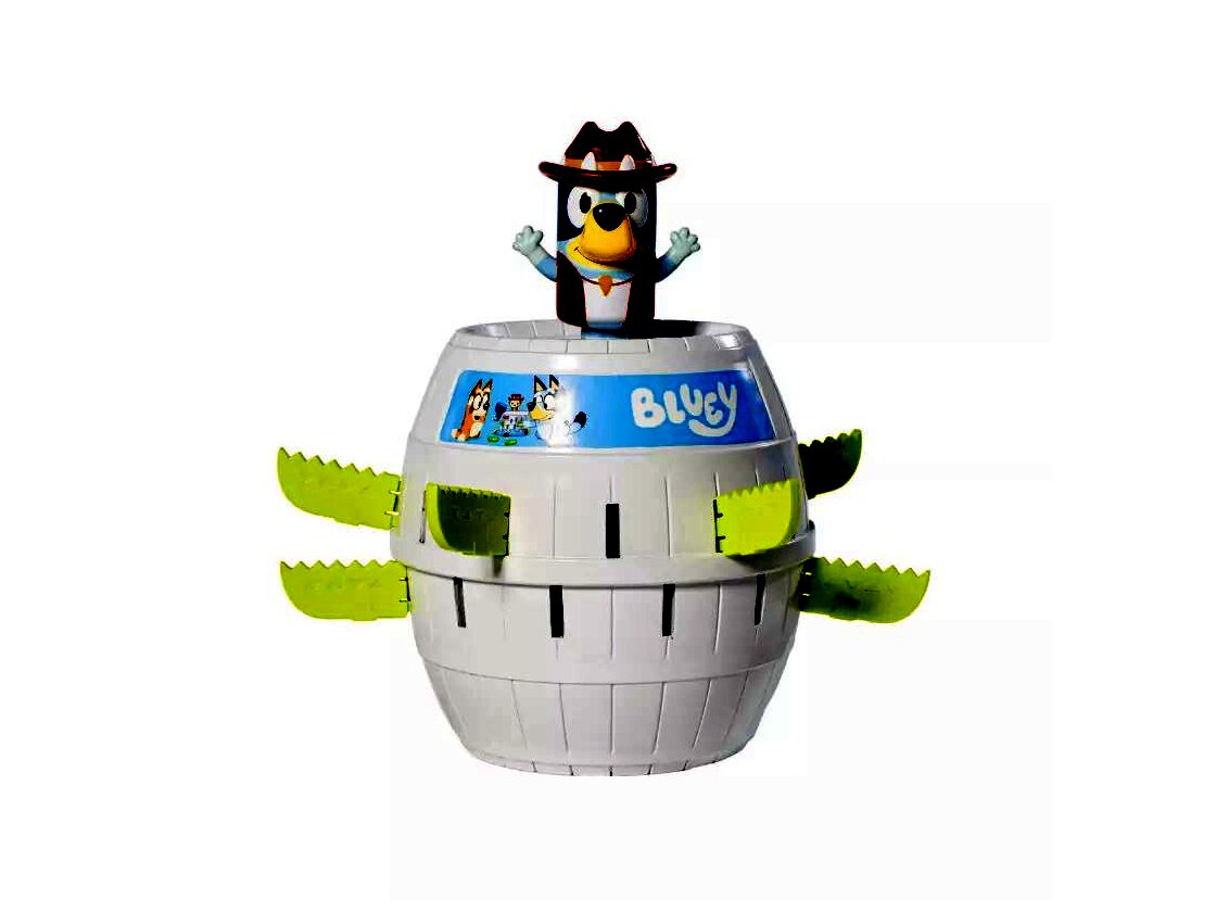 A Pop Up Bluey egy pörgős, egyszerűen tanulható társasjáték, ahol a játékosok felváltva krokodil alakú rudakat helyeznek Bluey hordójába. Ha valaki a „veszélyes” nyílást találja el, Bluey kiugrik a hordóból, és az adott játékos kiesik – így minden kör új meglepetést tartogat.