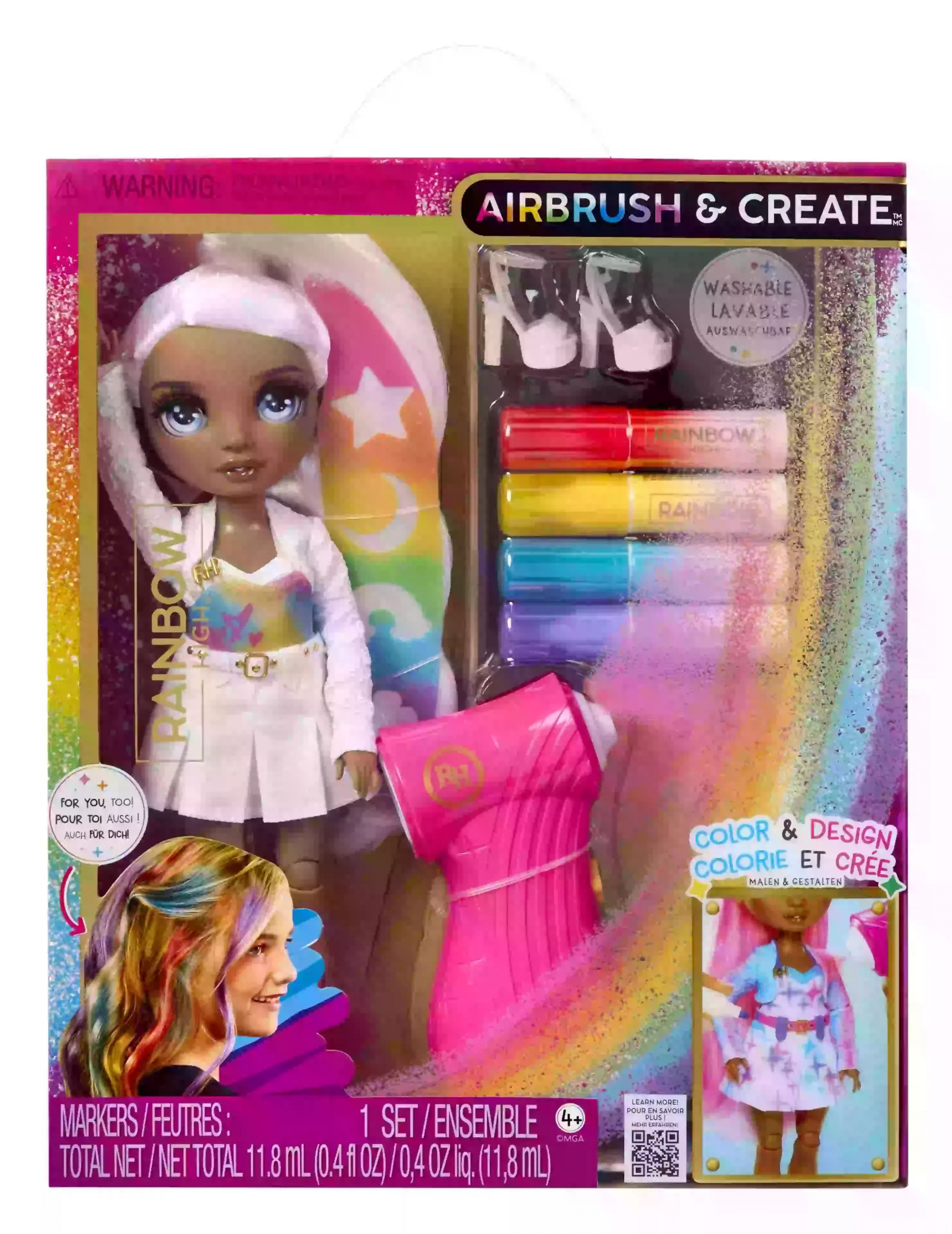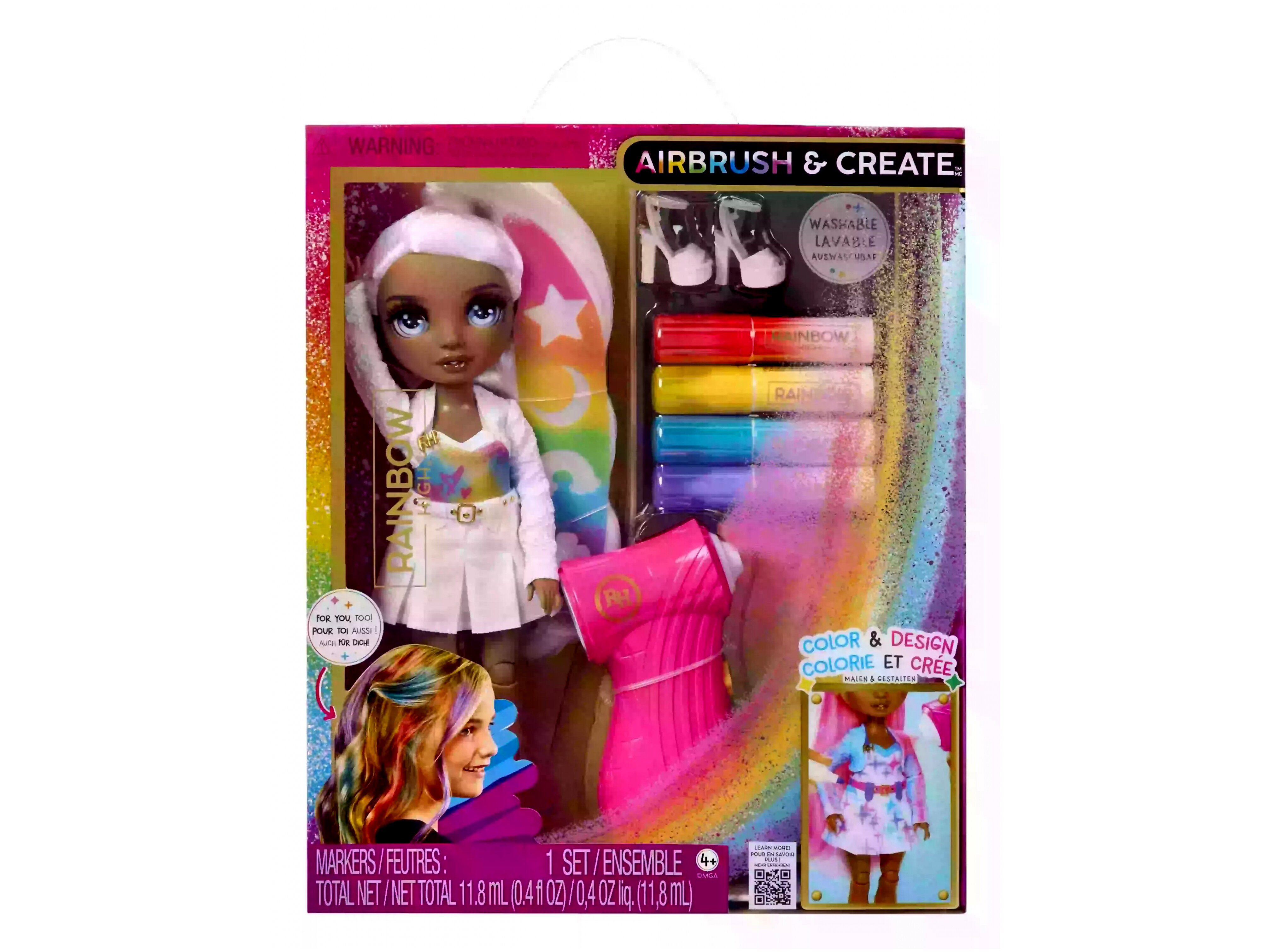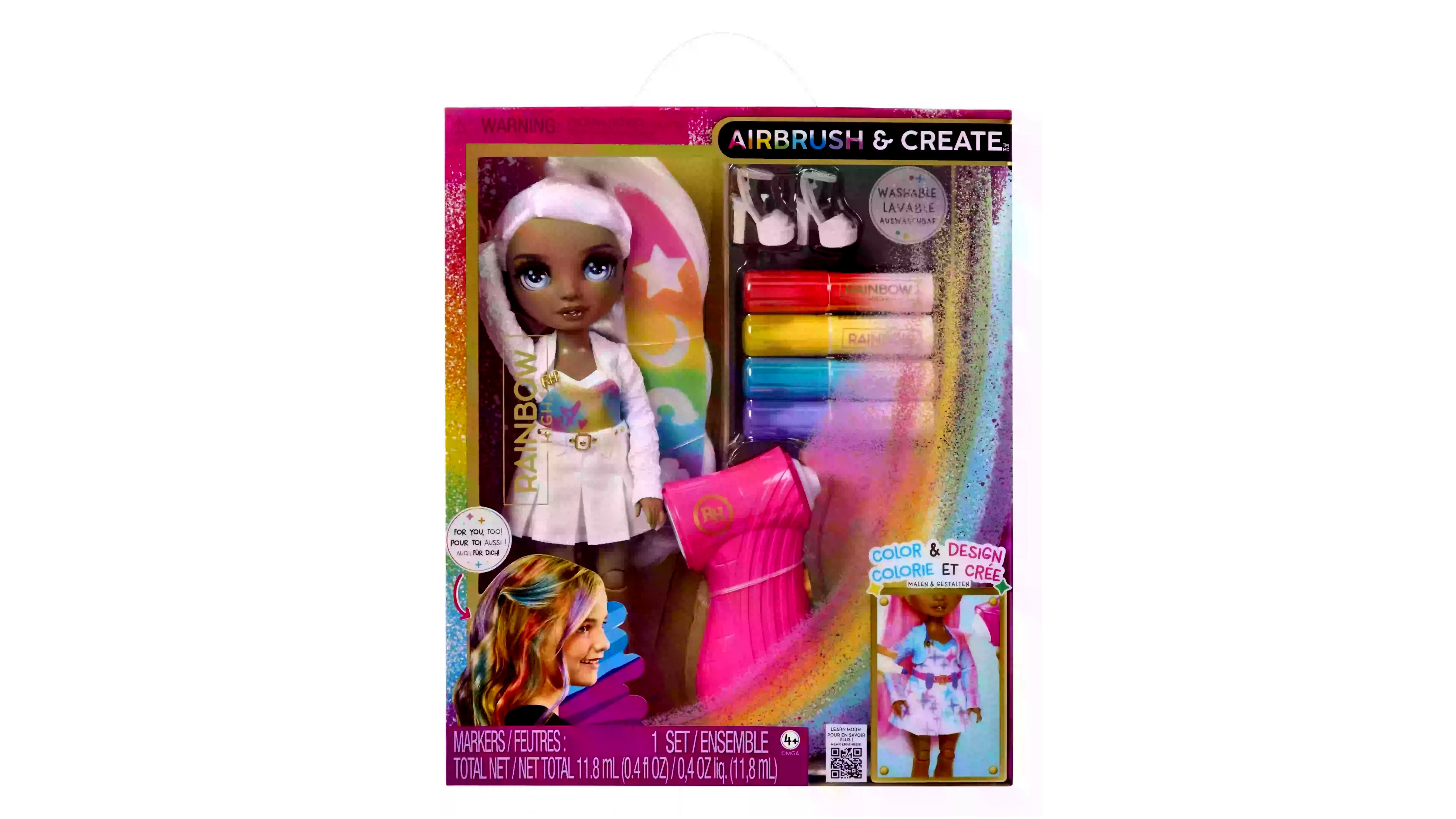 A készlet tartalmaz egy színezhető babát, amelynek fehér haja és ruhája mosható. A mellékelt színes tollakkal a gyerekek különféle mintákat és dizájnokat hozhatnak létre, amelyek mosás után újra és újra megismételhetők.
