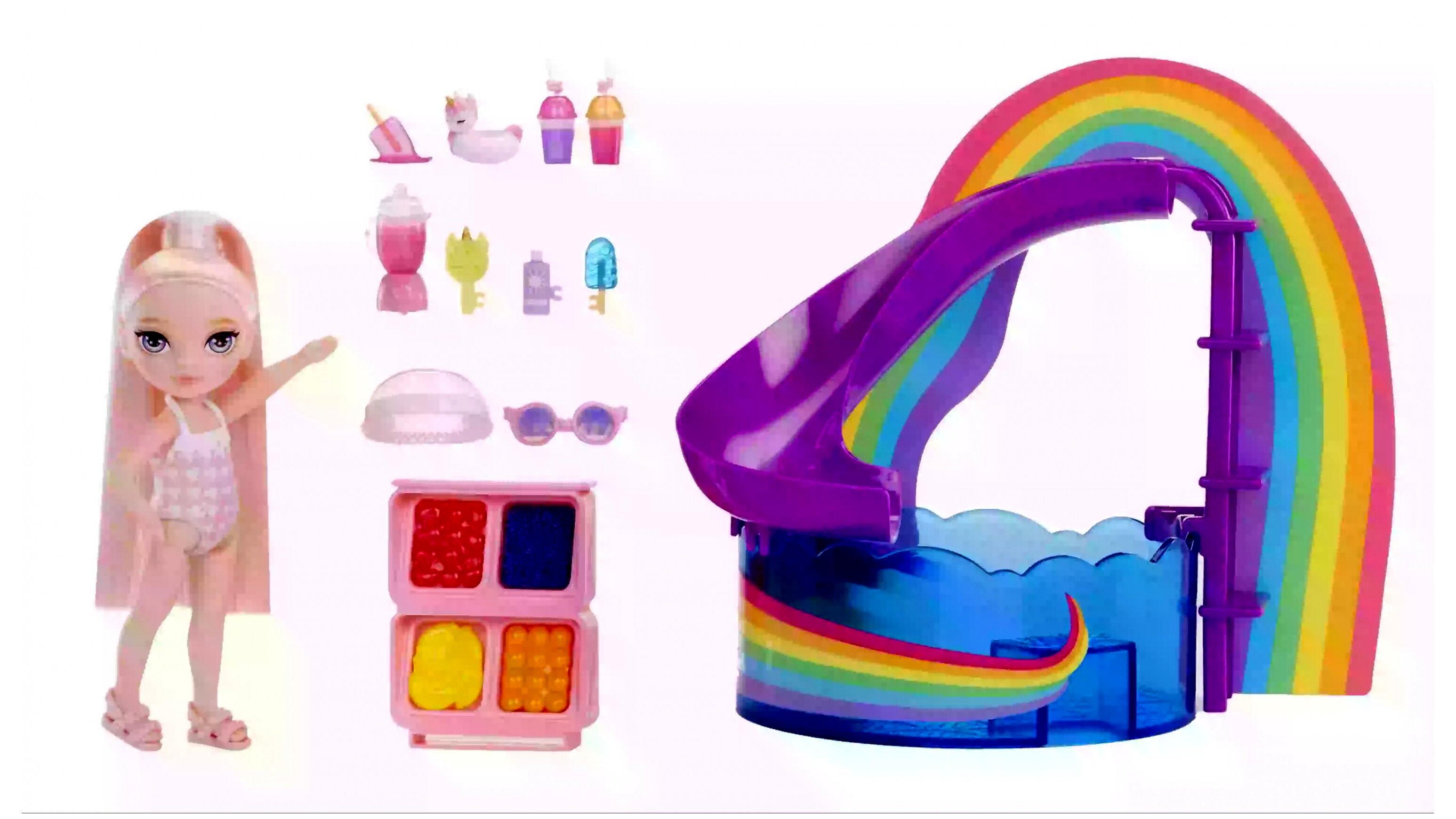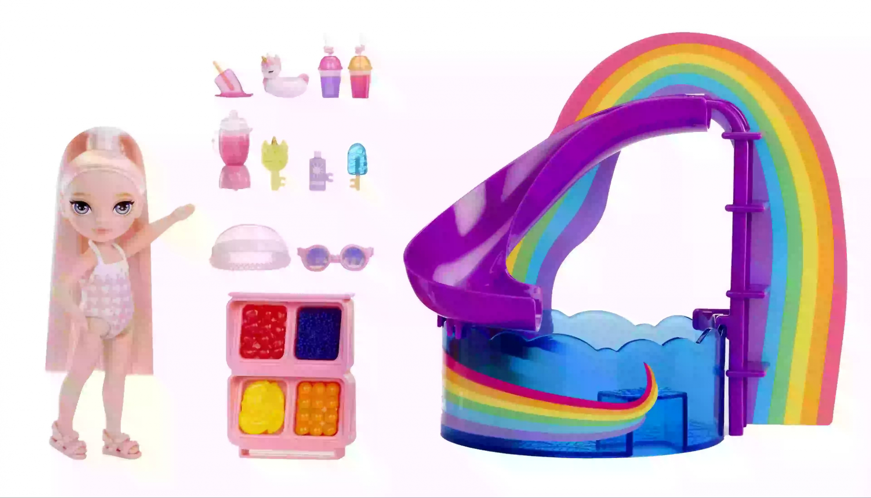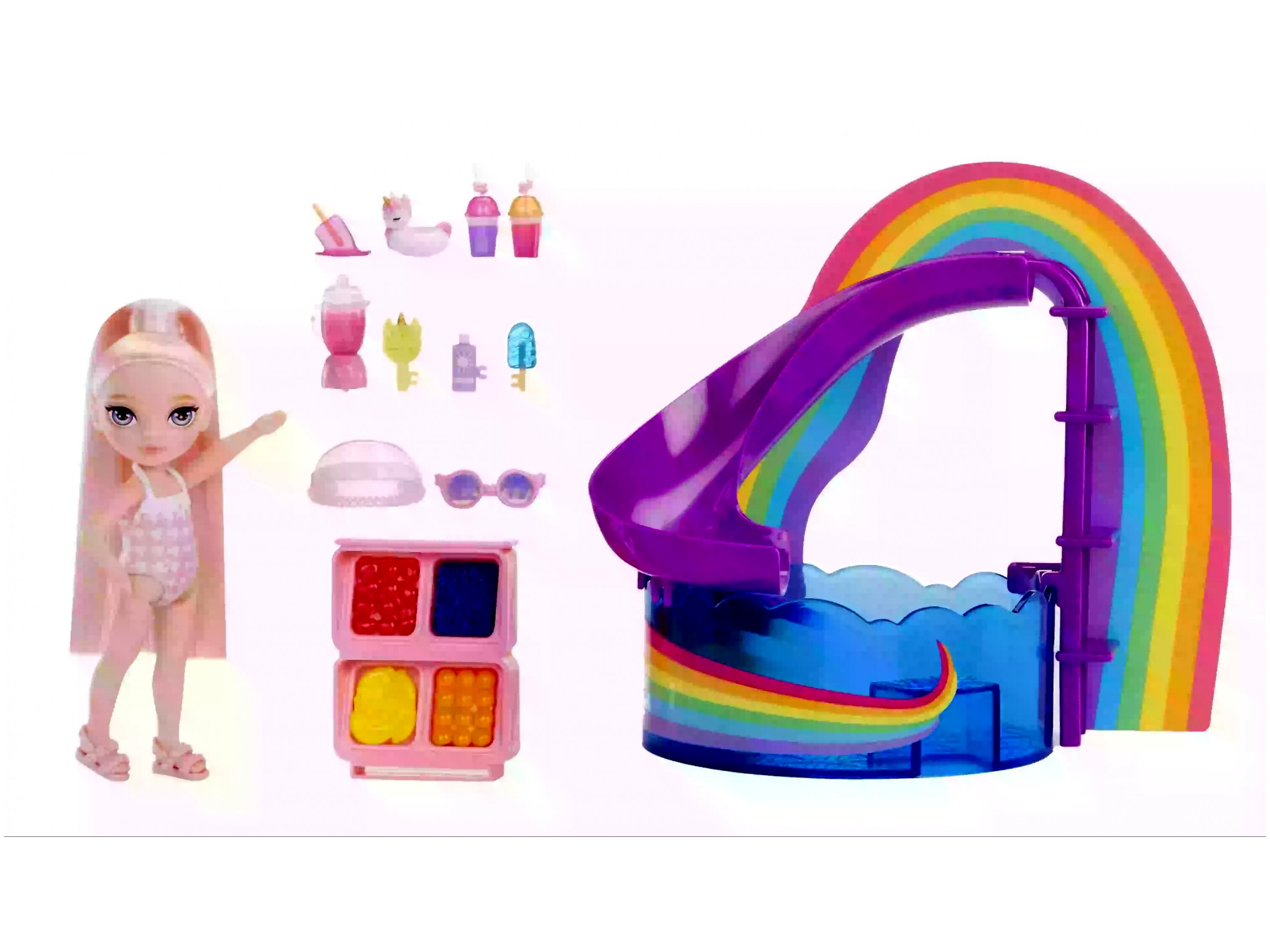 A gyerekek egy igazi medencés partin érezhetik magukat ezzel a játékszettel. A csúszdázás és csobbanás után a strandolni vágyókat a koktélbár várja, ahol frissítő italok és ínycsiklandó fagylaltok találhatók. A játékszett menő kiegészítőket is tartalmaz, hogy a strandon stílusos babával játszhassanak a kicsik.A csúszda szivárványos panellel rendelkezik, a bárban pedig fagylaltos pult és italkészítő eszközök is találhatók.