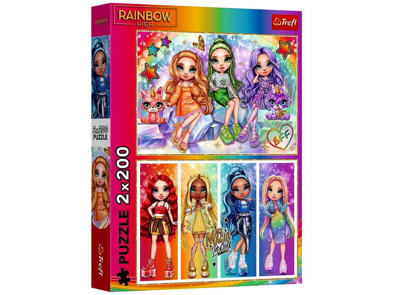 Prémium minőségű, 2 x 200 darabos puzzle a Szivárvány babák rajongóknak! A puzzle darabjai tökéletesen illeszkednek egymáshoz. Kicsik és nagyok számára egyaránt izgalmas és szórakoztató időtöltés, amelyet egyszerűen képtelenség megunni.A puzzle szétszedhető, majd újra összerakható, ha pedig összeragasztjuk a darabokat, bekeretezve akár a szoba dísze is lehet. A puzzle játékok nem csak a memóriát, a megfigyelő- és a koncentrációs képességet fejlesztik, türelemre és kitartásra is tanítanak.