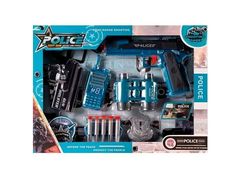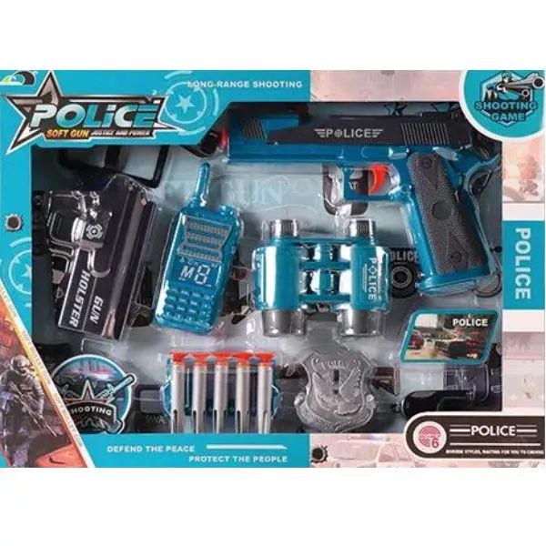 A gyerekek igazi kis rendőrökké válhatnak ezzel a rendőrségi felszerelés szettel. A készlet tartalmazza a szükséges eszközöket egy tökéletes szerepjátékhoz, mint például az adóvevő, távcső, jelvény, szivacslövő fegyver és lövedékek vagy fegyvertartó. Játék közben fejlődik a gyerekek képzelőereje és kreativitása.A termék jellemzői: