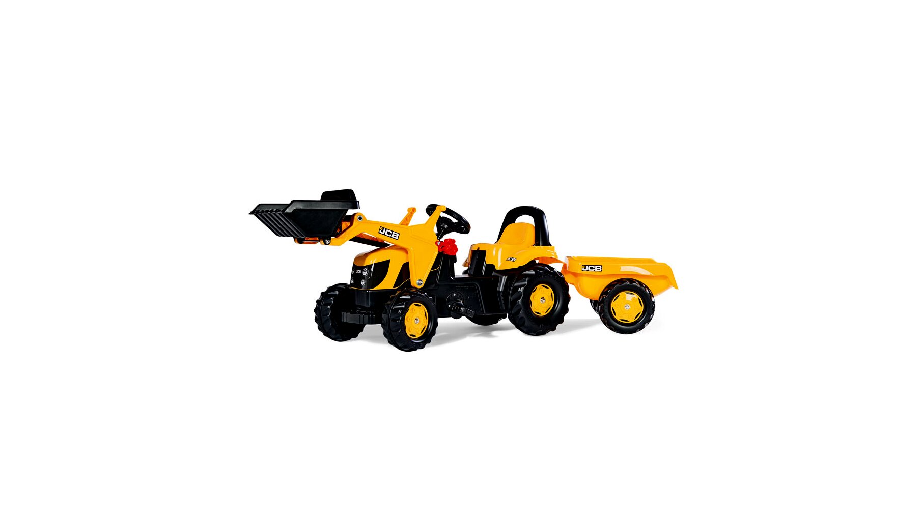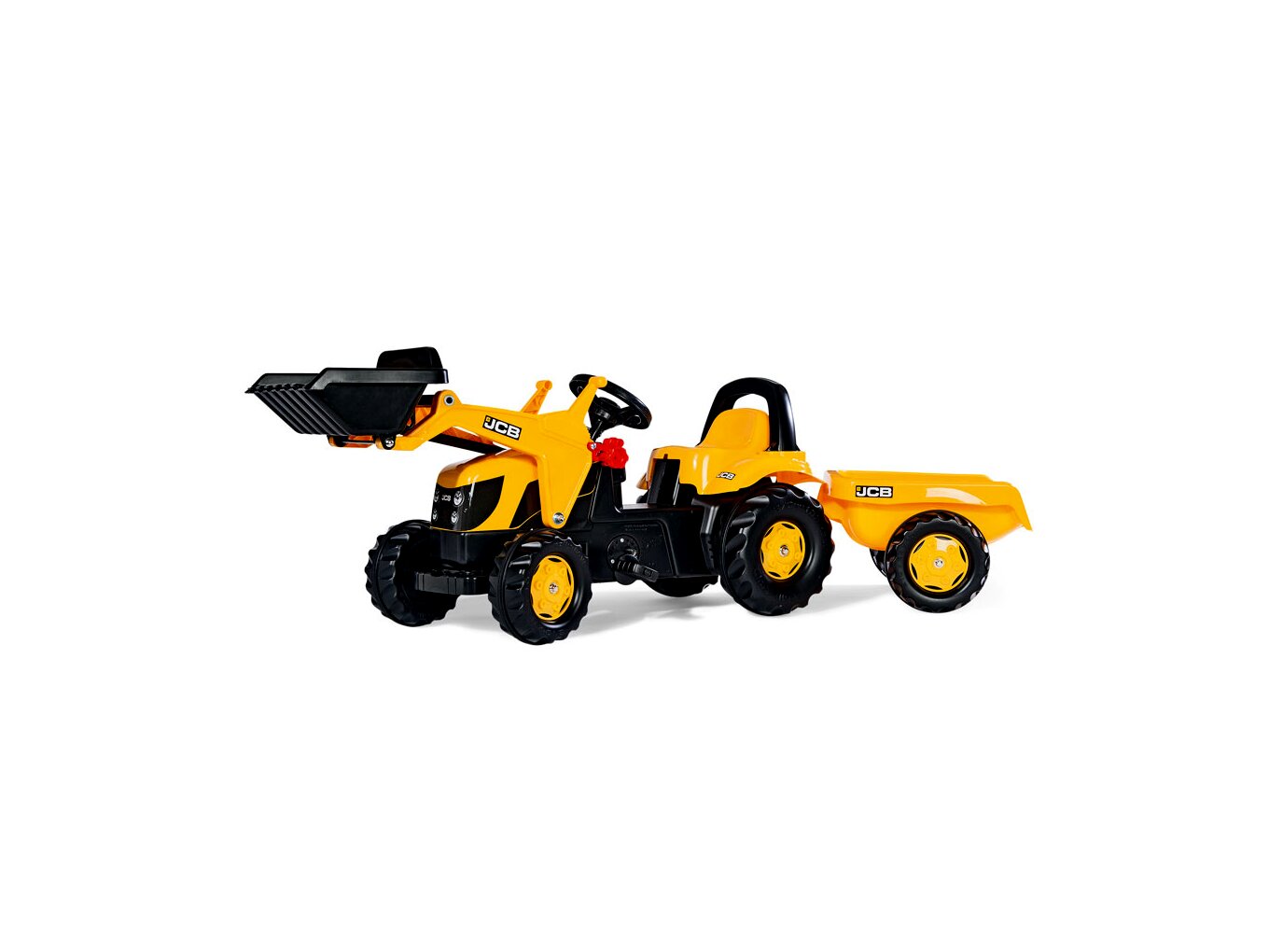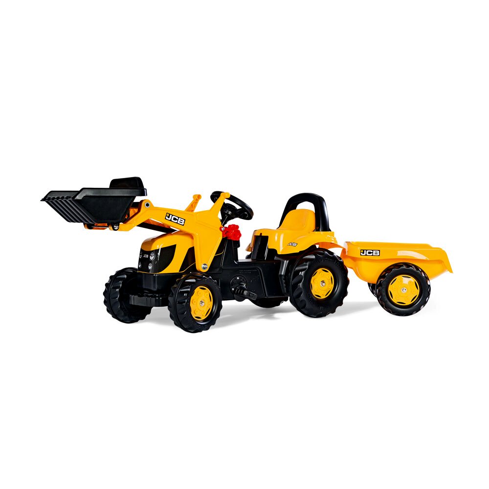 Kiváló minőségű, Rolly Kid JCB márkájú pedálos markolós traktor utánfutóval. A markoló és utánfutó rész könnyen le és felszerelhető. A láncszerkezet rejtett, így a traktor még biztonságosabb. A traktor motorházteteje felhajtható.