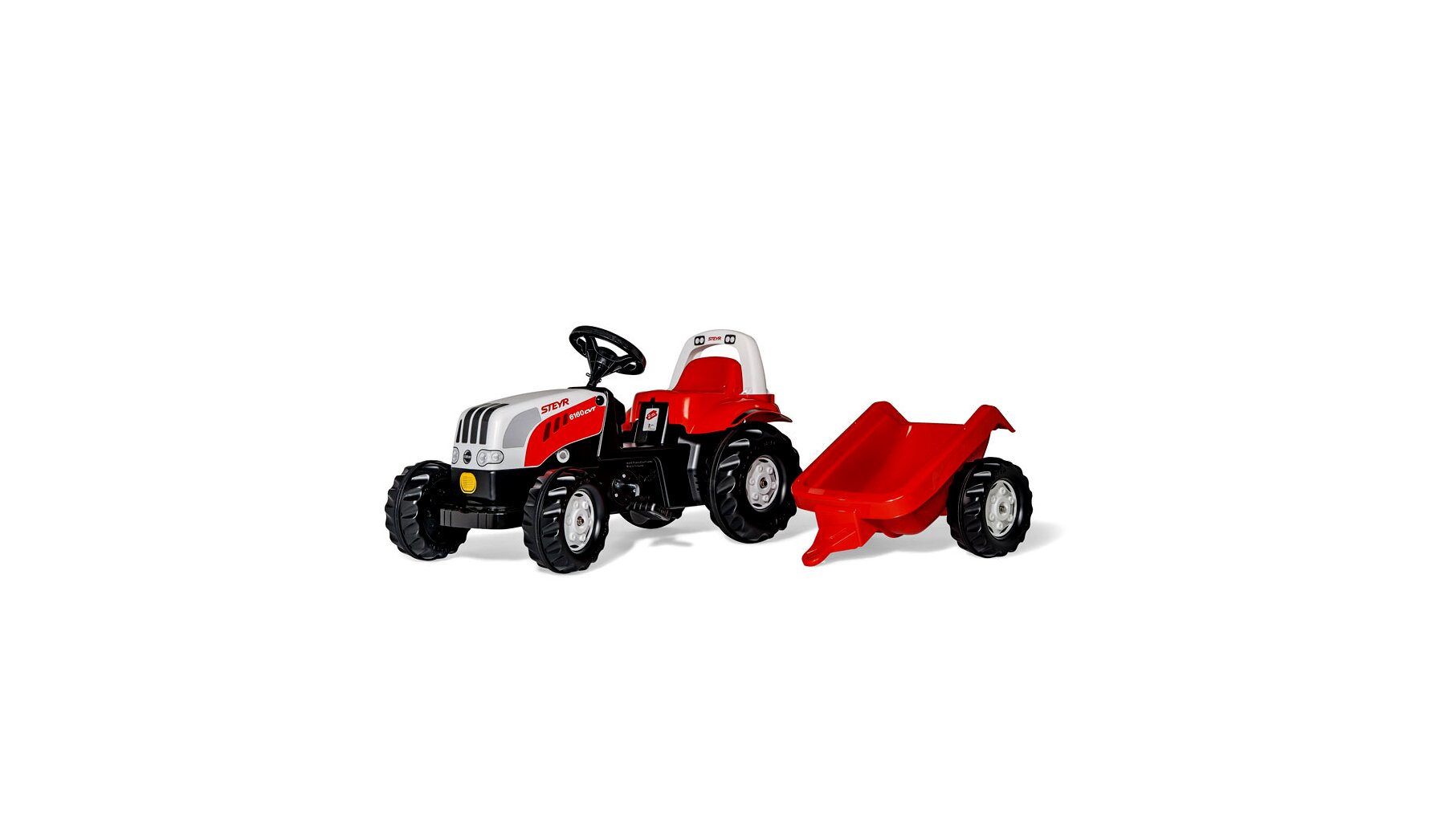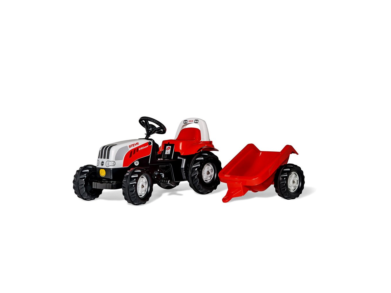 Kiváló minőségű, Rolly Kid Steyr 6160 CVT márkájú pedálos traktor utánfutóval. A utánfutó rész könnyen le és felszerelhető. A láncszerkezet rejtett, így a traktor még biztonságosabb. A traktor motorházteteje felhajtható.