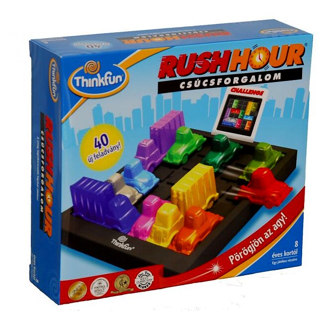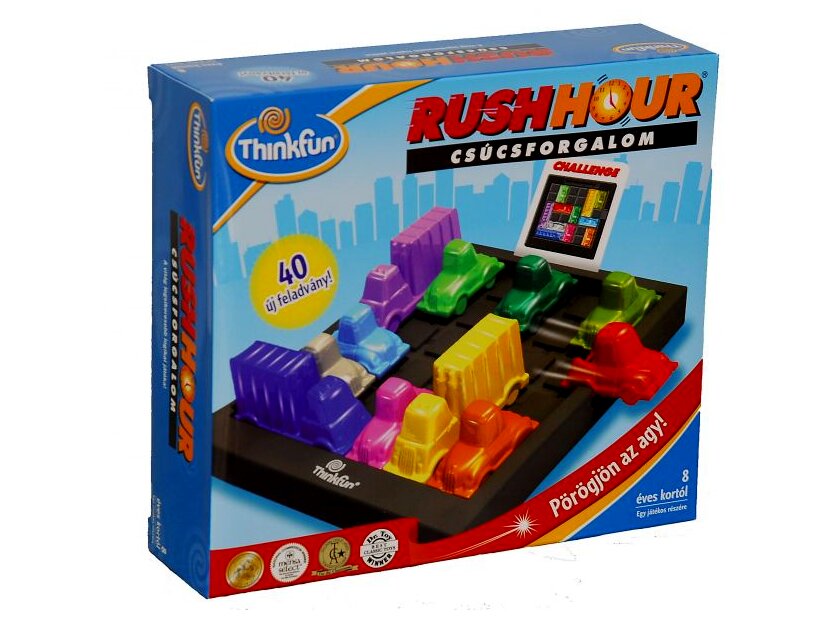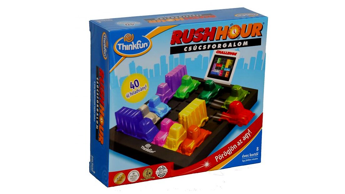 A Rush Hour logikai játék a hétköznapjainkból már megszokott csúcsforgalomba és közlekedési dugókba kalauzol minket, ahol a cél a feladatkártyák alapján felállított járművek között ellavírozni úgy, hogy nem emelhetjük fel egyiket sem, csak csúsztathatjuk őket a tábla mentén.