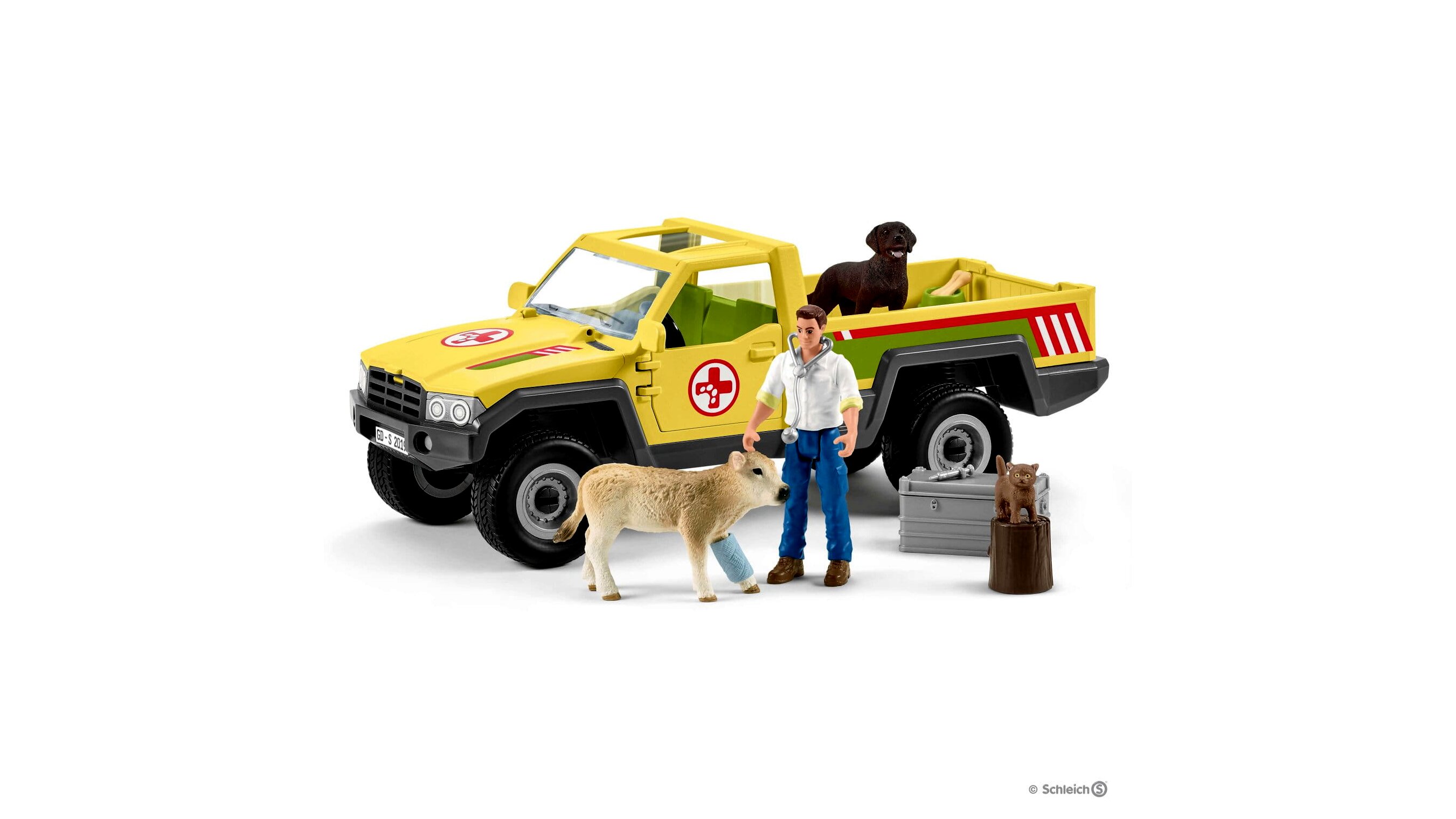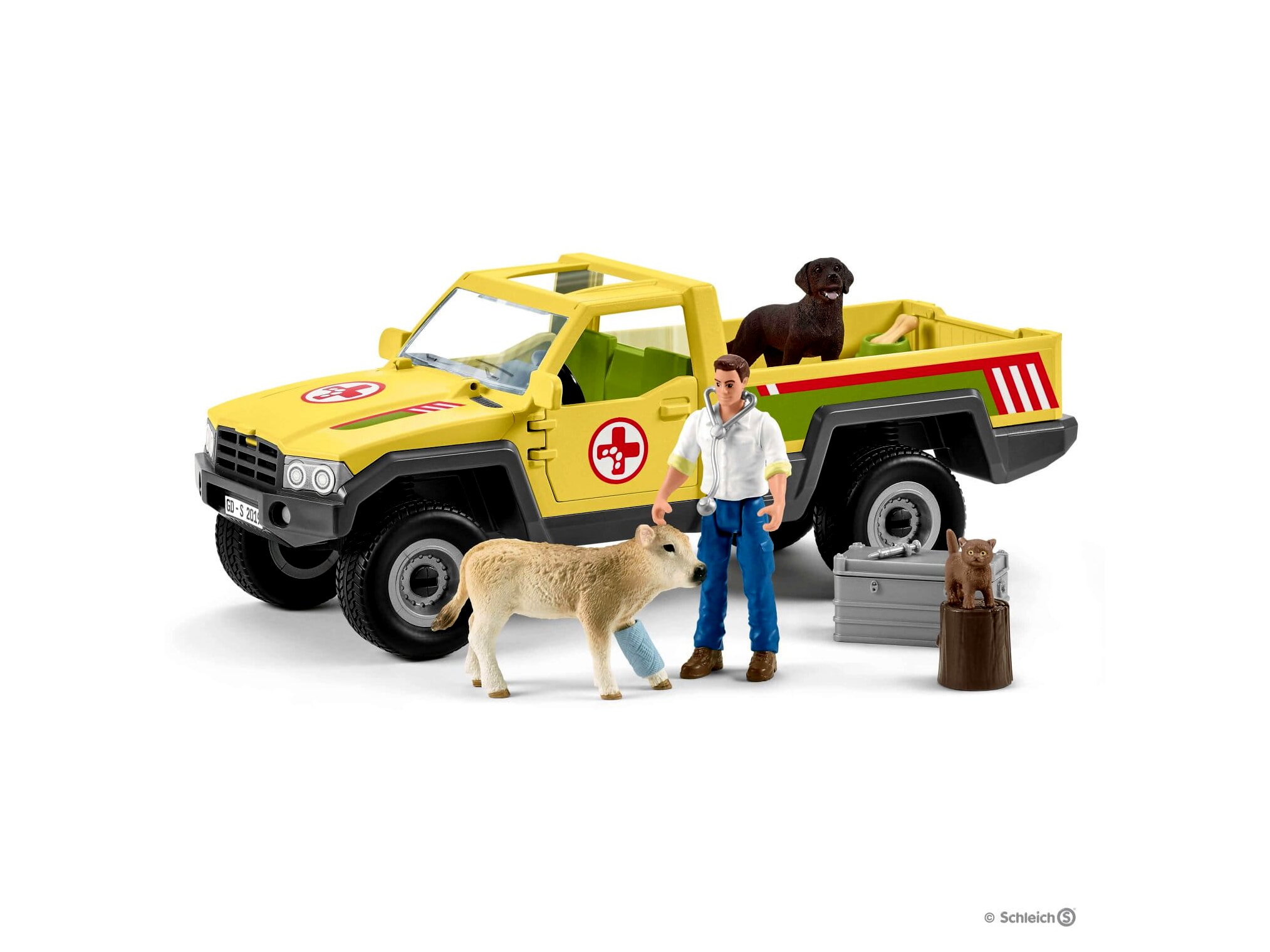 Csomag tartalma: 1 db pick-up autó, 1 db állatorvos figura, 1 db borjú figura, 1 db Labrador Retriever kutya figura, 1 db cica figura, 1 db alumínium doboz, 1 db sztetoszkóp, 1 db kötszer, 1 db tál, 1 db csont, 1 db fatörzs, 1 db matrica lap.