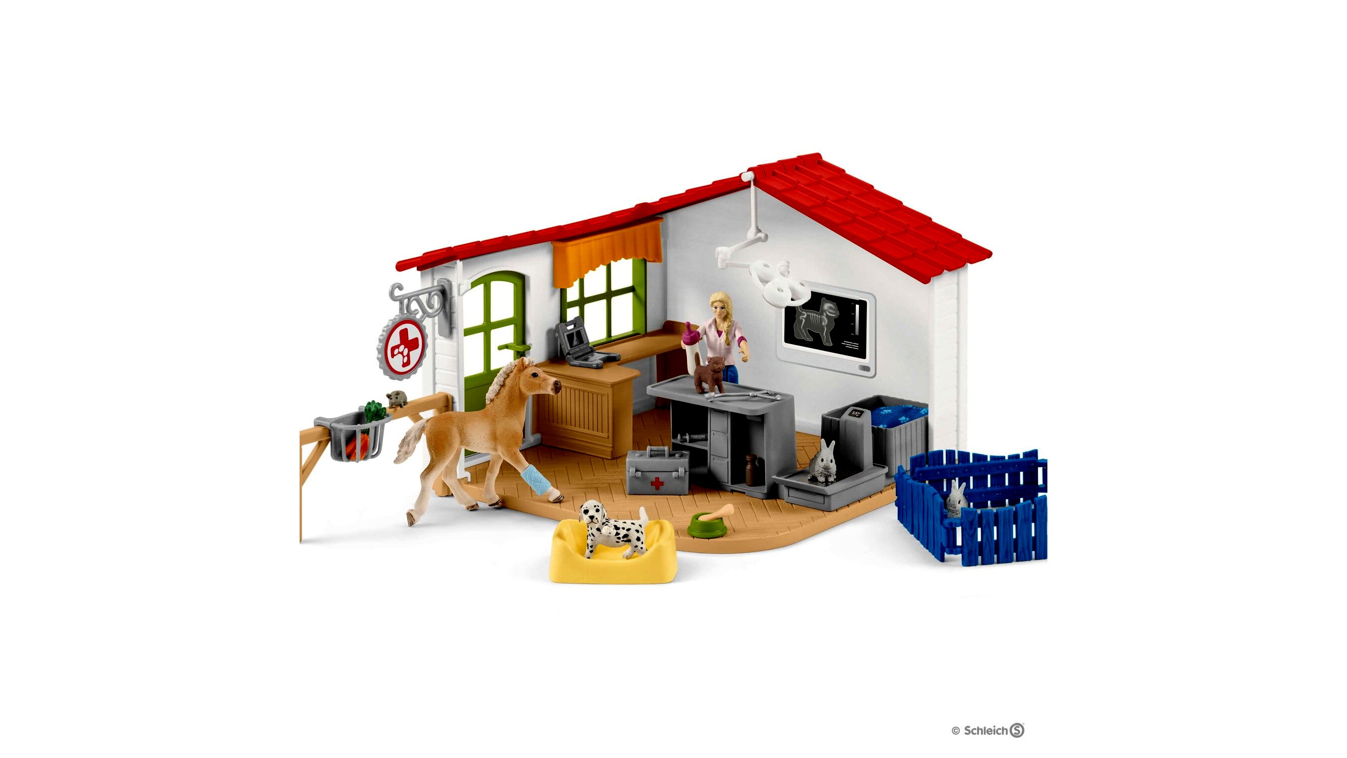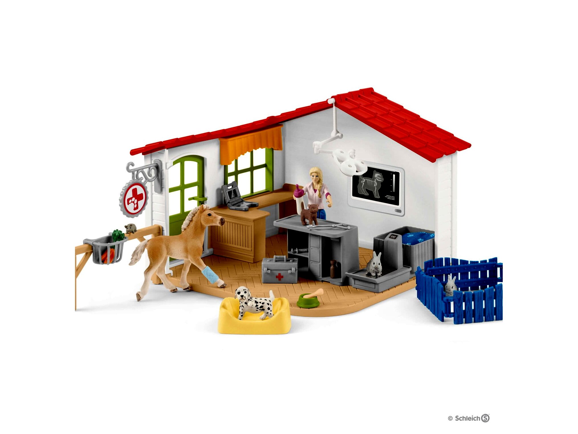 Csomag tartalma: 1 állatorvos figura mozgatható végtagokkal, 1 Haflinger csikó, 1 dalmata kiskutya, 1 cica, 2 nyúl, 1 egér, 1 kutyakosár, 1 takaró, 1 etetőtál, 1 ivópalack, 1 etetőállvány, 1 csont, 1 sárgarépa, 1 laptop , 1 állatorvosi eset, 1 gyógyszerpalack, 1 sztetoszkóp, 1 fecskendő, 2 kötszer, 4 kerítés darab