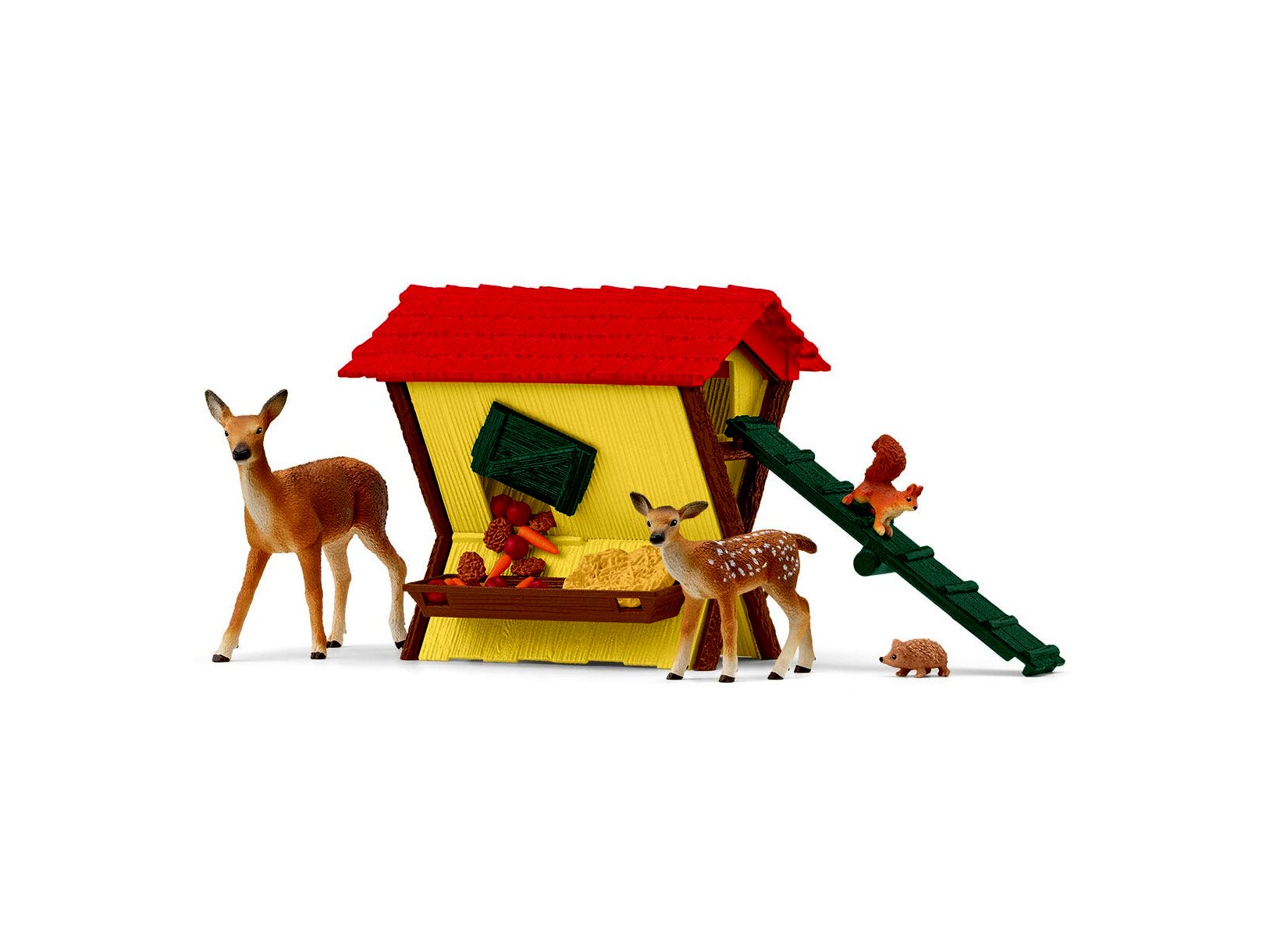A készlet részei között megtalálható egy nőstény őz, őzgida, mókus és sün, akik mindannyian az erdei etetőállomáson gyűlnek össze. A levehető tetős etető könnyen hozzáférhetővé teszi az állatfigurákat és a kiegészítőket, így gördülékenyen alakulhatnak a kalandos történetek.