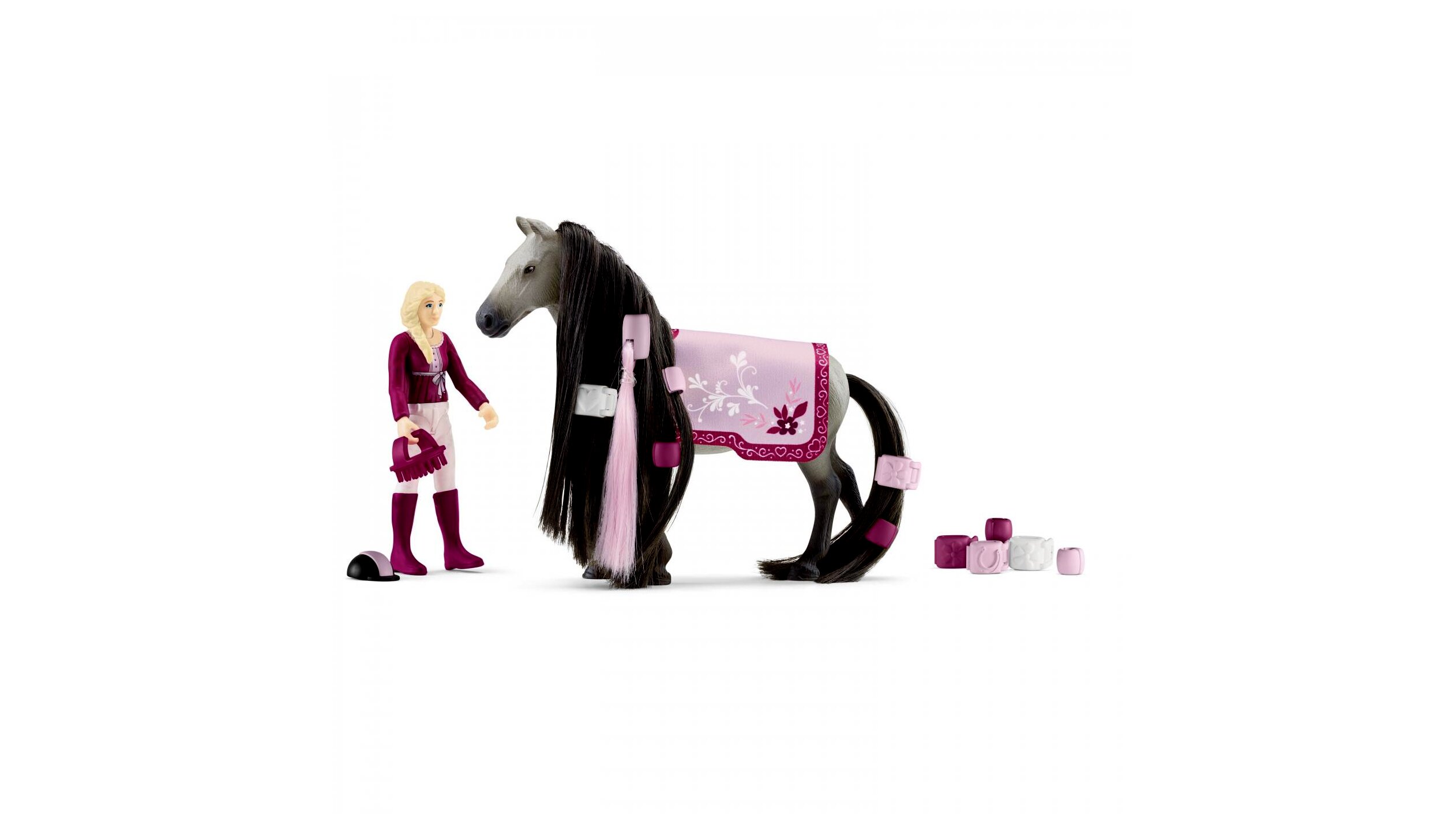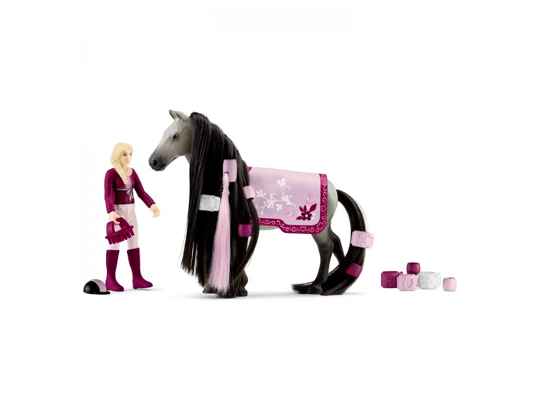 A Schleich Horse Club különleges újdonsággal kedveskedik a rajongóinak. A Sofia és Dusty kezdő készletben egy fésülhető sörényű szürke ló és egy lovas lány is megtalálható. A gyerekek eljátszhatják és megtanulhatják, hogyan kell gondozni egy lovat. Sörényébe és hosszú lófarkába csatokat és díszeket tehetnek, felkészíthetik a díszes nyeregtakaróval egy bemutatóra. A lovas végtagjai mozgathatóak, így ráültethető a lóra, valamint az elengedhetetlen kobakot is a fejére lehet tenni.A figurát pici kezekre tervezték, remekül fejleszti a kreativitást és a képzelőerőt. A játék biztonságos, jó minőségű gumi-műanyag ötvözetből készült.