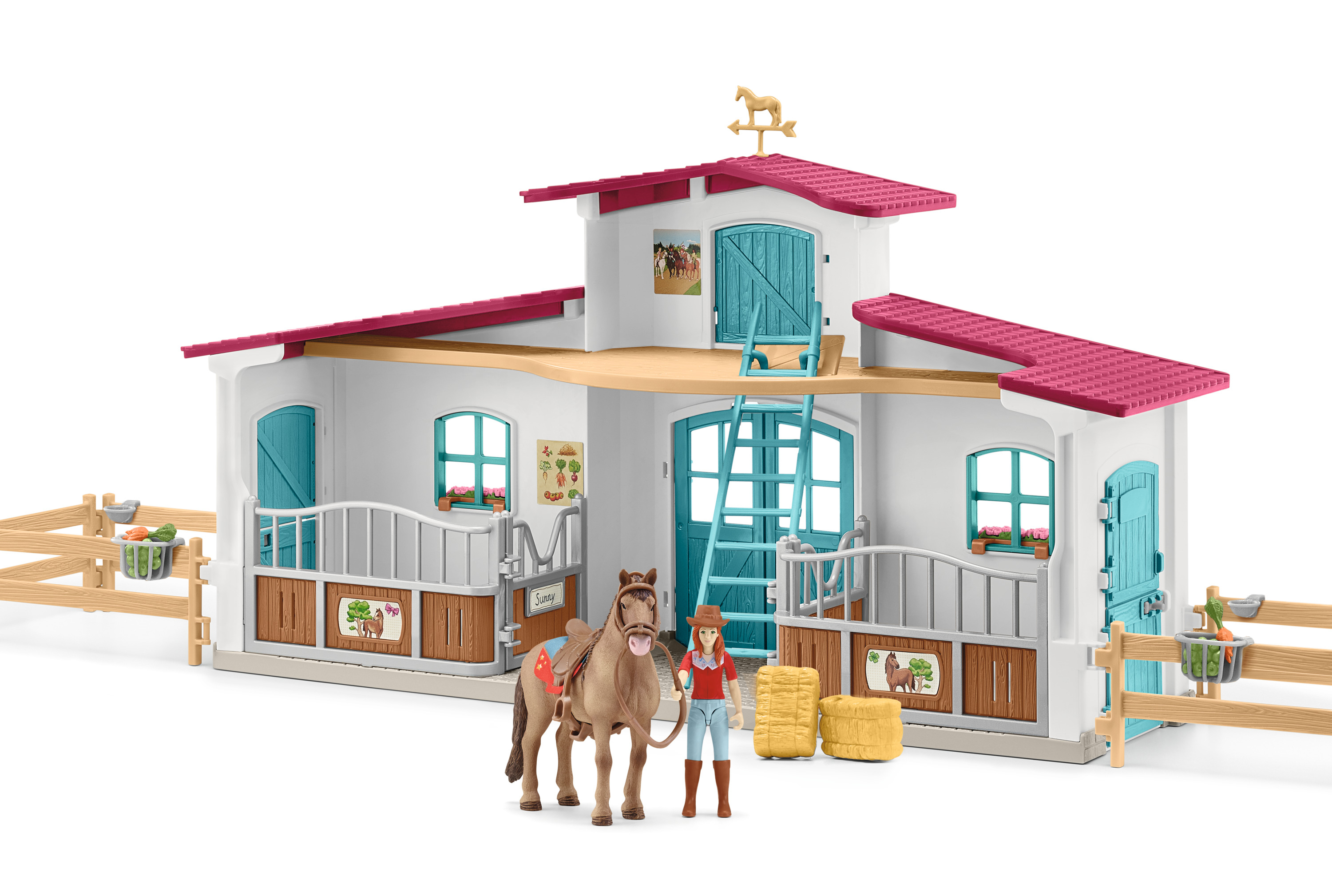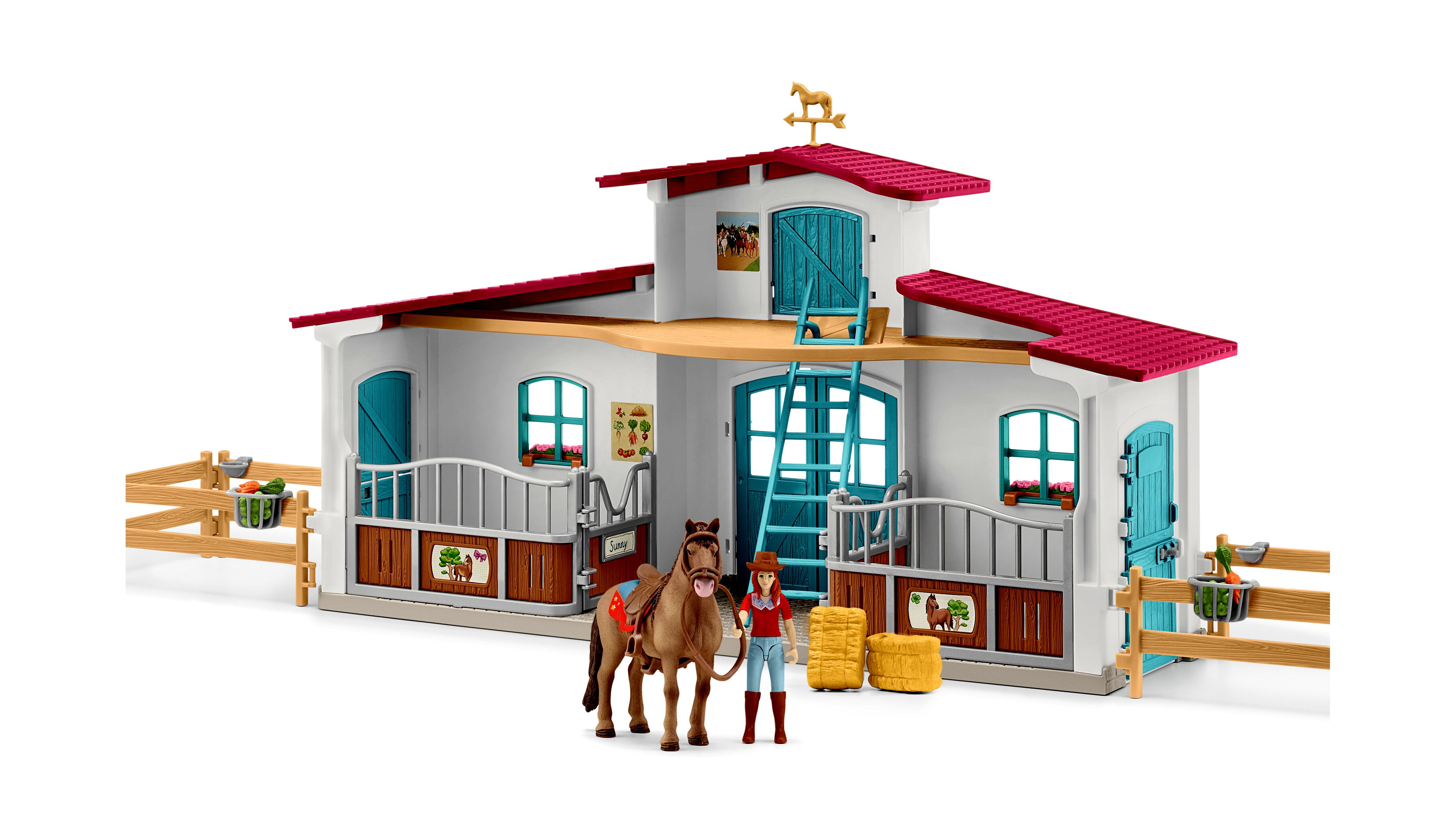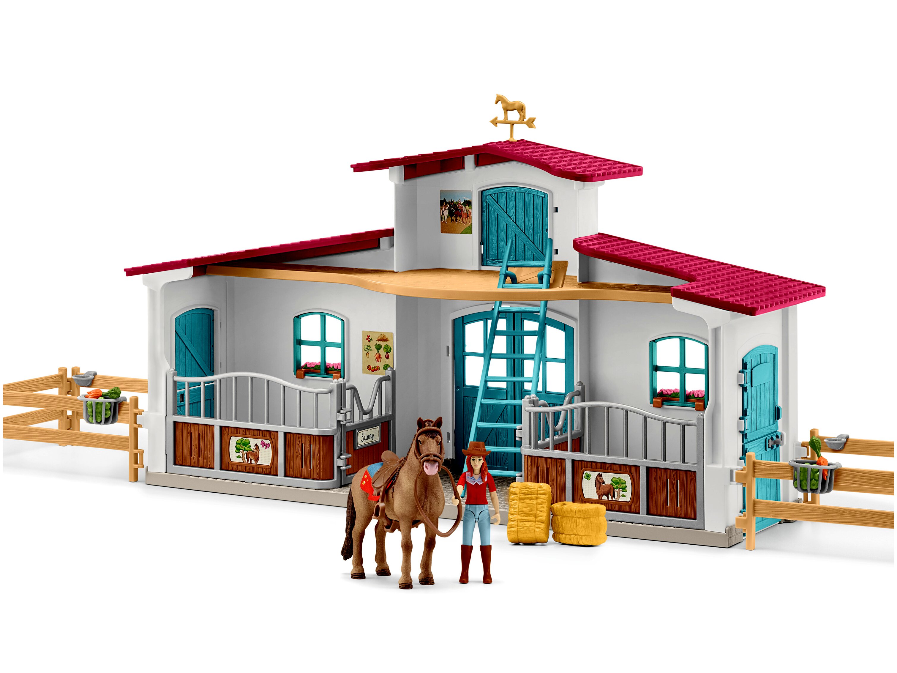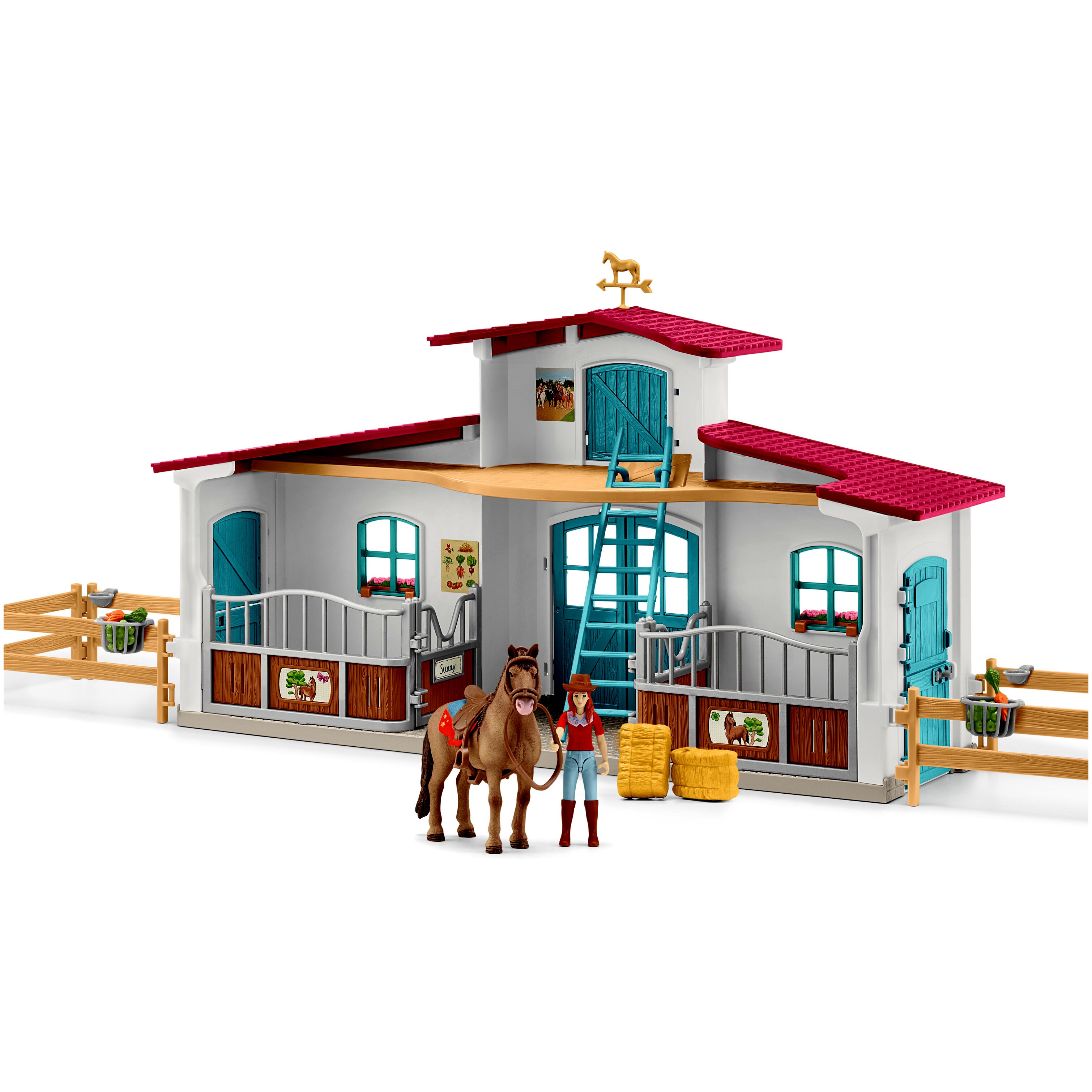 Tartalom: 1 lóistálló és ház, 1 lovas figura, 1 lófigura, 2 szénabála, 1 nyeregtakaró s nyereg, 1 kantár és egyéb kiegészítők. 75 elemet tartalmaz.