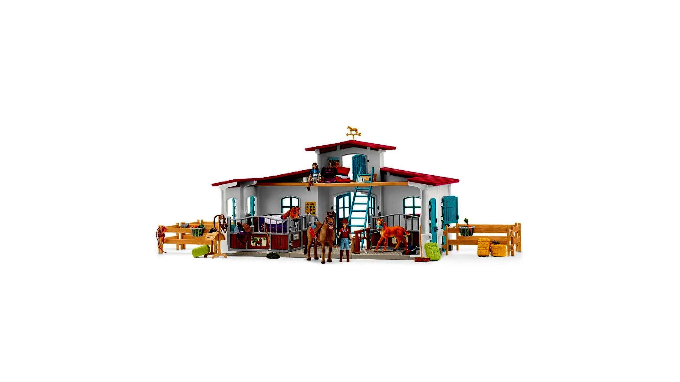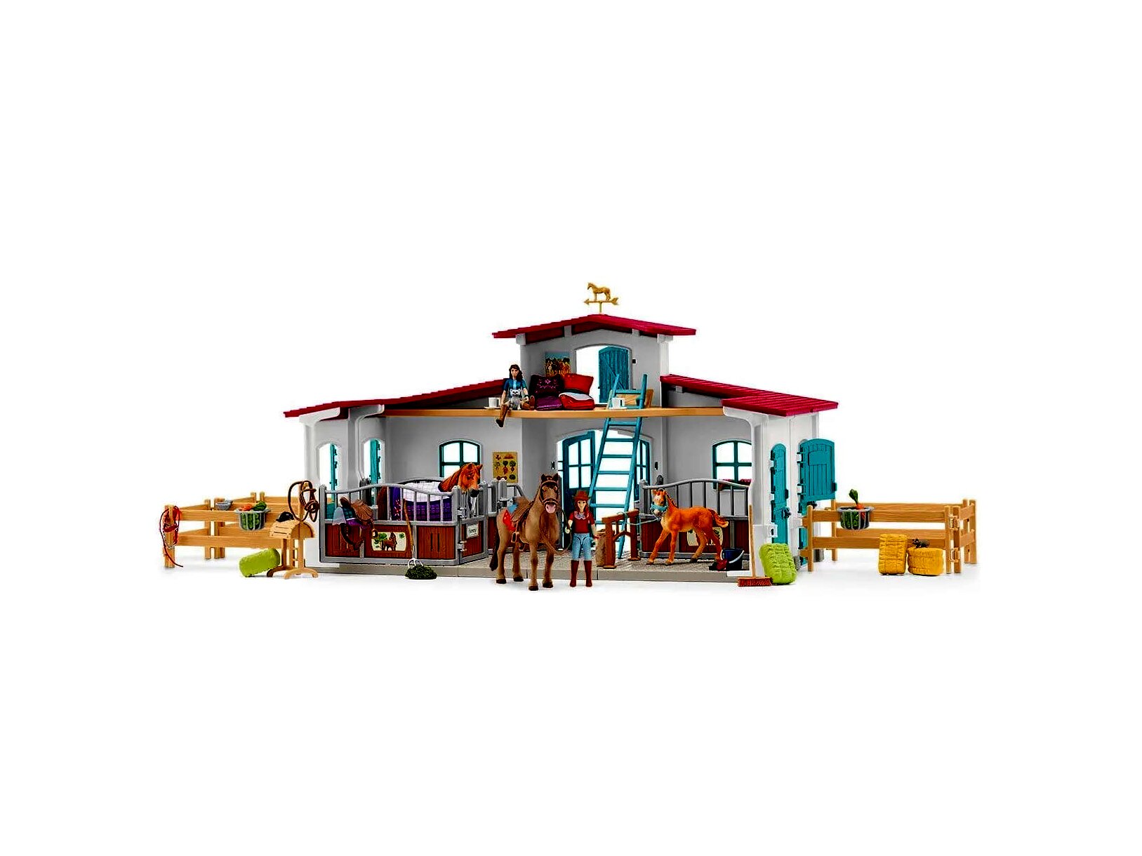 Csomag tartalma: 1 db ház, 3 db istálló, 1 db mosóállomás, 1 db fa ló, 2 db csésze, 2 db tányér, 1 db zabzsák, 2 db lovaglókalap, 2 db szalmabála, 2 db szénabála, 1 db siló, 1 db vödör, 2 db fésű, 2 db alma, 2 db sárgarépa, 1 db macska, 1 db egér, 3 db ló, 1 db vasvilla, 1 db seprű, 2 db nyeregtakaró, 2 db hálózsák, 2 db párna, 1 db cowboy sapka, 2 db teljesen rugalmas figura
