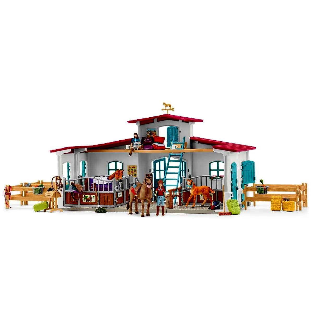 Jó reggelt, álomszuszék! Hasadra süt a nap! A Lakeside Lovasközpont lovasai nemsokára nyeregbe pattannak. Ideje felkelni és elindítani a napot! A létrán lelépkedve, majd az istállókhoz sietve már indulhat is a lovas túra és a gyakorlás. A hosszú és fárasztó nap után pedig a gyerekek betérhetnek lovacskájukkal a Rider Café-ba egy frissen sült almás pitére és egy limonádéra. ( a Rider Café játékszett külön kapható ) A lovasközpont tovább bővíthető a Schleich Horse Club izgalmas készleteivel a további kalandokért.