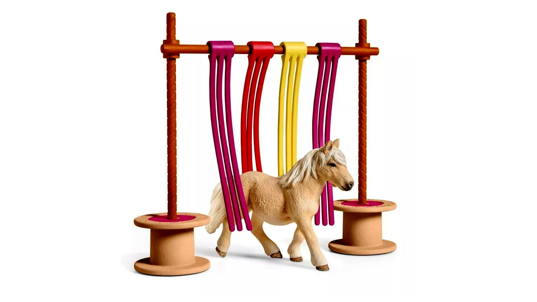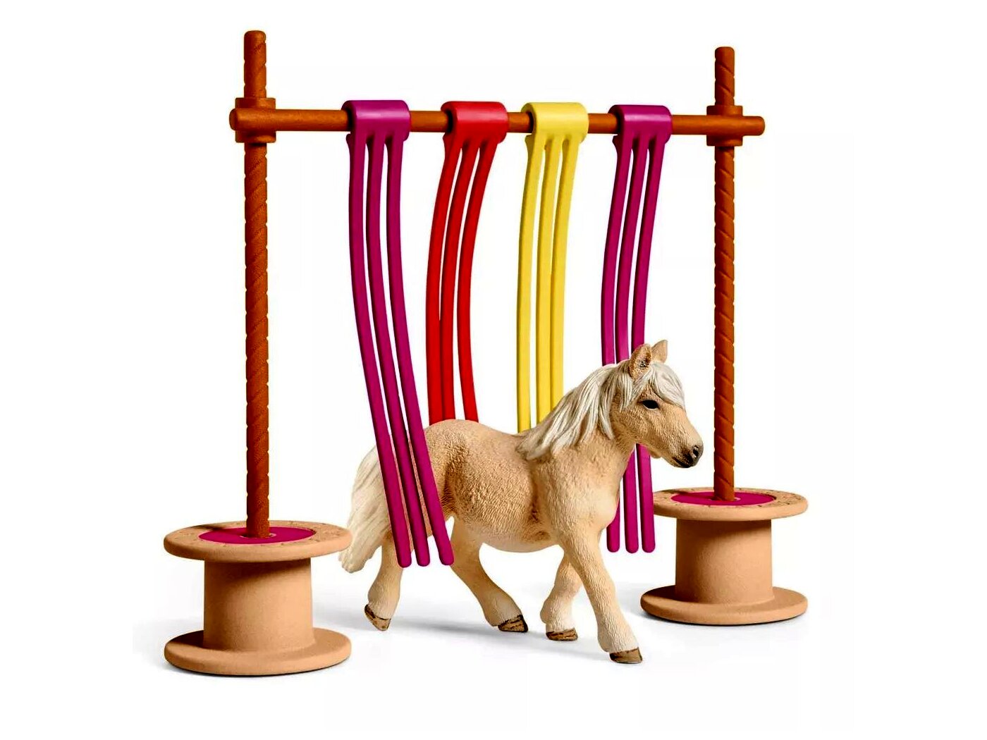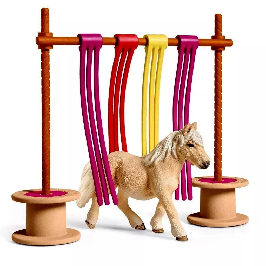 A pónik rajongói tudják, hogy a lovak zászlóktól és szalagoktól való félelmét csak úgy lehet legyőzni, ha erre kiképezik őket. A Schleich szalagfüggöny szettjével a gyerekek "begyakoroltathatják" a szalagfüggönyt igénybe vevő trükköket a csomagban rejlő igényesen kidolgozott póni figurával. A játék során fejlődik a gyerekek képzelete, fantáziája és kommunikációs készsége.