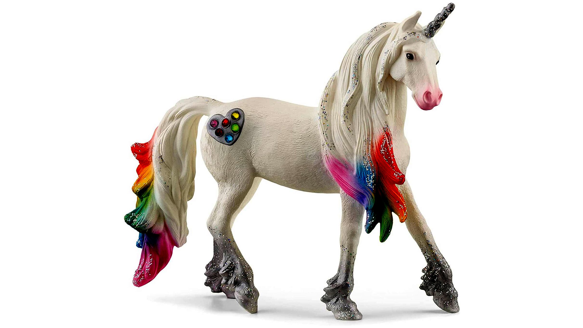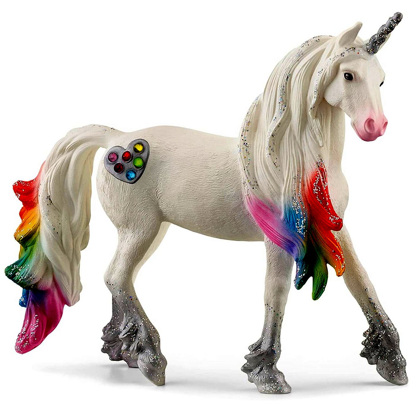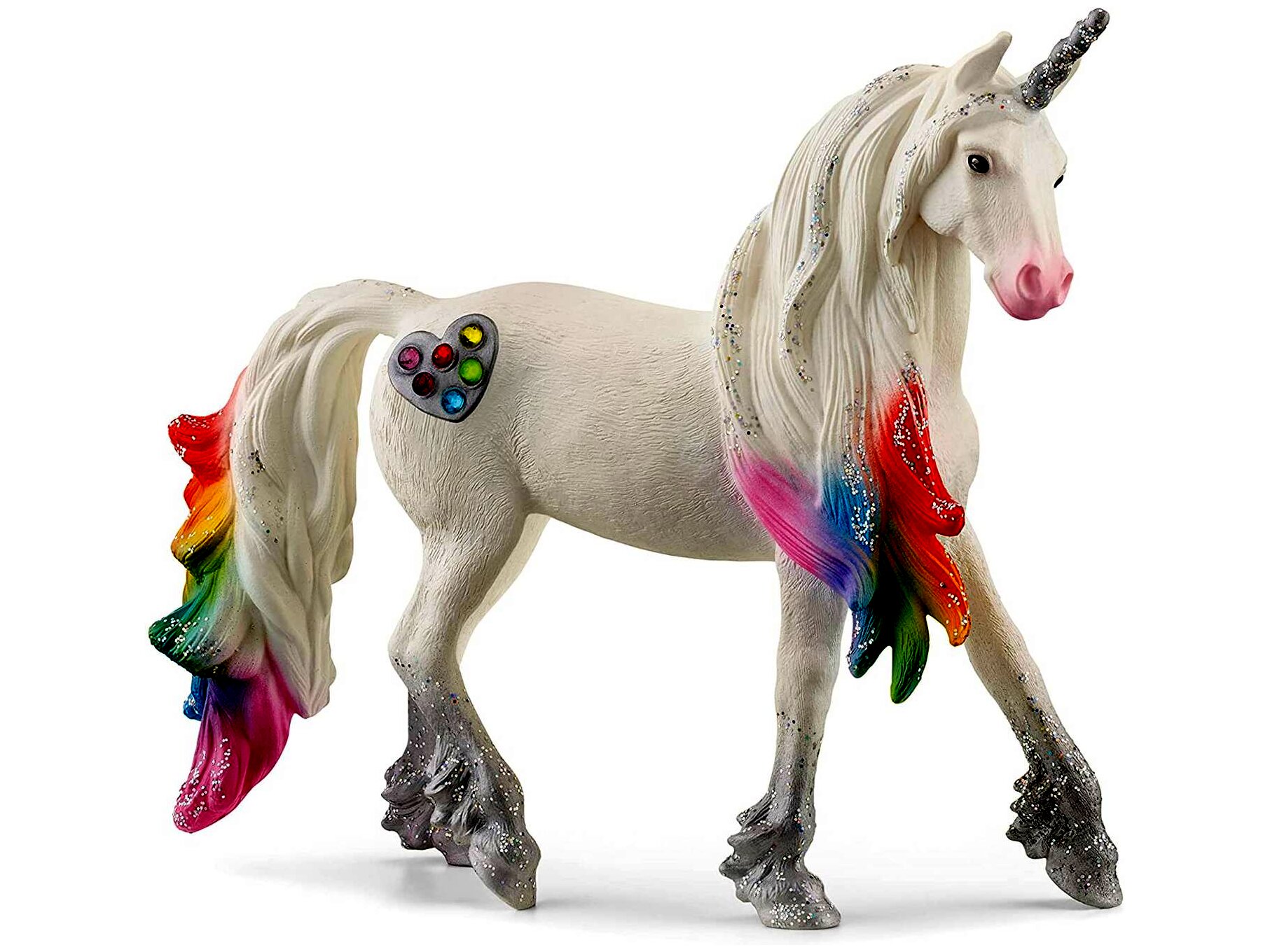 A kézzel festett, részletgazdag Schleich unikornis figura varázslatossá teszi a játékot. Hófehér szőre, csillámos, szivárványszínben pompázó sörénye és farka varázslatos megjelenést kölcsönöz ennek az unikornisnak, amit csillogó szarva még különlegesebbé tesz.