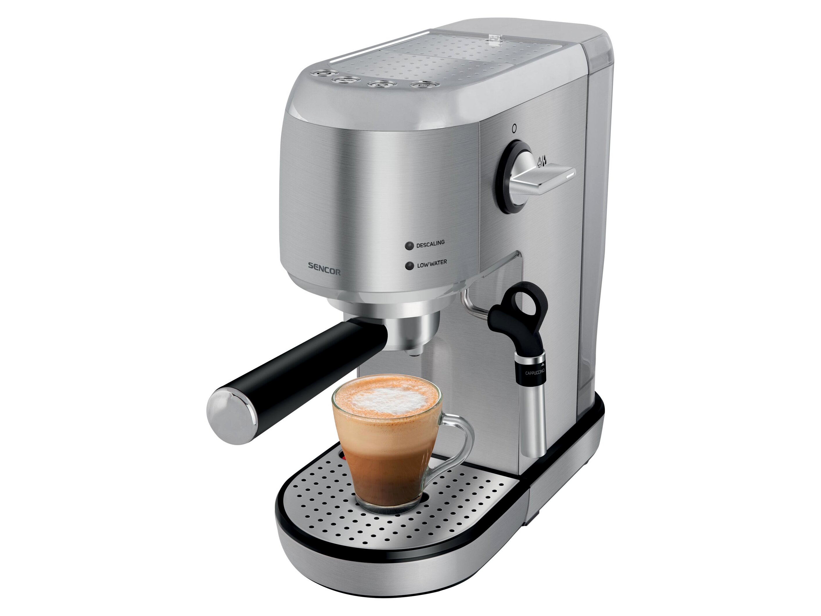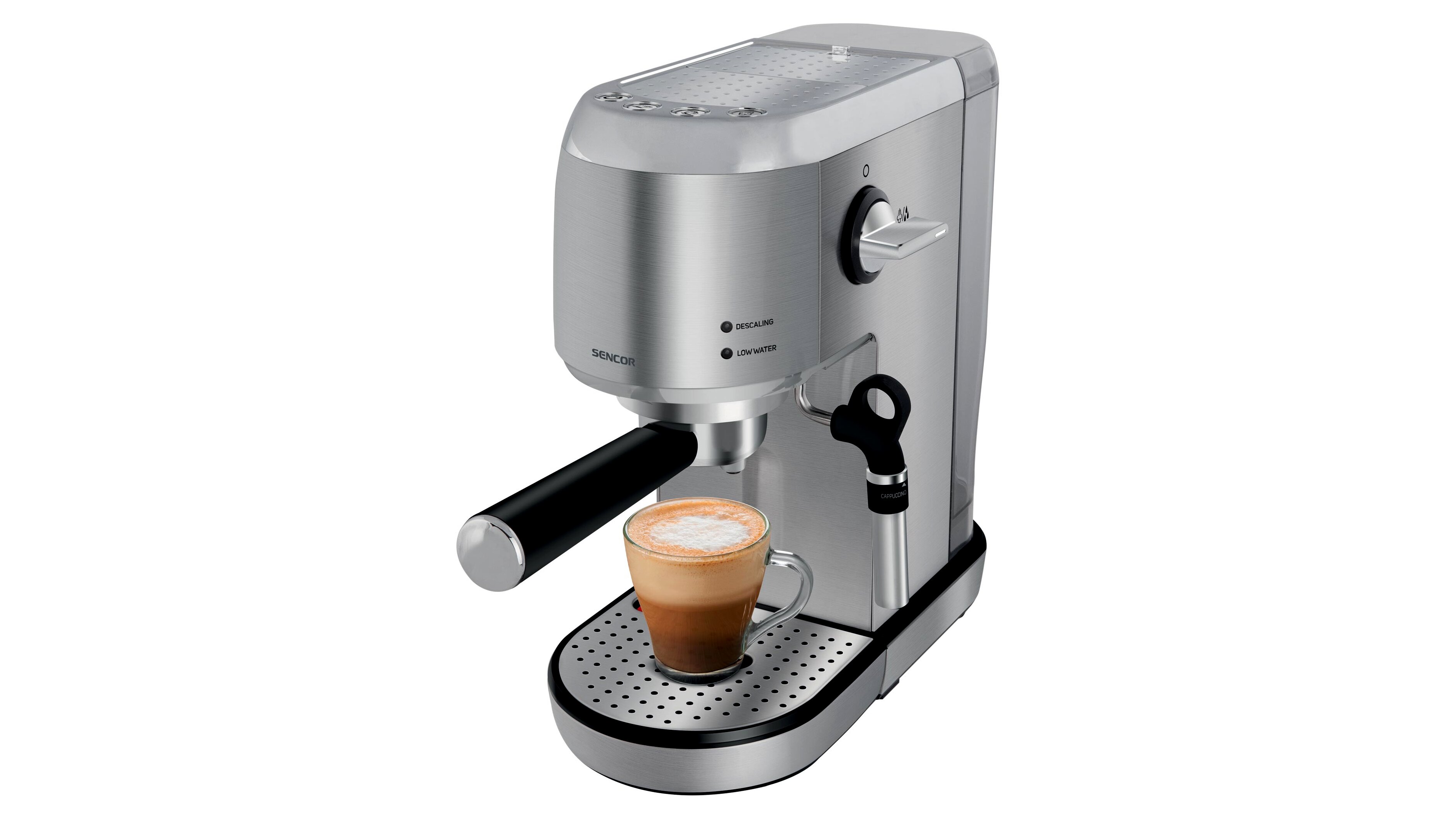 A Sencor SES 4900SS egy karos eszpresszókávéfőző, amellyel gyorsan készíthetsz eszpresszót vagy hosszú kávét, a beépített, forgatható gőzkarral pedig tejhabos italok (például cappuccino, latte) is egyszerűen elkészíthetők. Rozsdamentes hatású, ezüst kivitele otthoni konyhában és irodai környezetben is jól mutat.