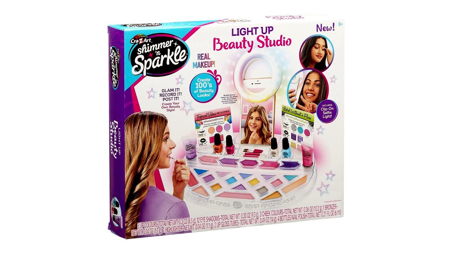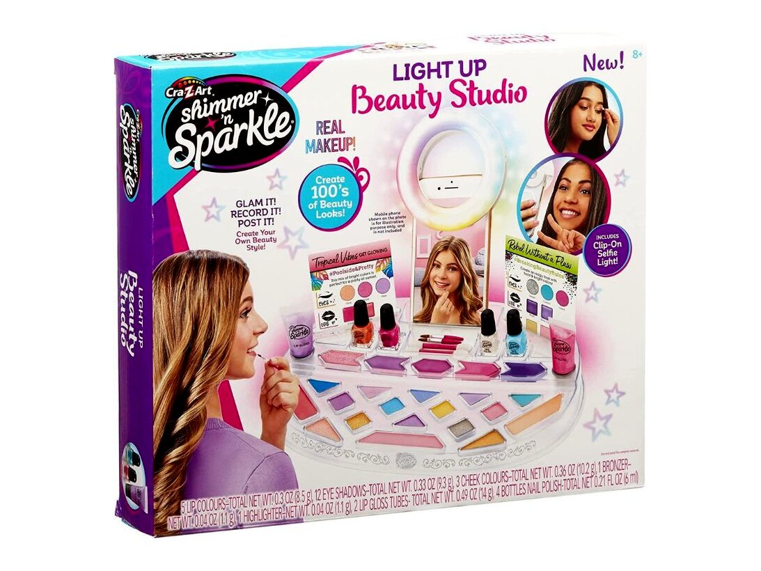 A Cra-Z-Art Shimmer 'n Sparkle szépségstúdiójával a lányok saját szépségsztorijuk sztárjaivá válhatnak. A készlet 12 gyönyörű szemhéjfestéket, 7 csilli-villi szájfestéket, 3 pirosító színt és 2 kontúrszínt, körömlakkokat, na meg persze a felvitelhez szükséges eszközöket tartalmazza.Ha elkészült az egyedi, csillogó smink, a végeredmény lefotózásában a készlethez tartozó mini körlámpa lesz a gyerekek segítségére. Csak rá kell erősíteni a lámpát a csiptető segítségével a telefonra, beállítani a fényerőt, és már készülhetnek is a profibbnál profibb fotók.